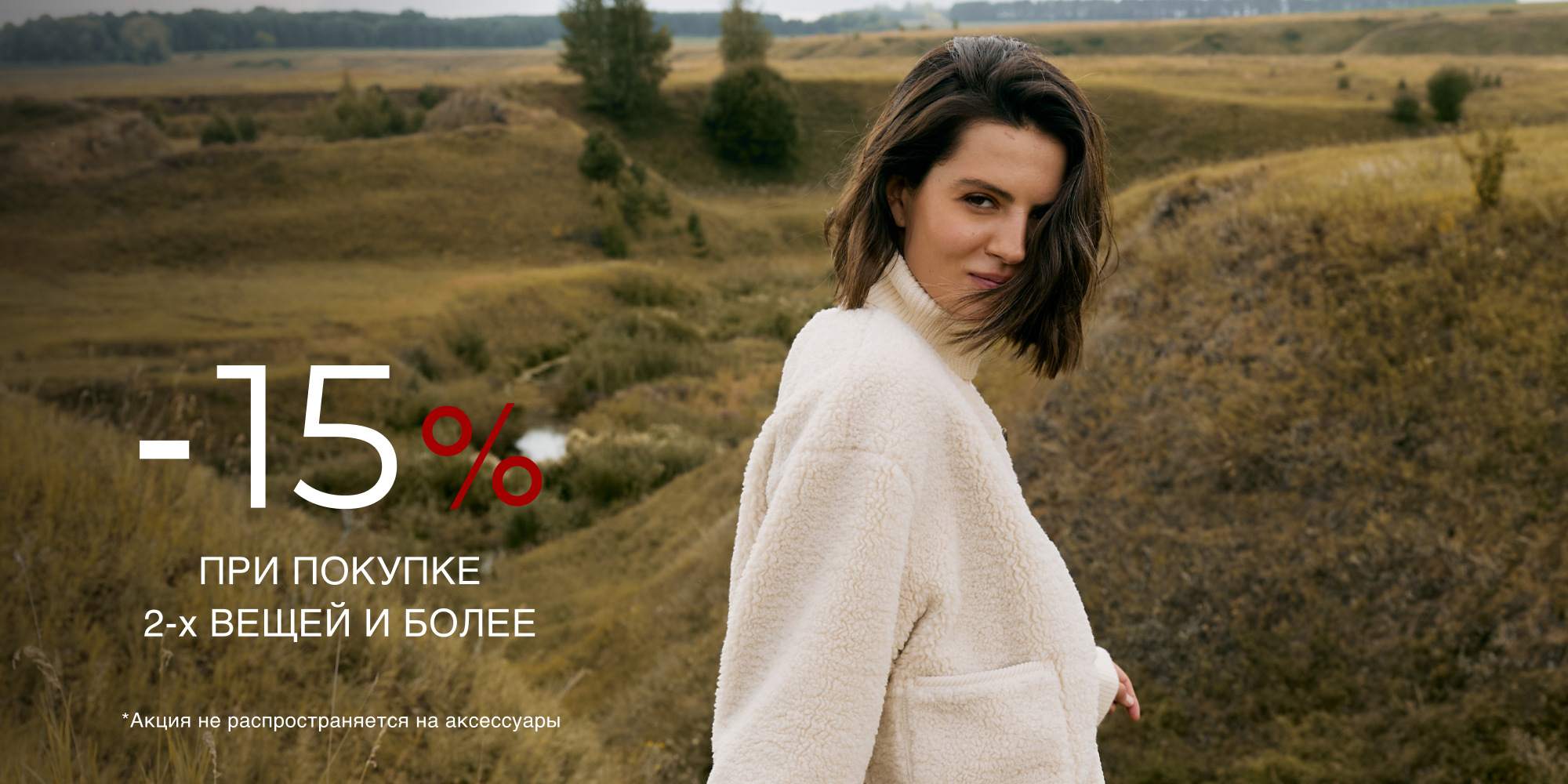 Скидка 15% распространяется на широкий выбор одежды и обуви из новой коллекции, за исключением аксессуаров.