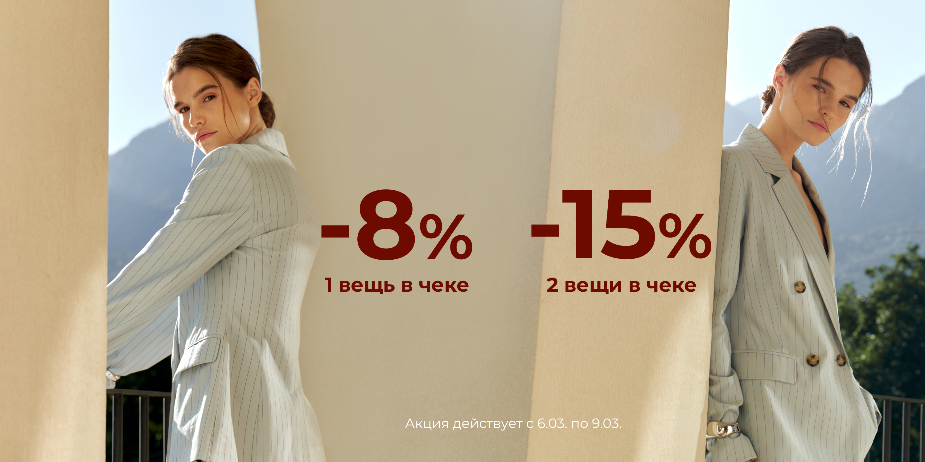 С 6 по 9 марта включительно, будет действовать эксклюзивное предложение на новую коллекцию: -8% на 1 вещь в корзине, -15% на две и более позиции*.
