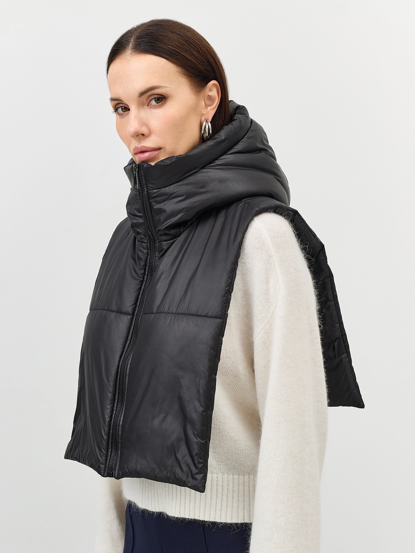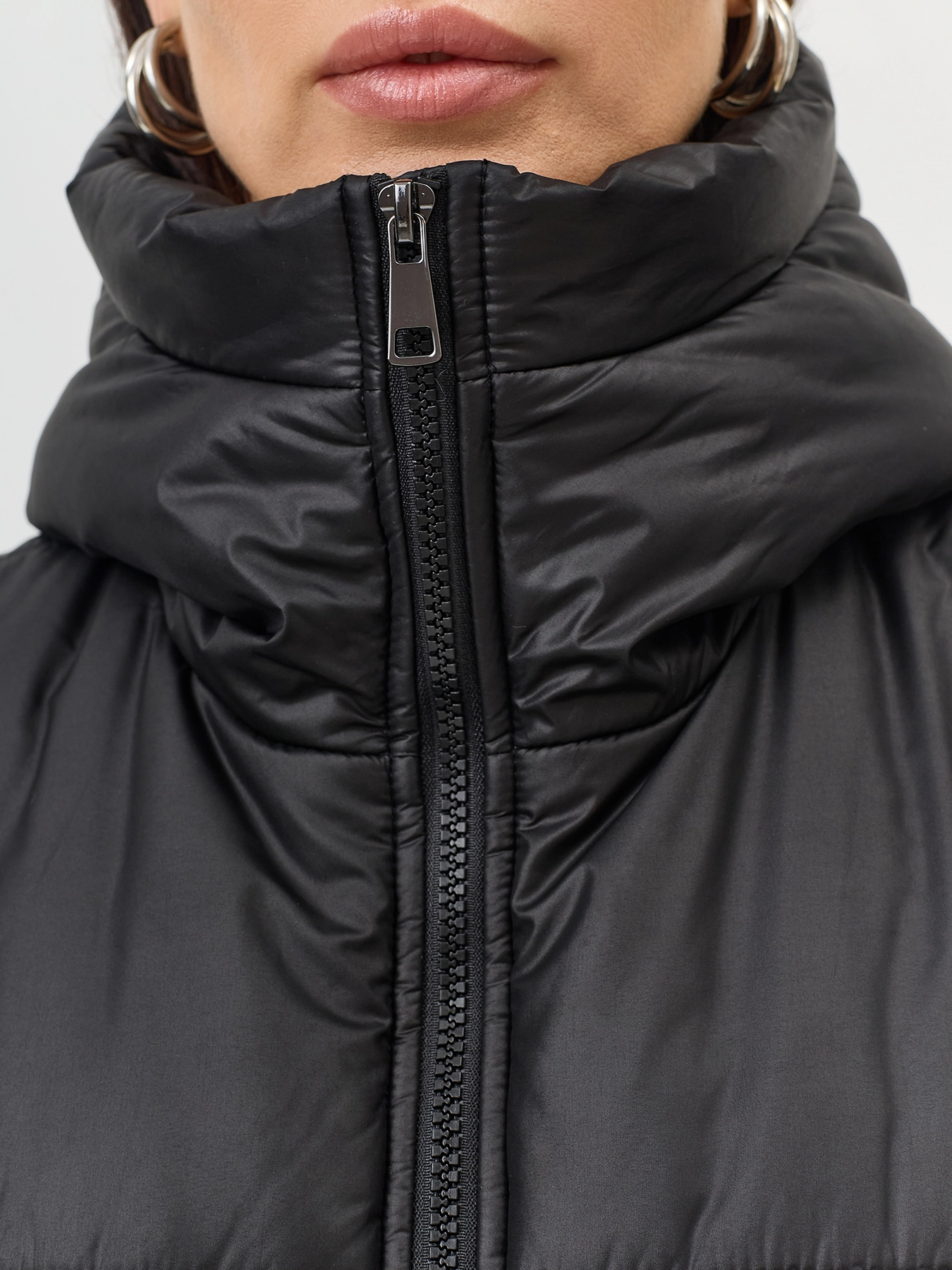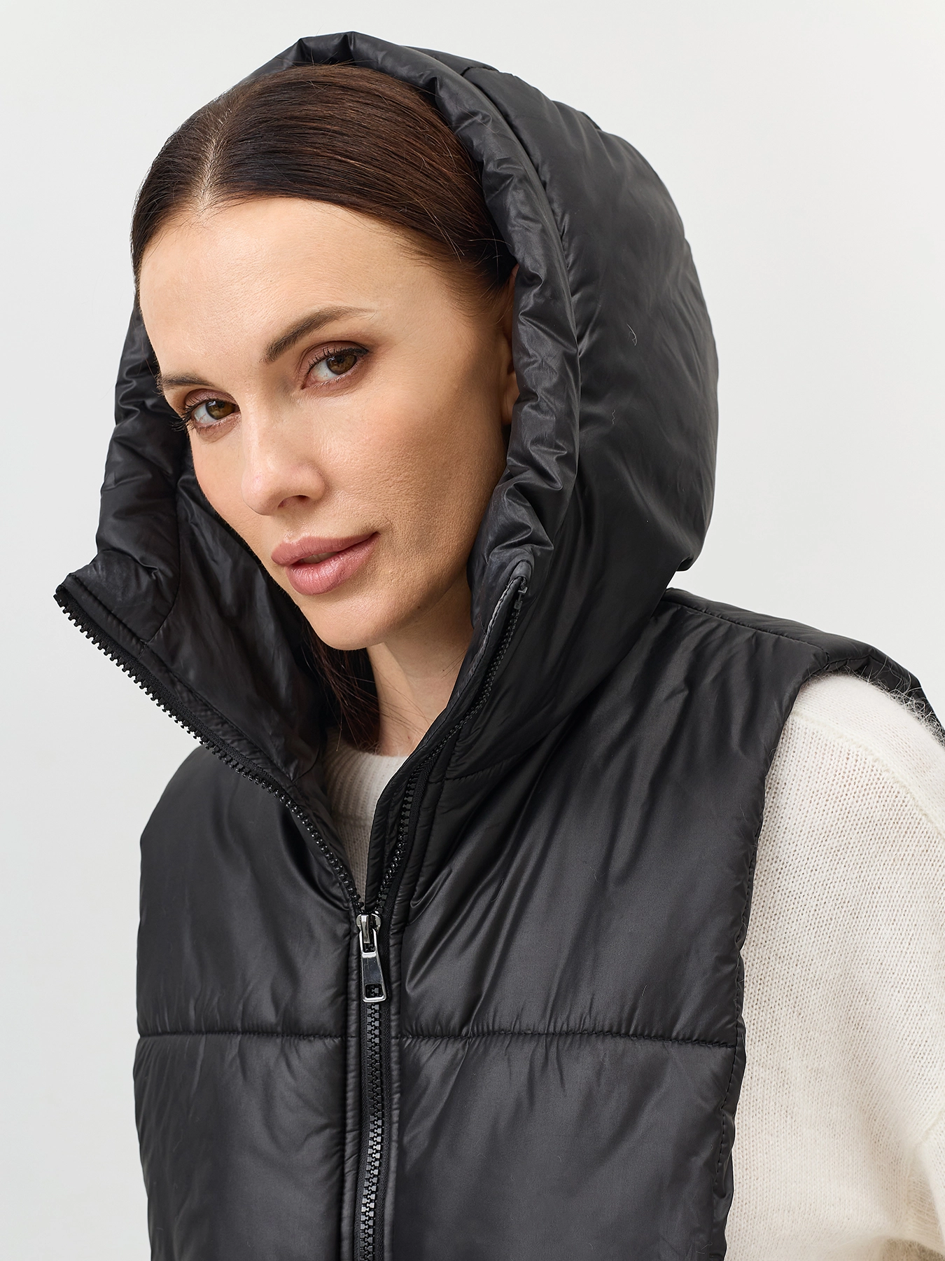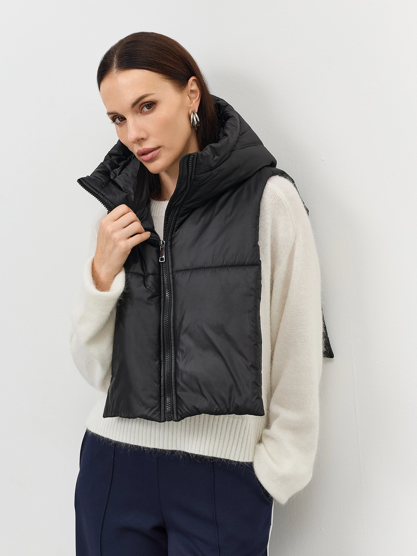Базовая манишка прямого силуэта. Воротник стойка дополнен капюшоном. Застежка на молнию.