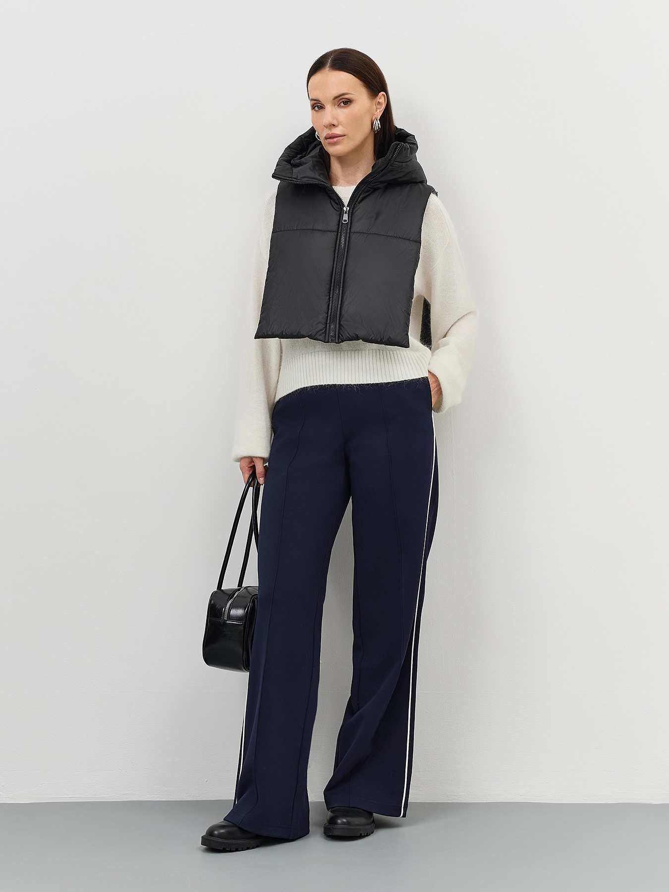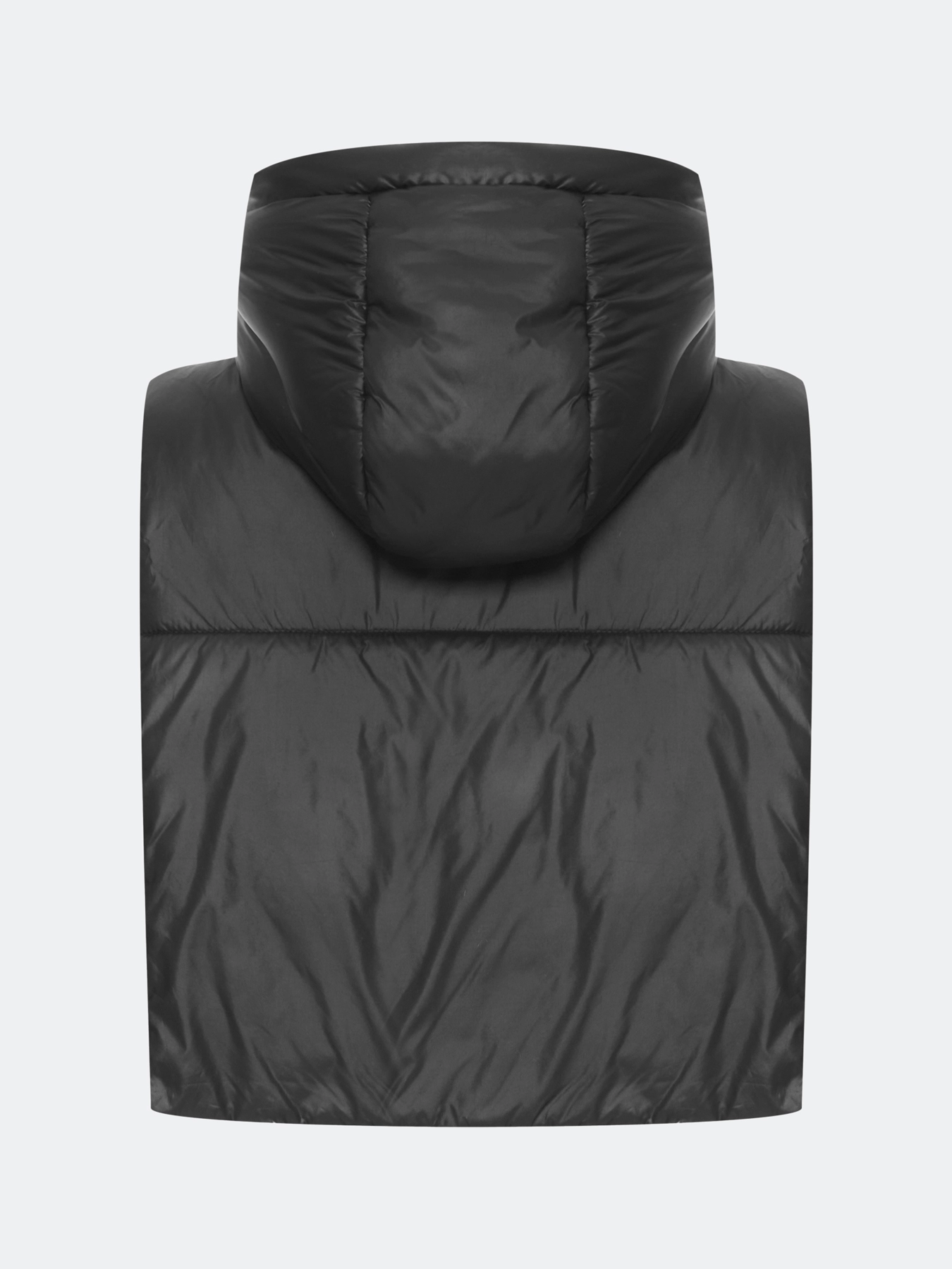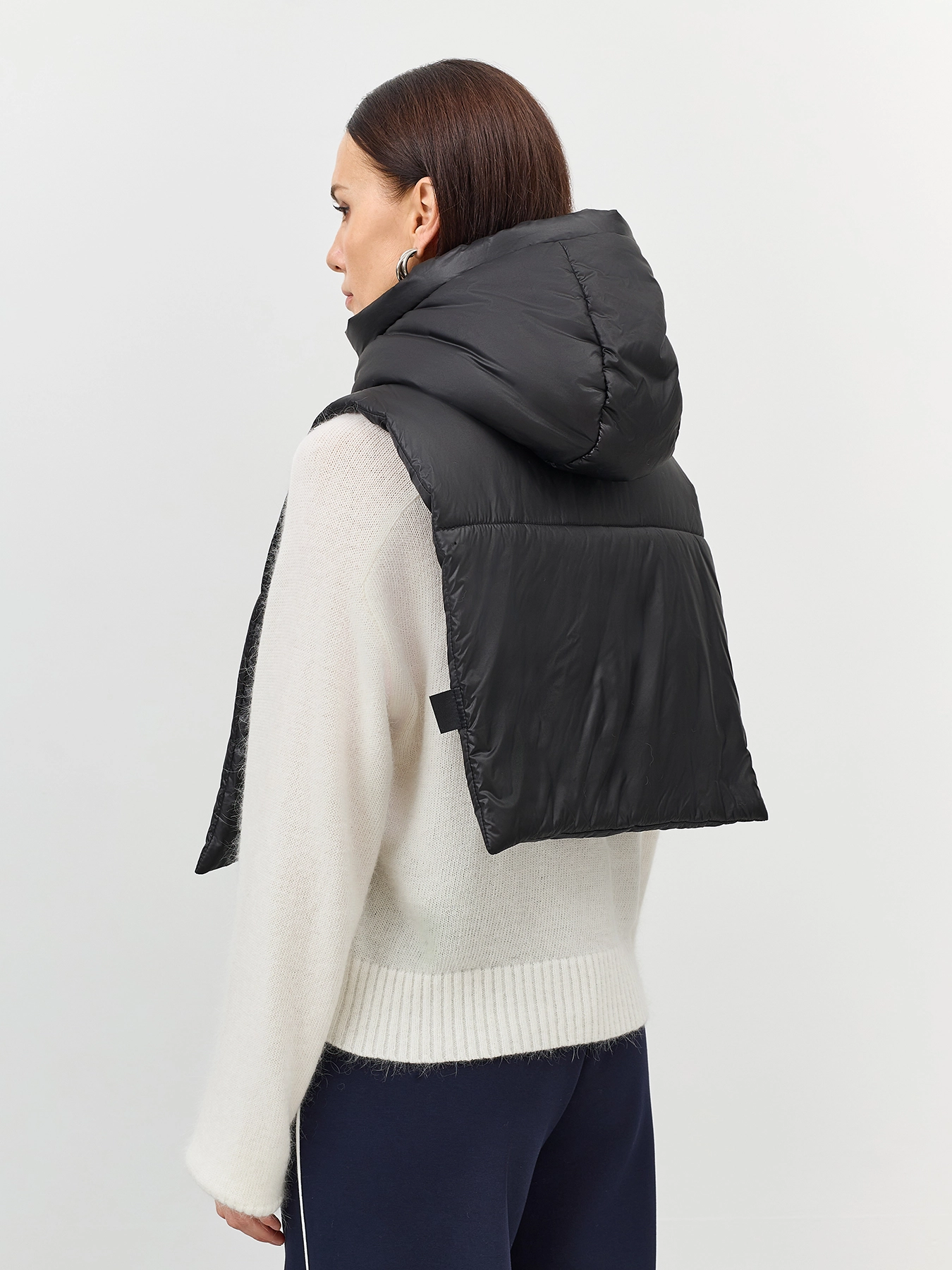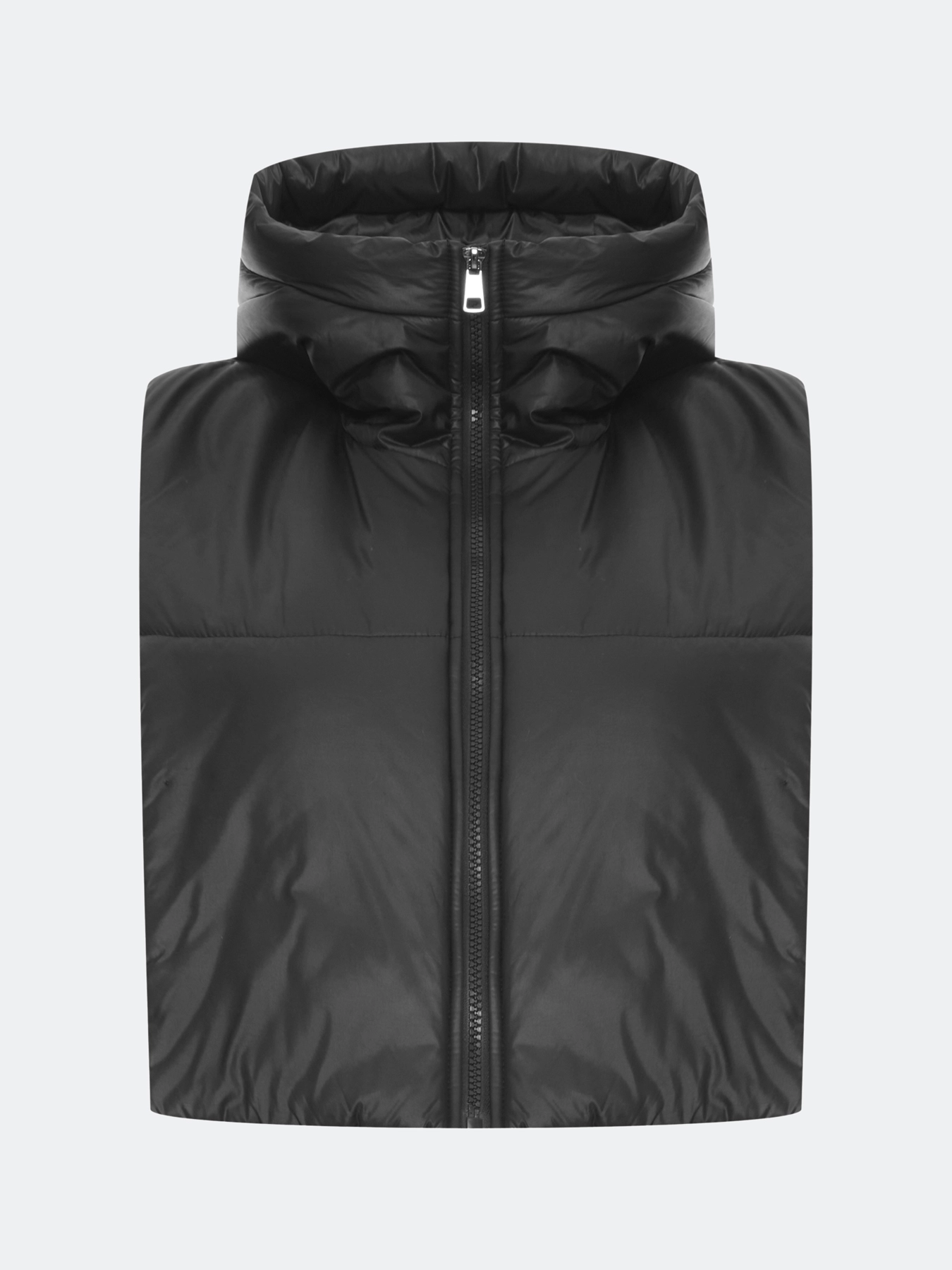 Базовая манишка прямого силуэта. Воротник стойка дополнен капюшоном. Застежка на молнию.