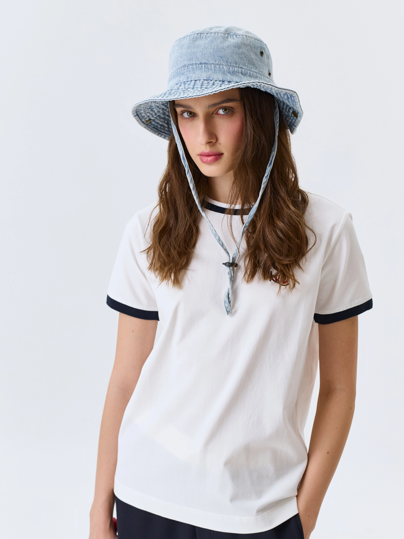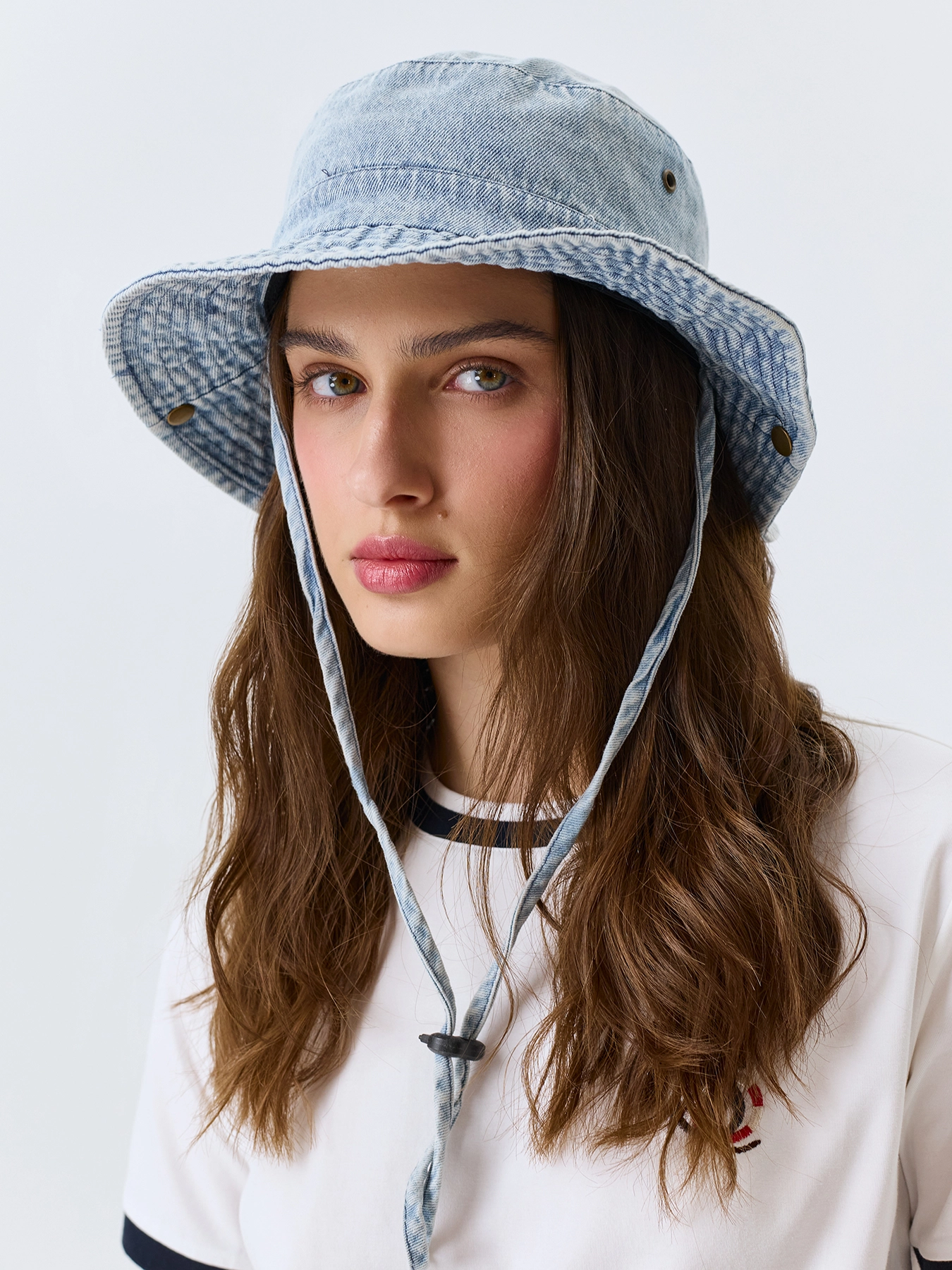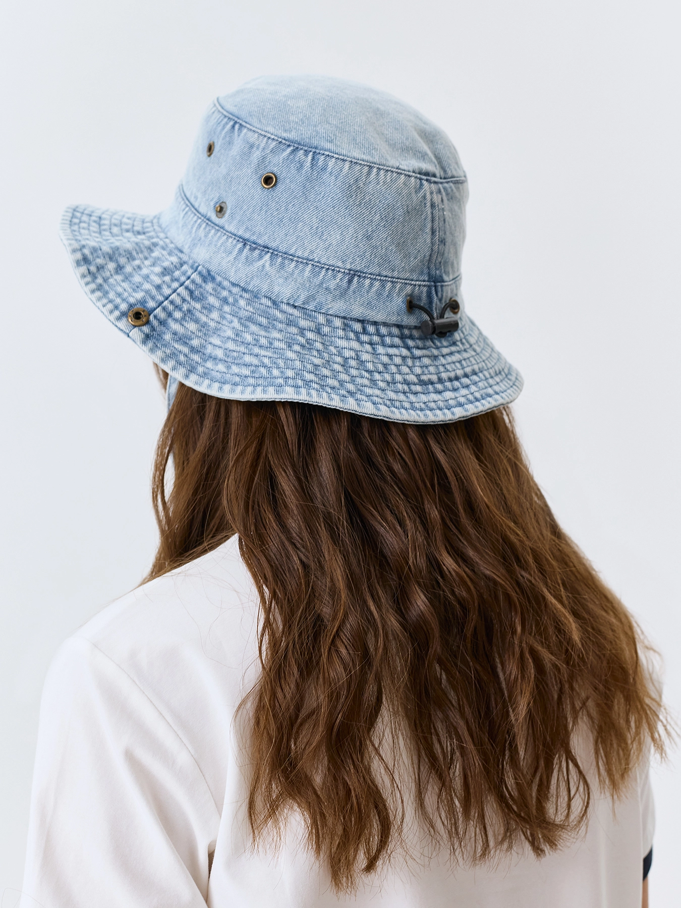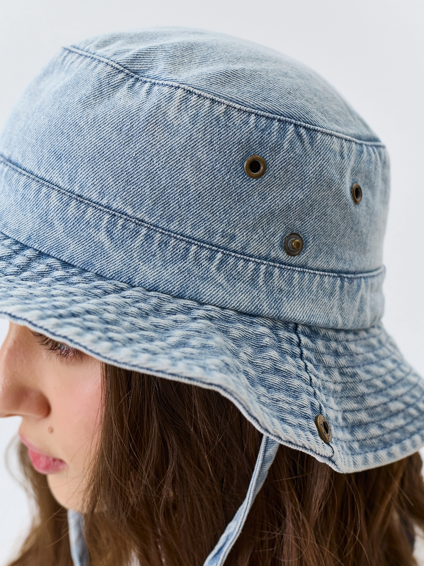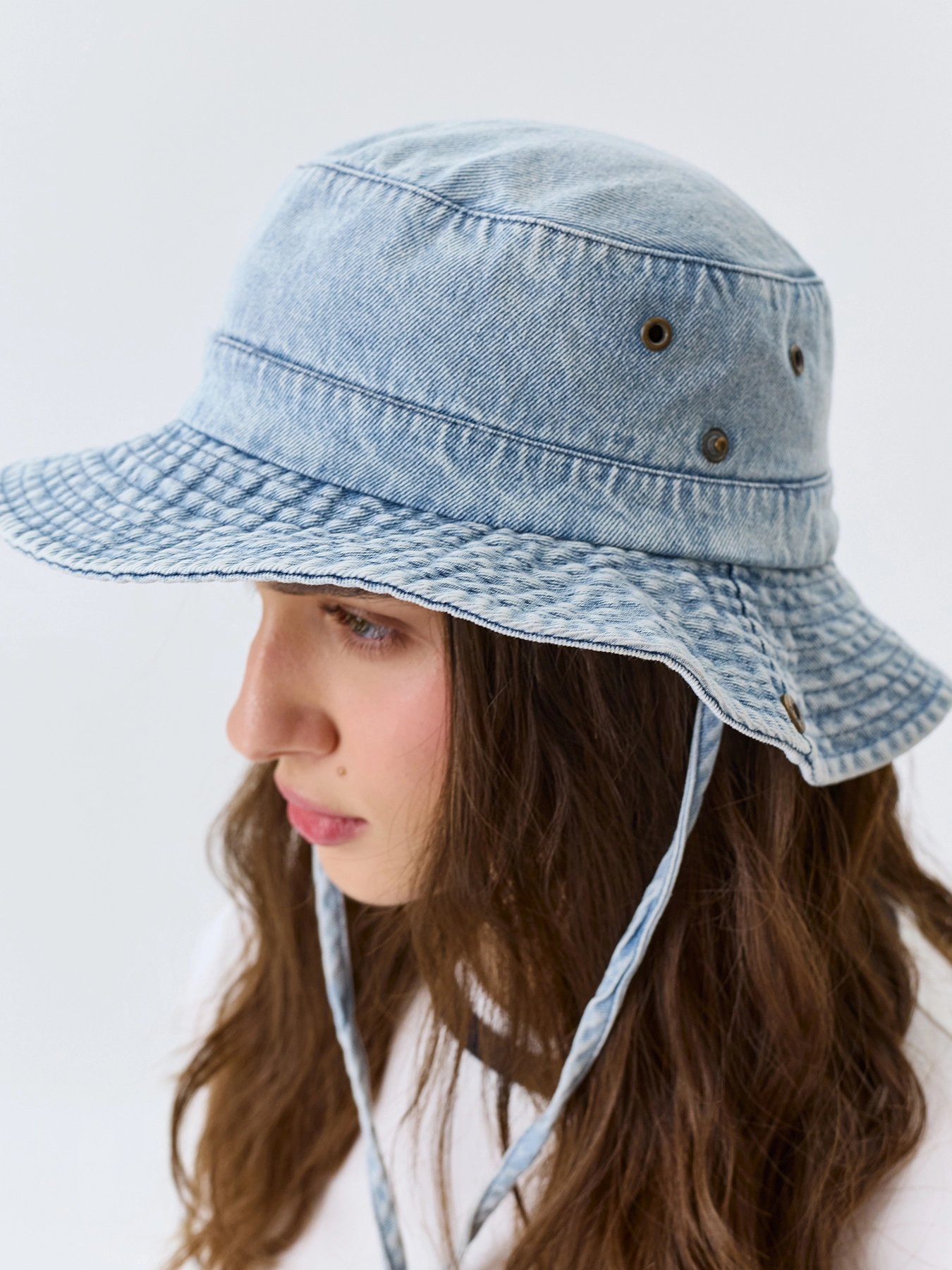 Панама из денима с деликатной варкой в стиле "сафари". Широкие поля можно закрепить на стенках шляпы с помощью металлических кнопок. Регулируется с помощью упругой резинки в основании. Задняя часть с регулировкой на утяжник.