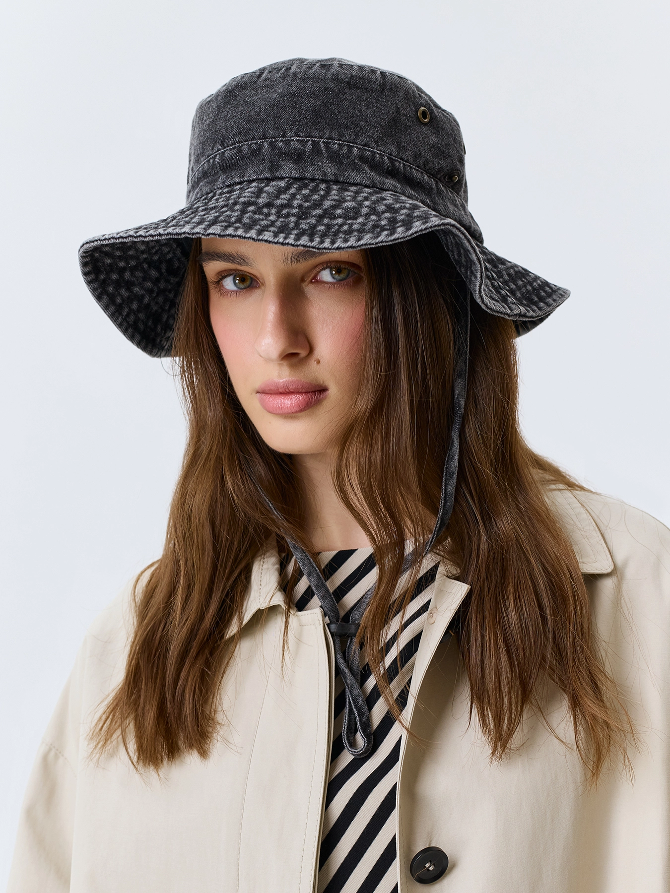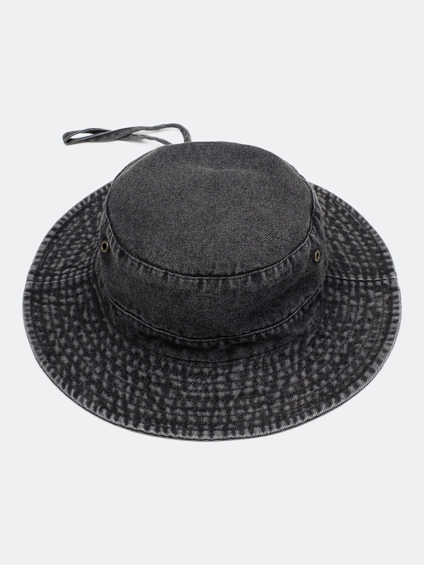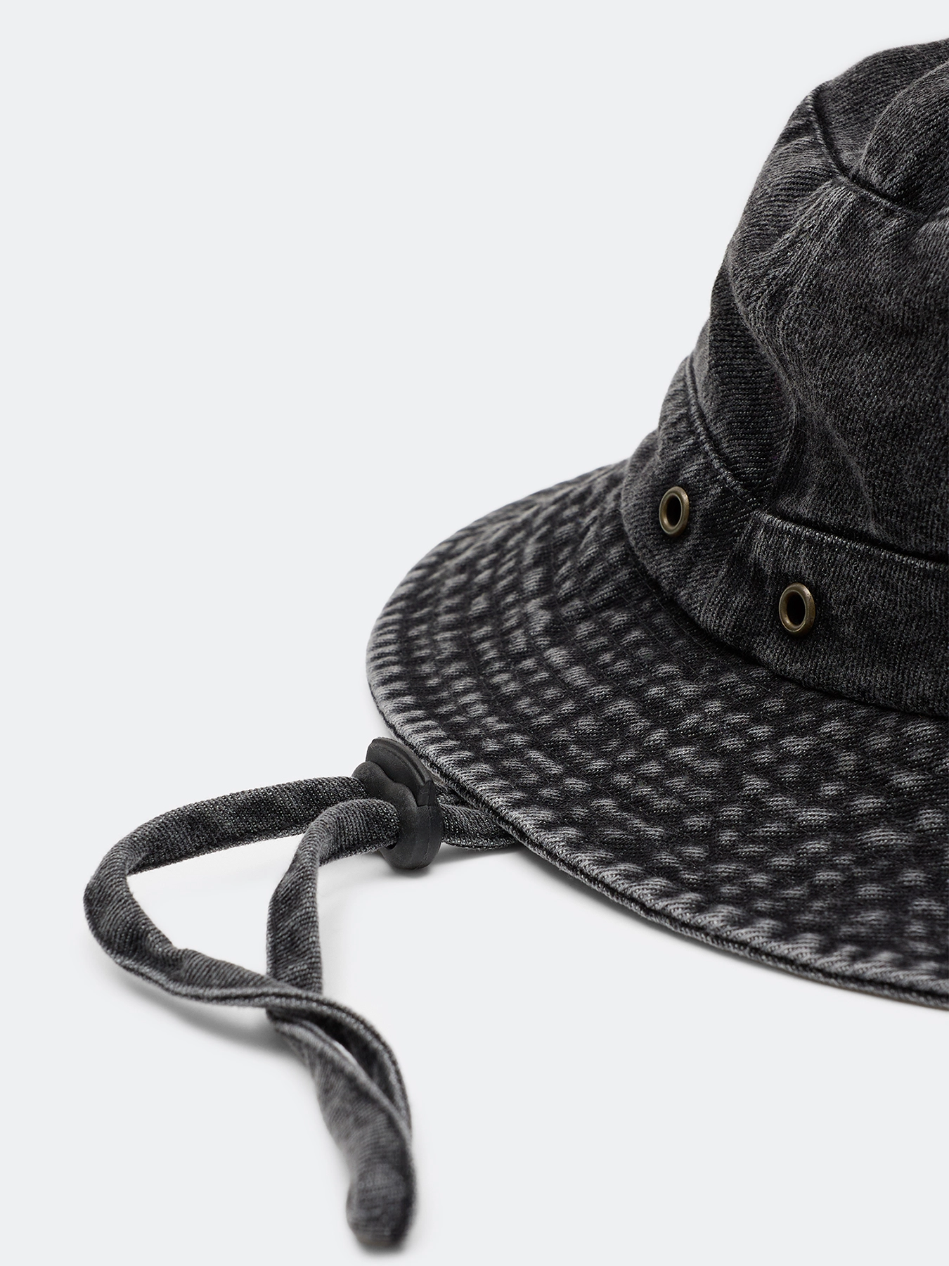 Панама из денима с деликатной варкой в стиле "сафари". Широкие поля можно закрепить на стенках шляпы с помощью металлических кнопок. Регулируется с помощью упругой резинки в основании. Задняя часть с регулировкой на утяжник.