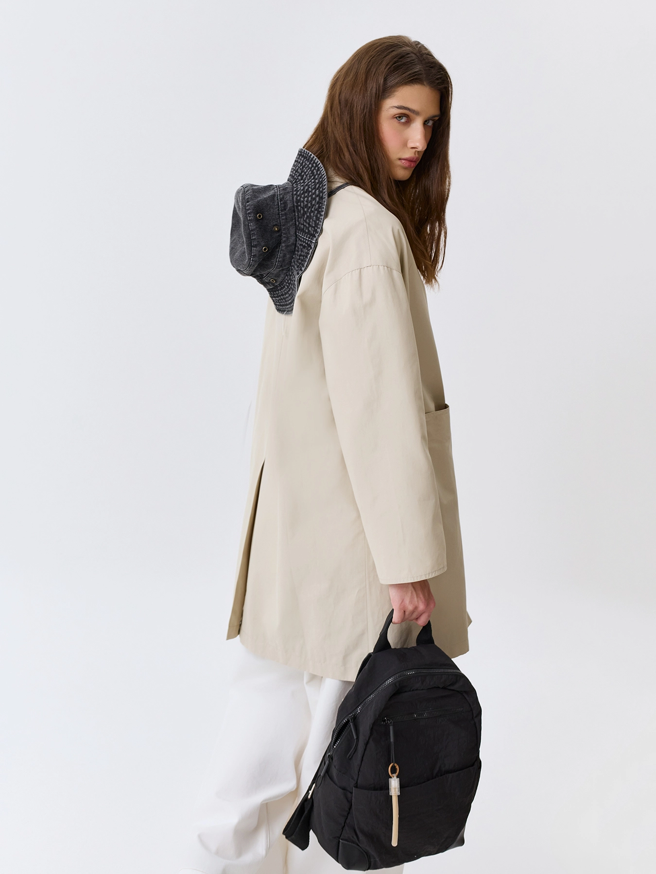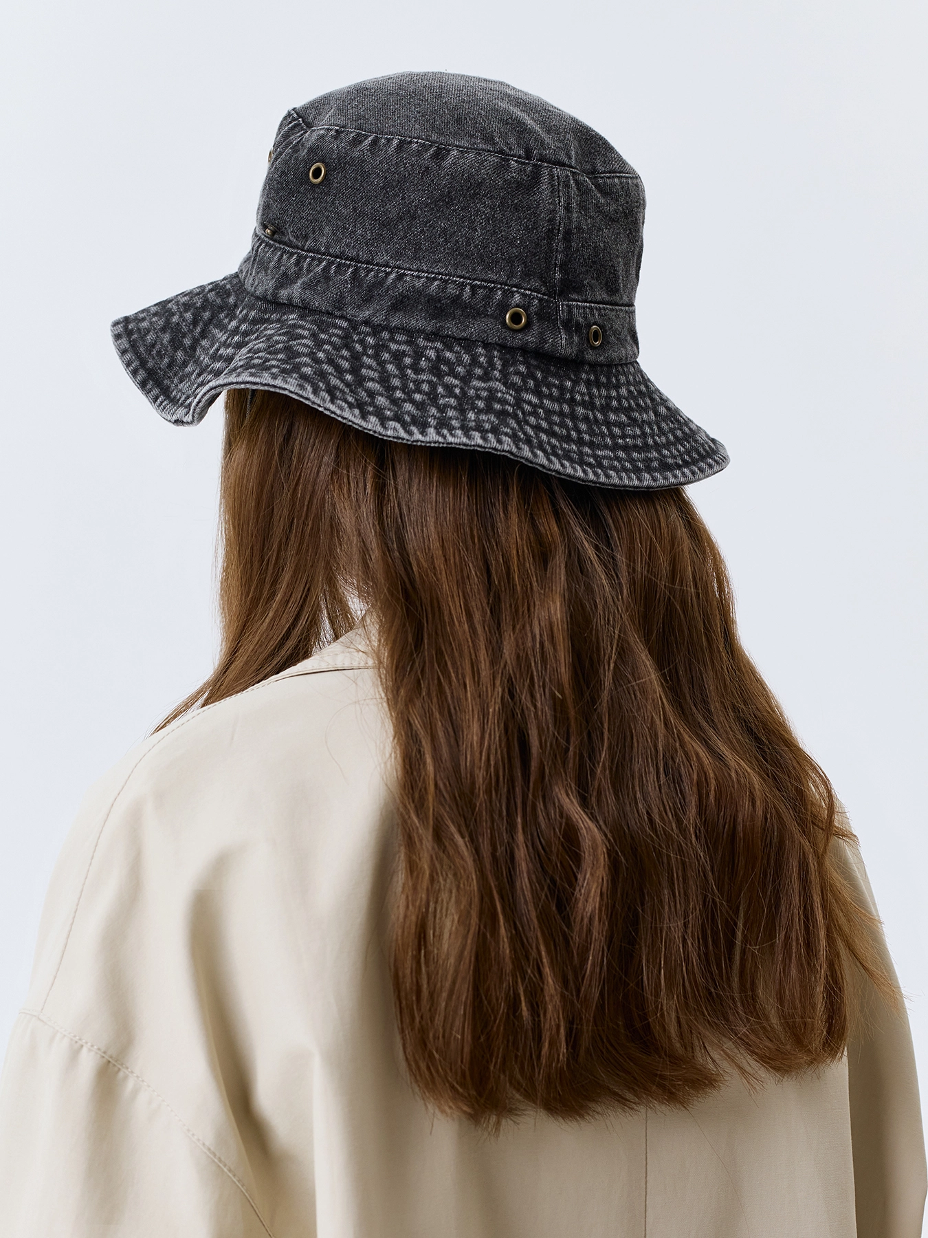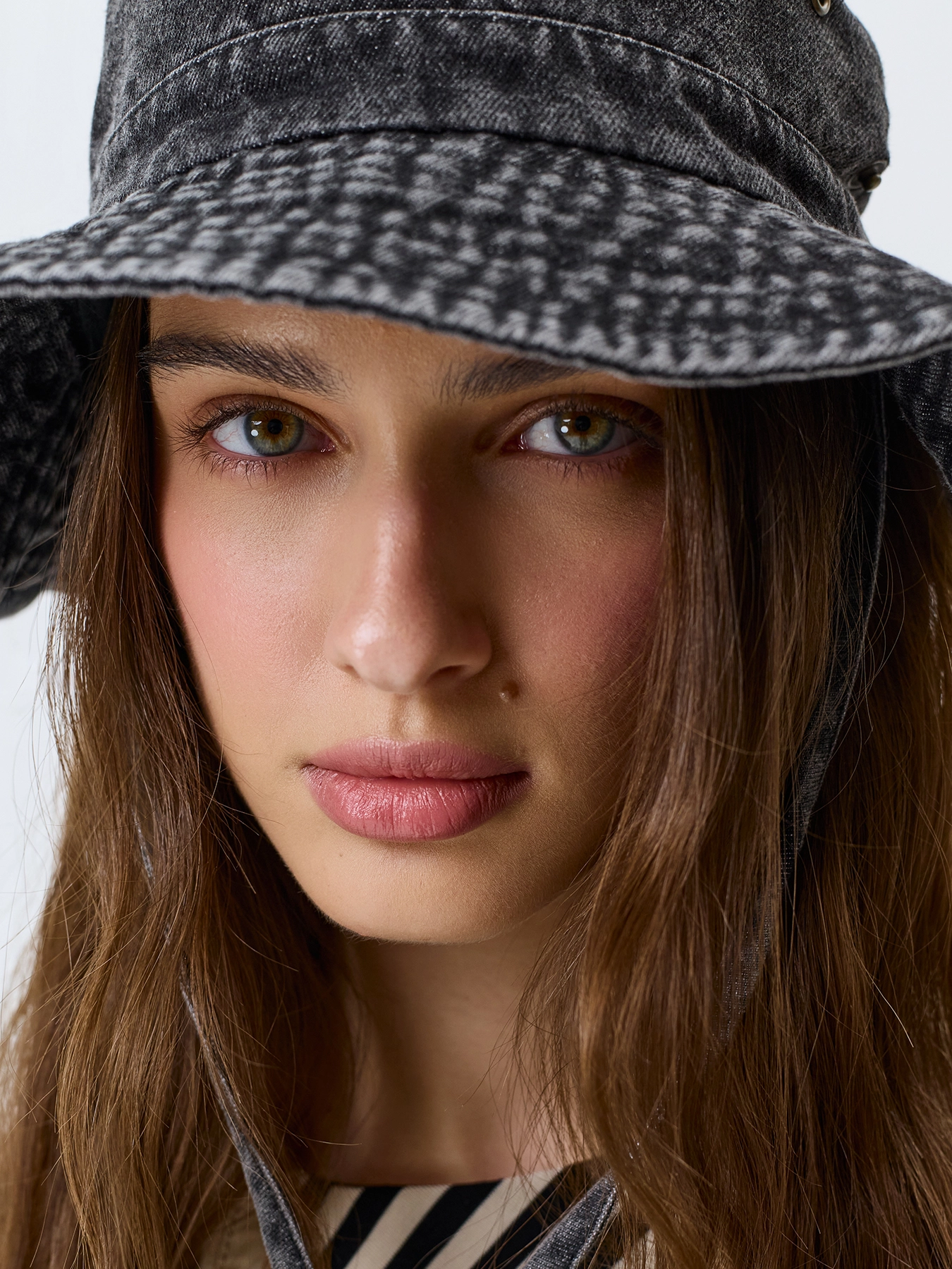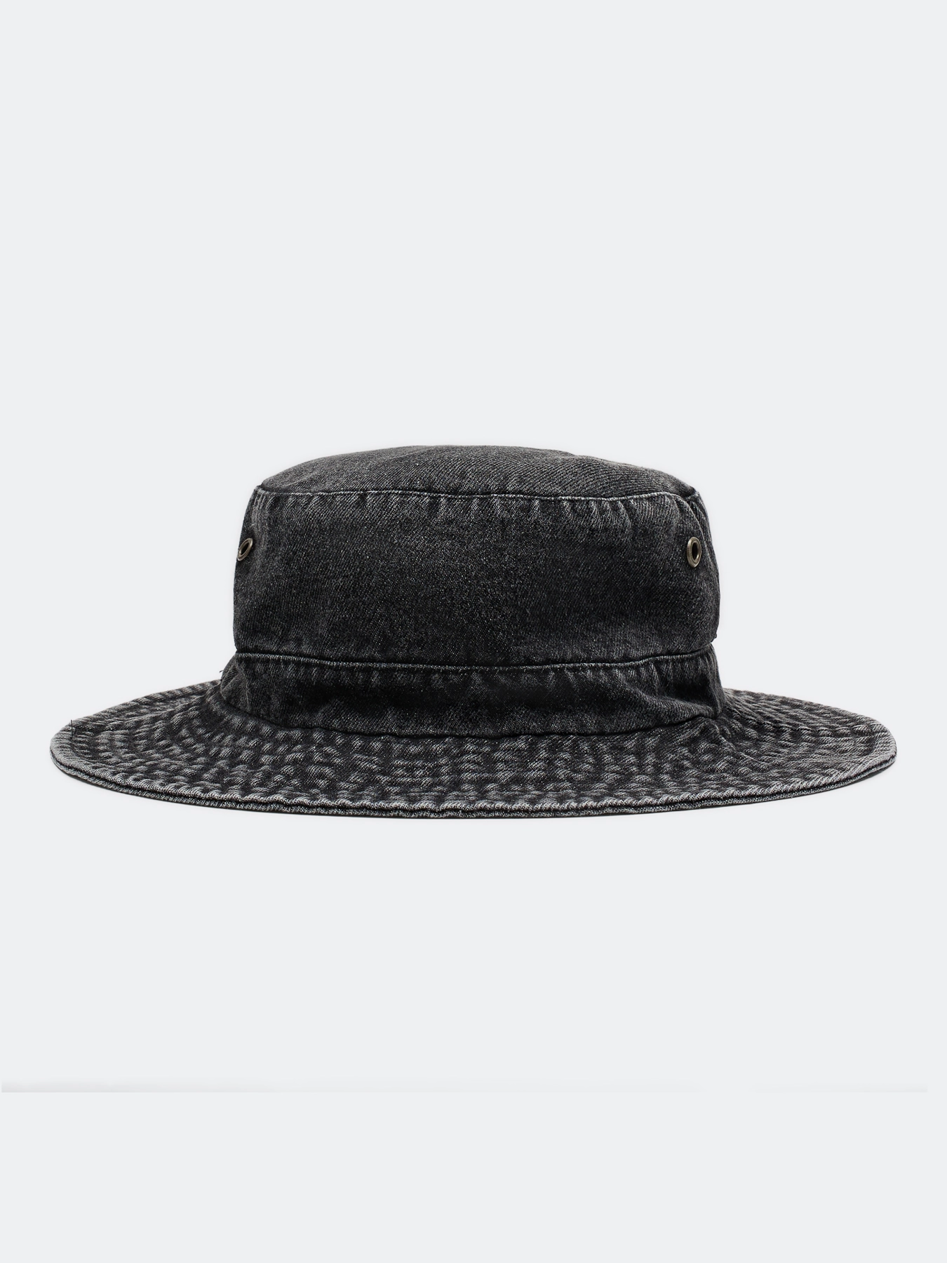 Панама из денима с деликатной варкой в стиле "сафари". Широкие поля можно закрепить на стенках шляпы с помощью металлических кнопок. Регулируется с помощью упругой резинки в основании. Задняя часть с регулировкой на утяжник.