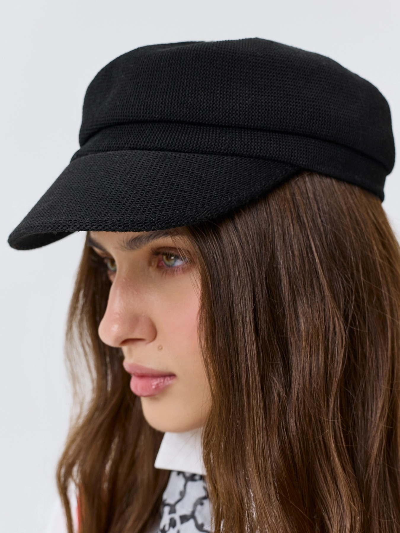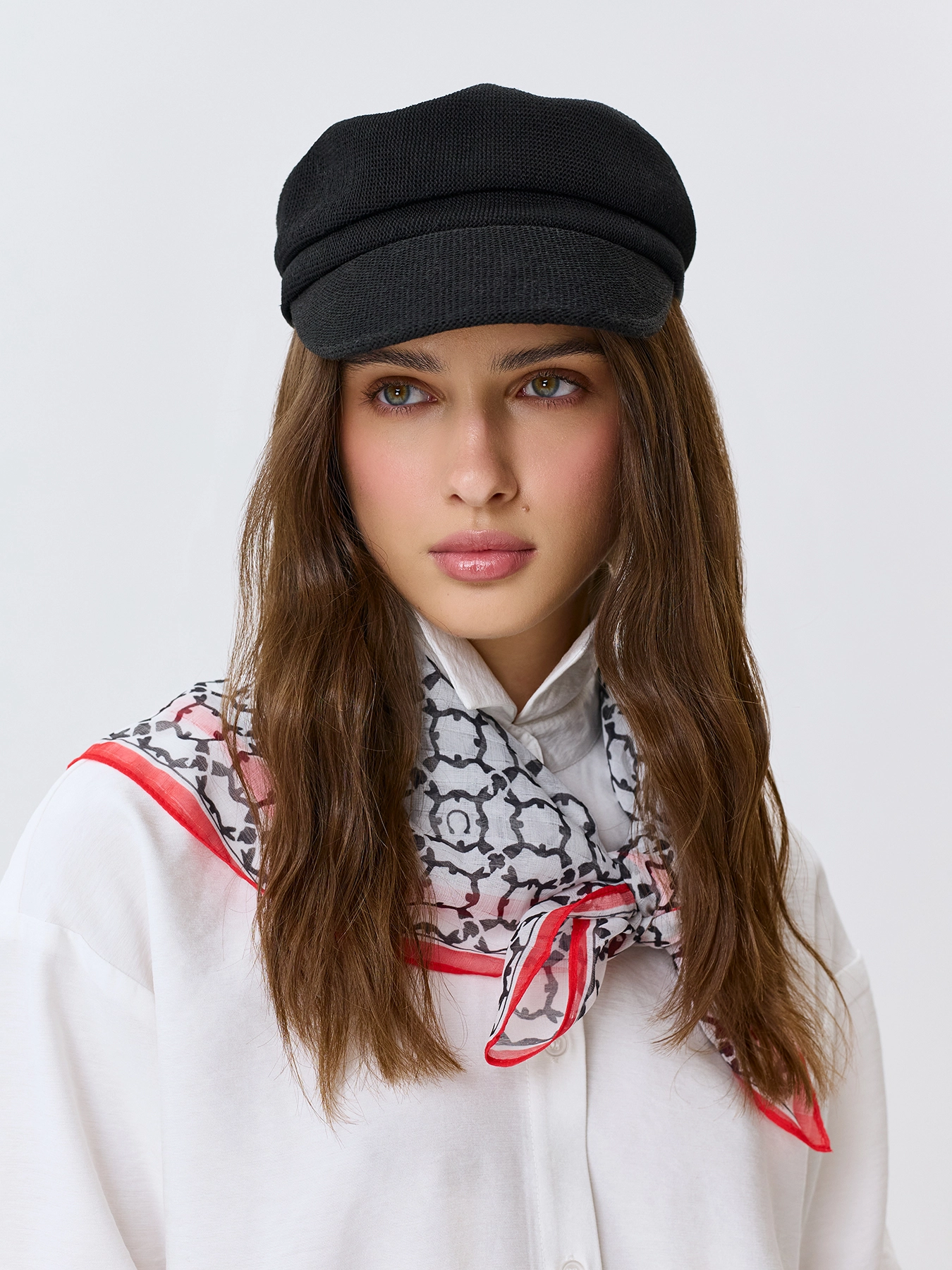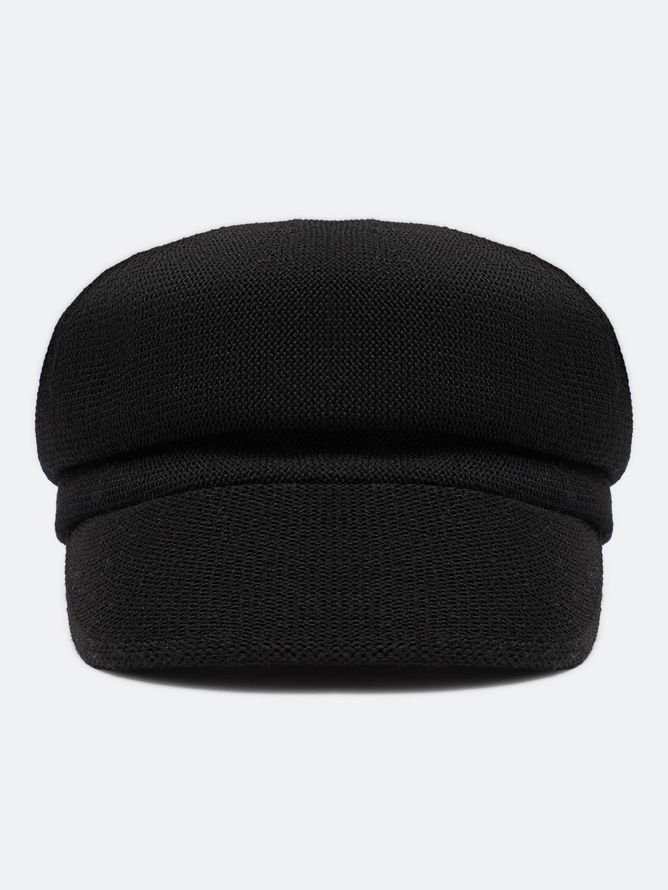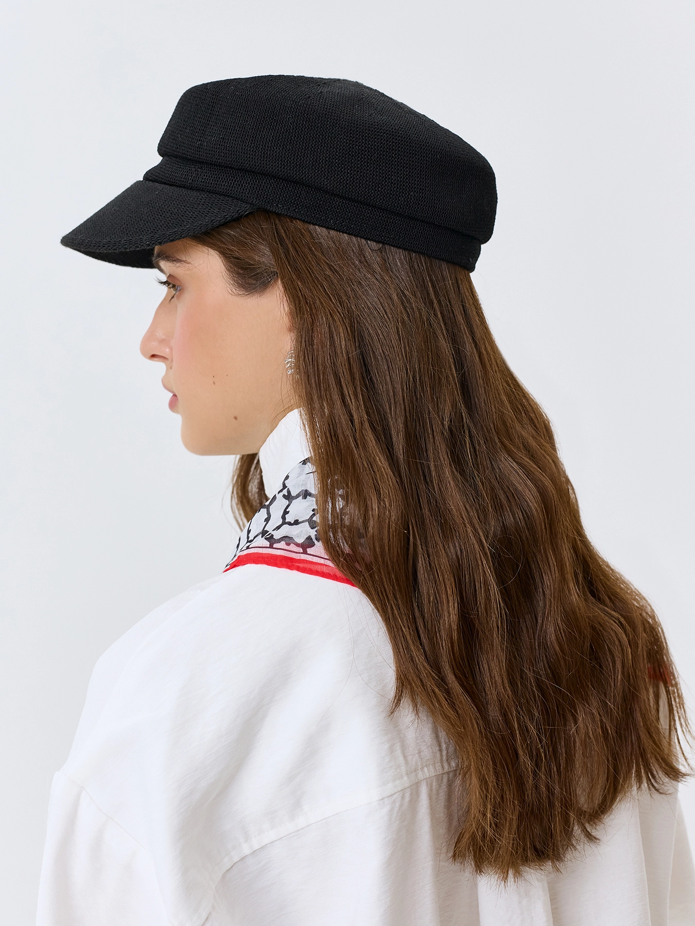 Элегантная вязаная кепи. Широкий изогнутый козырек немного опущен вниз.