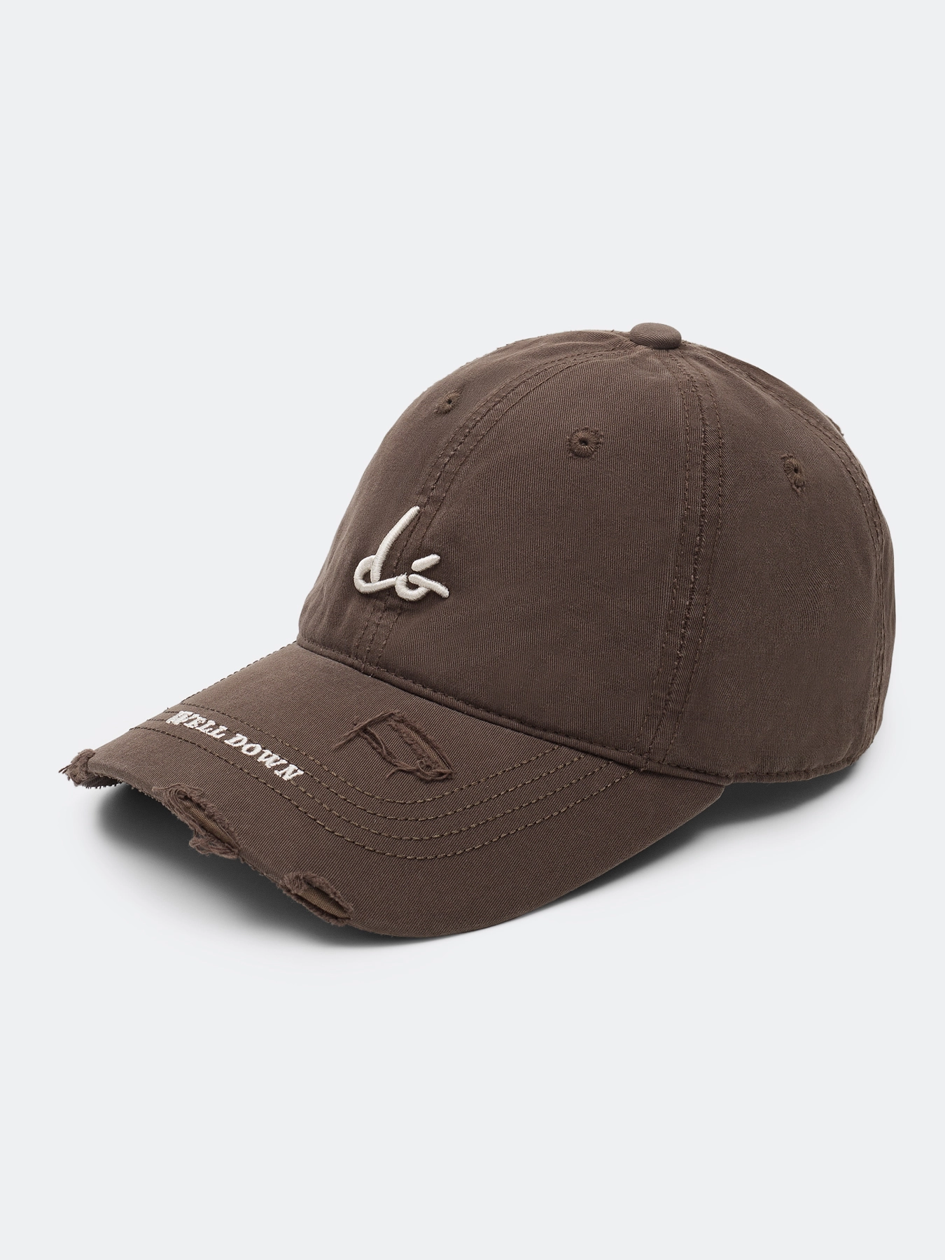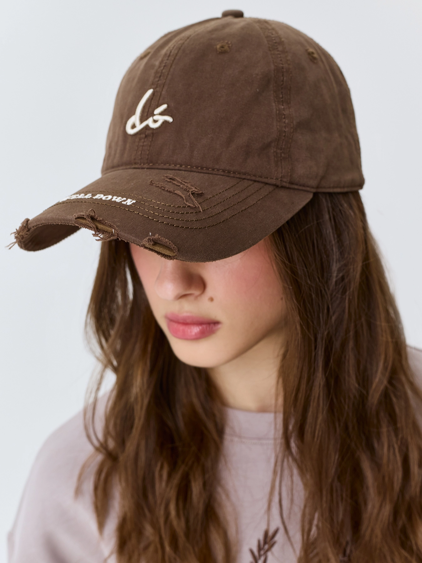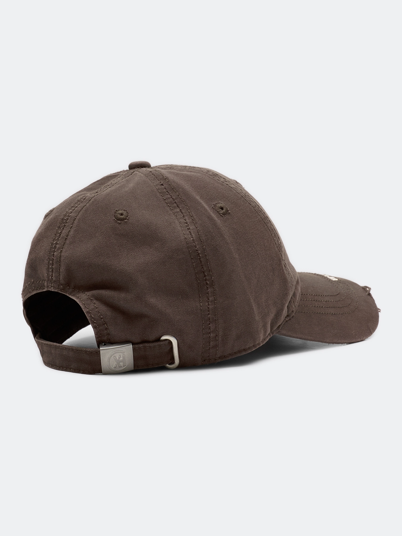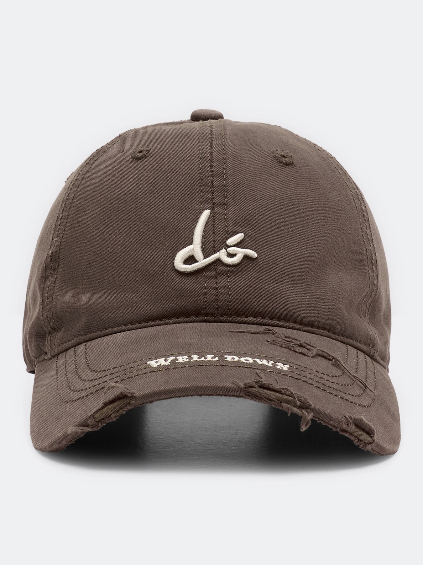 Шоколадная кепка с объемной вышивкой. Широкий изогнутый козырек. Фиксация с помощью металлического зажима. Дополнена контрастным принтом и дестроями на козырьке. В составе 100% хлопок.