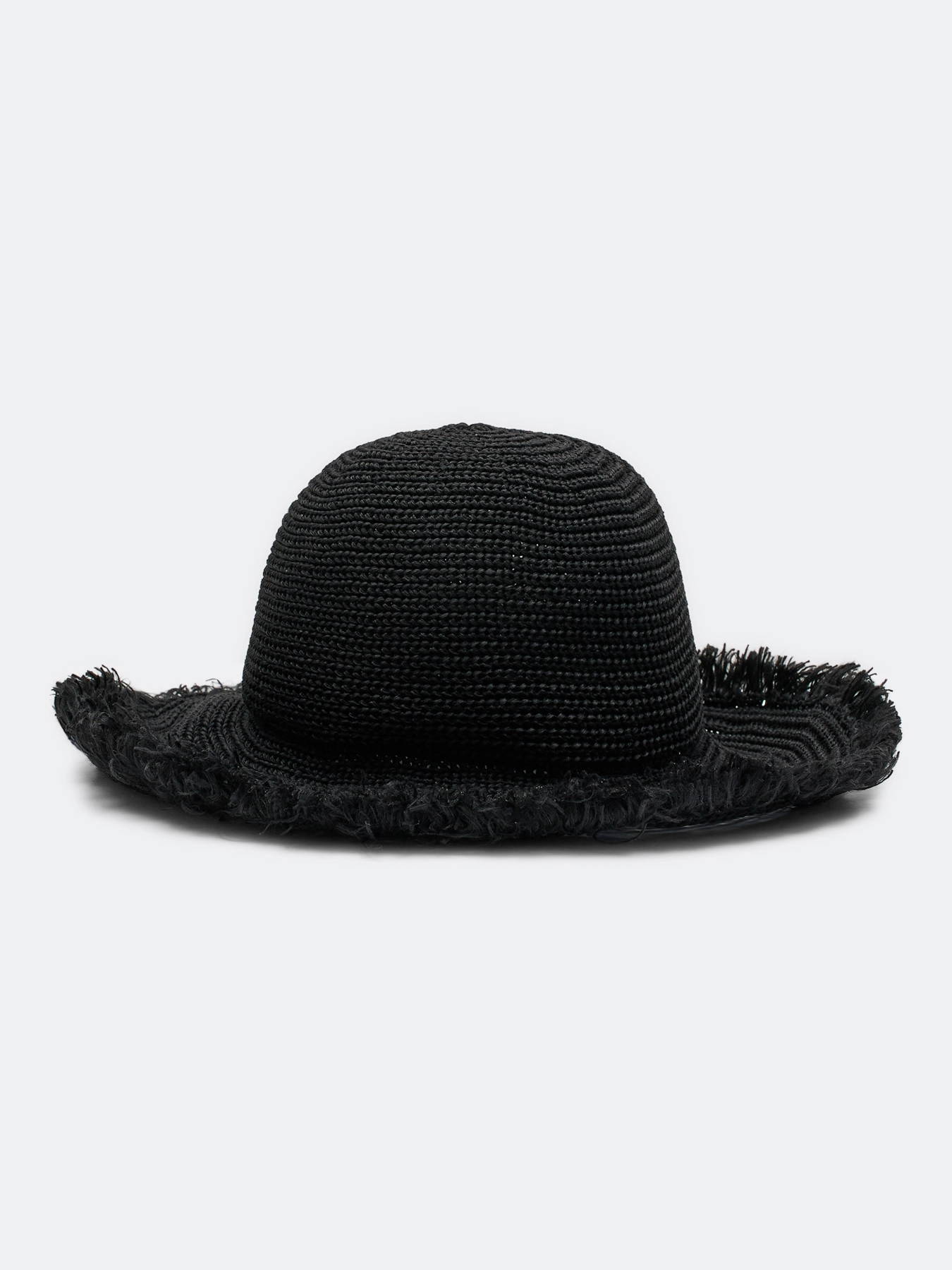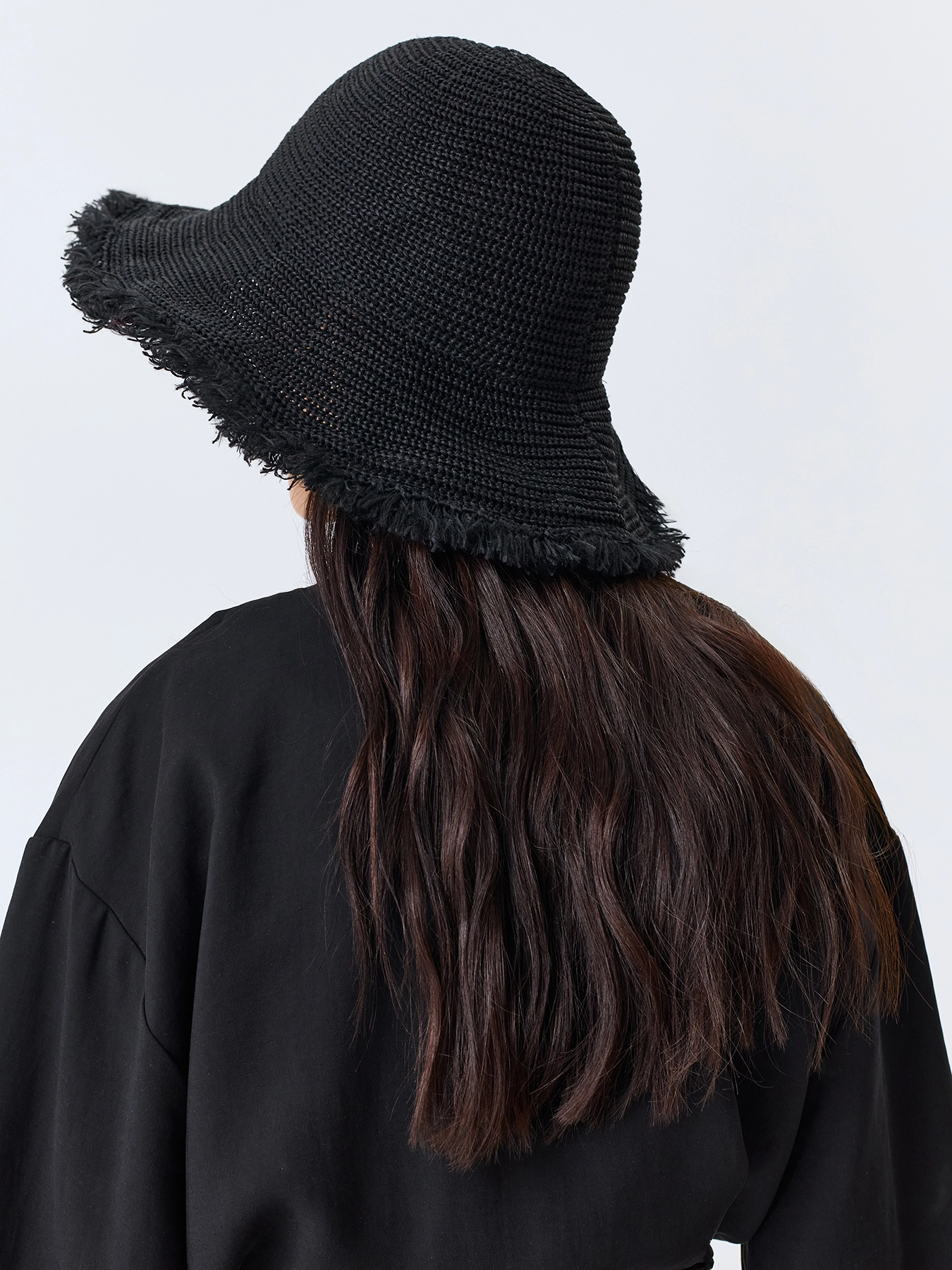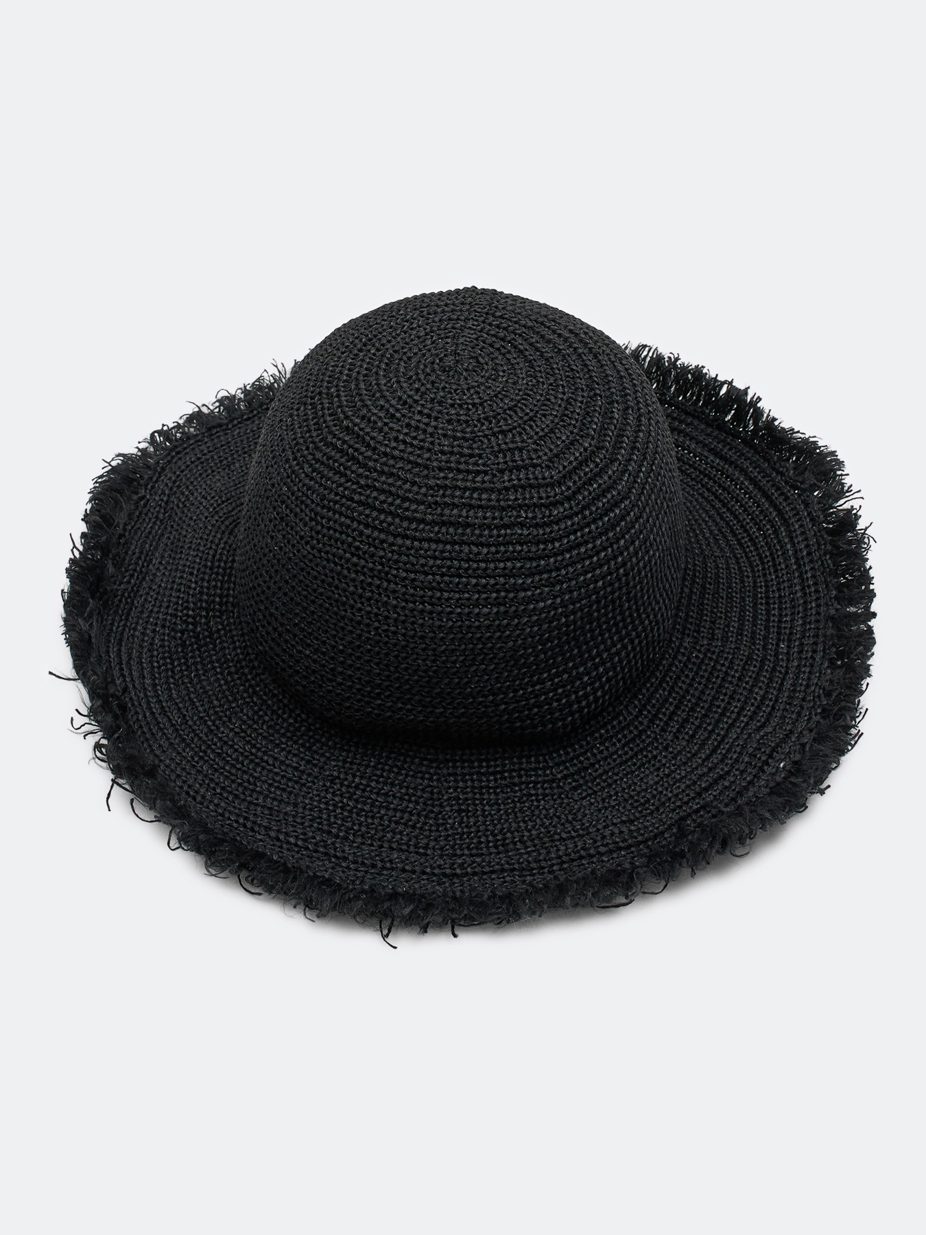 Летняя вязаная шляпа с широкими, опущенными вниз полями. Круглая тулья. Дополнена деликатной бахромой по краю полей.
