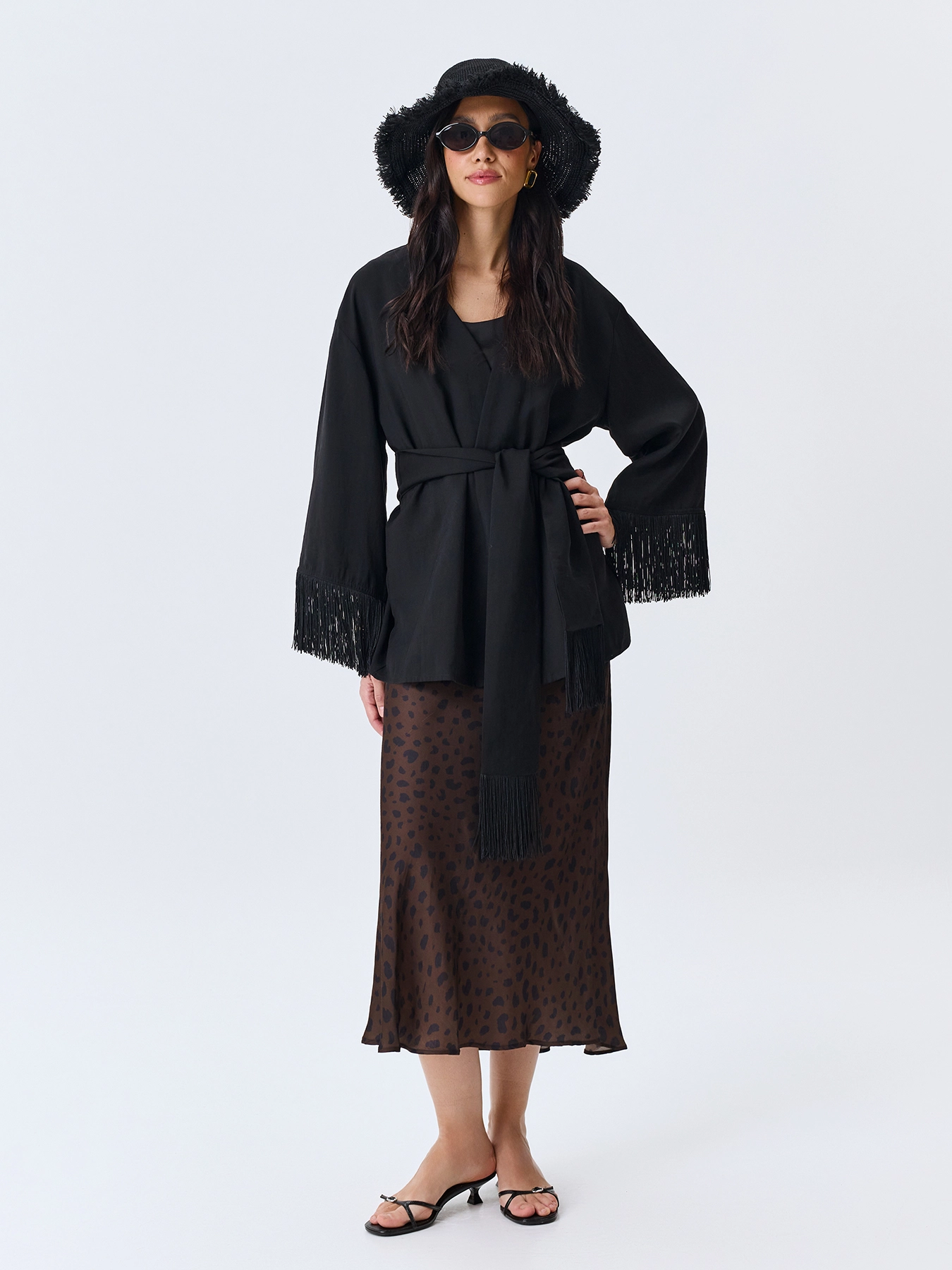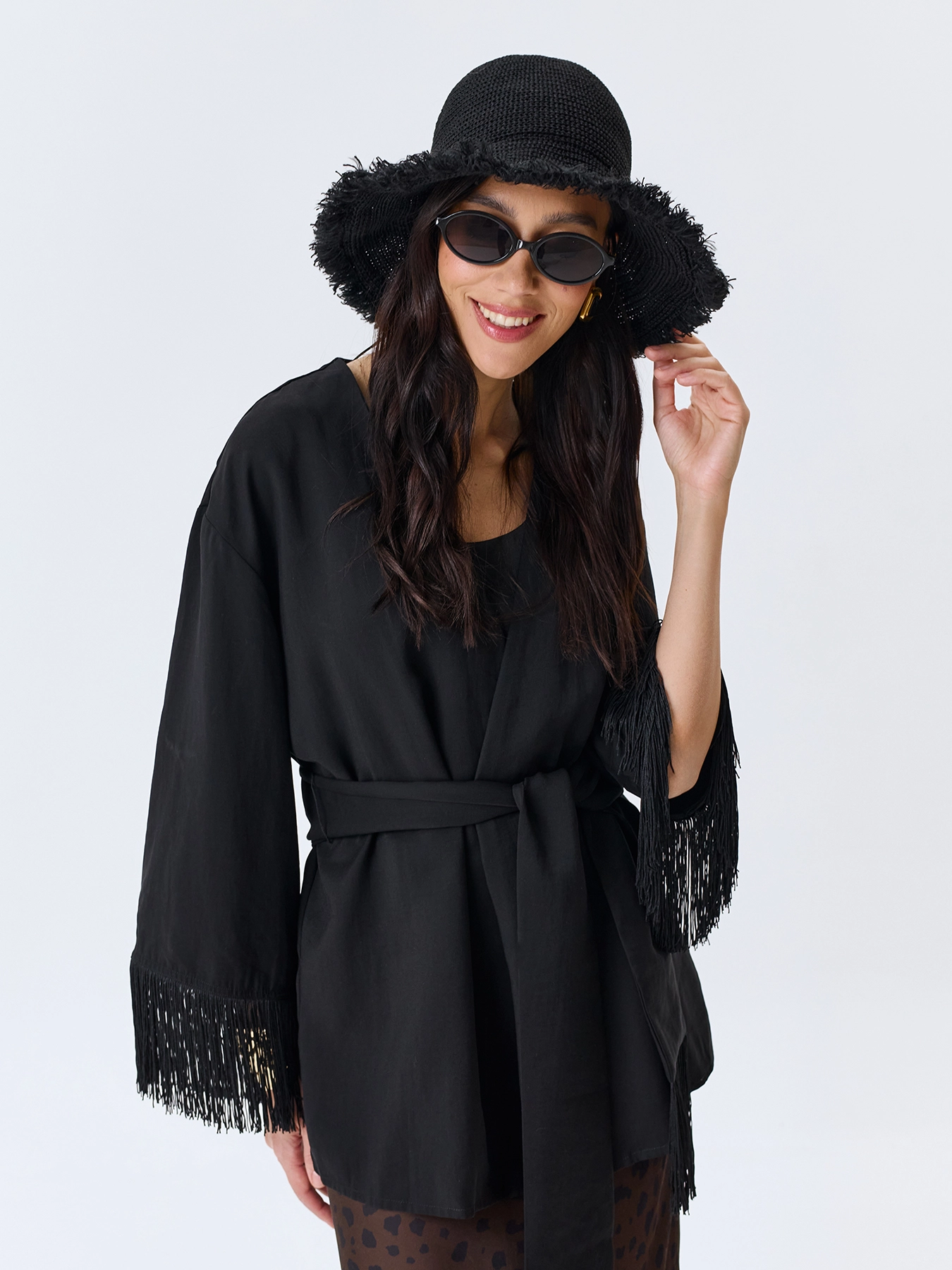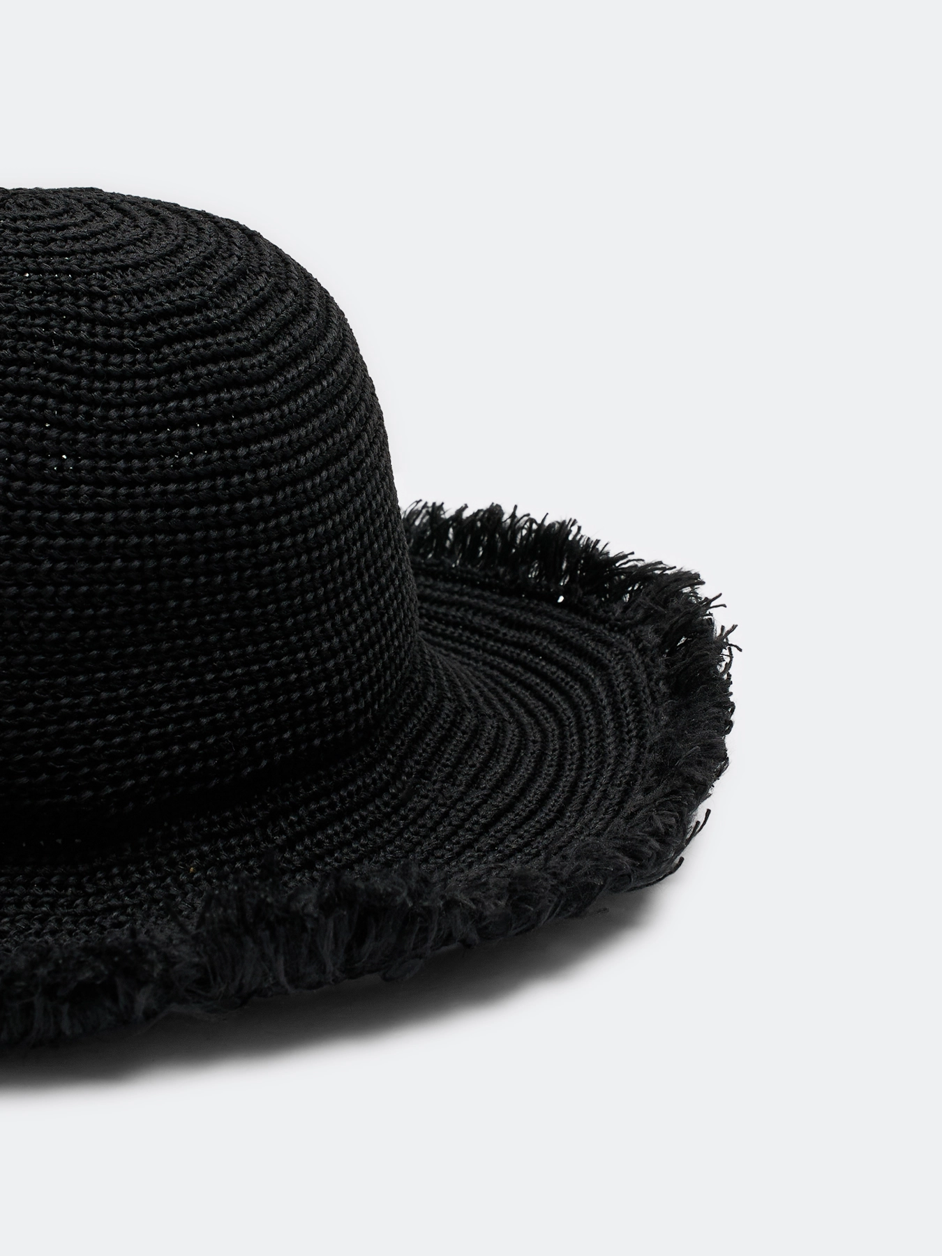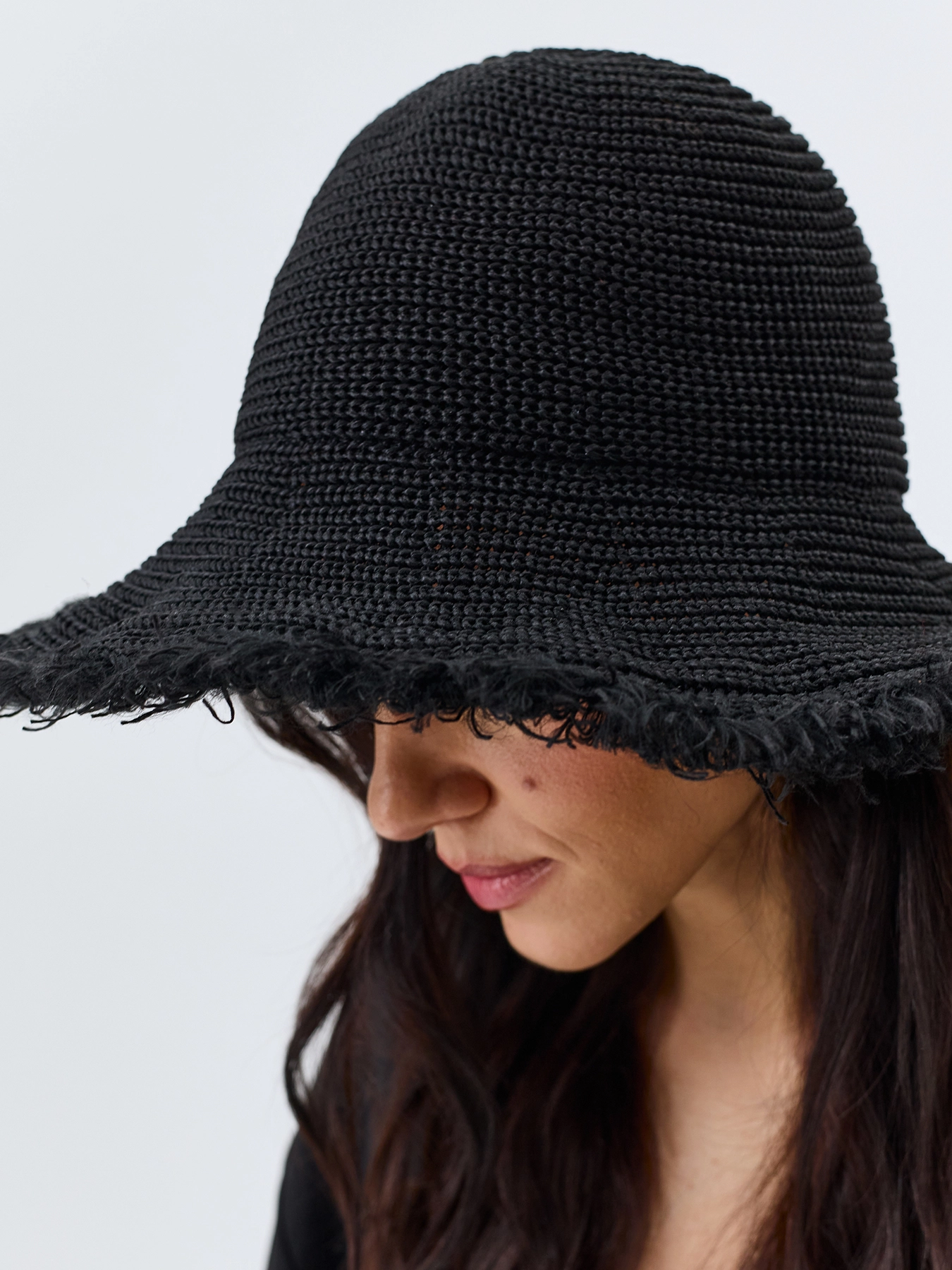 Летняя вязаная шляпа с широкими, опущенными вниз полями. Круглая тулья. Дополнена деликатной бахромой по краю полей.