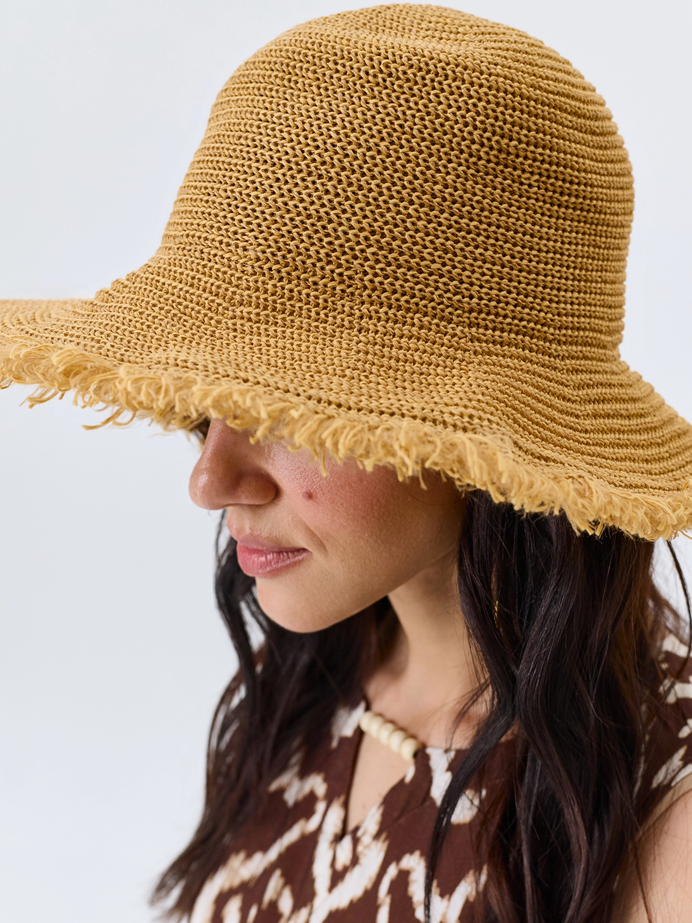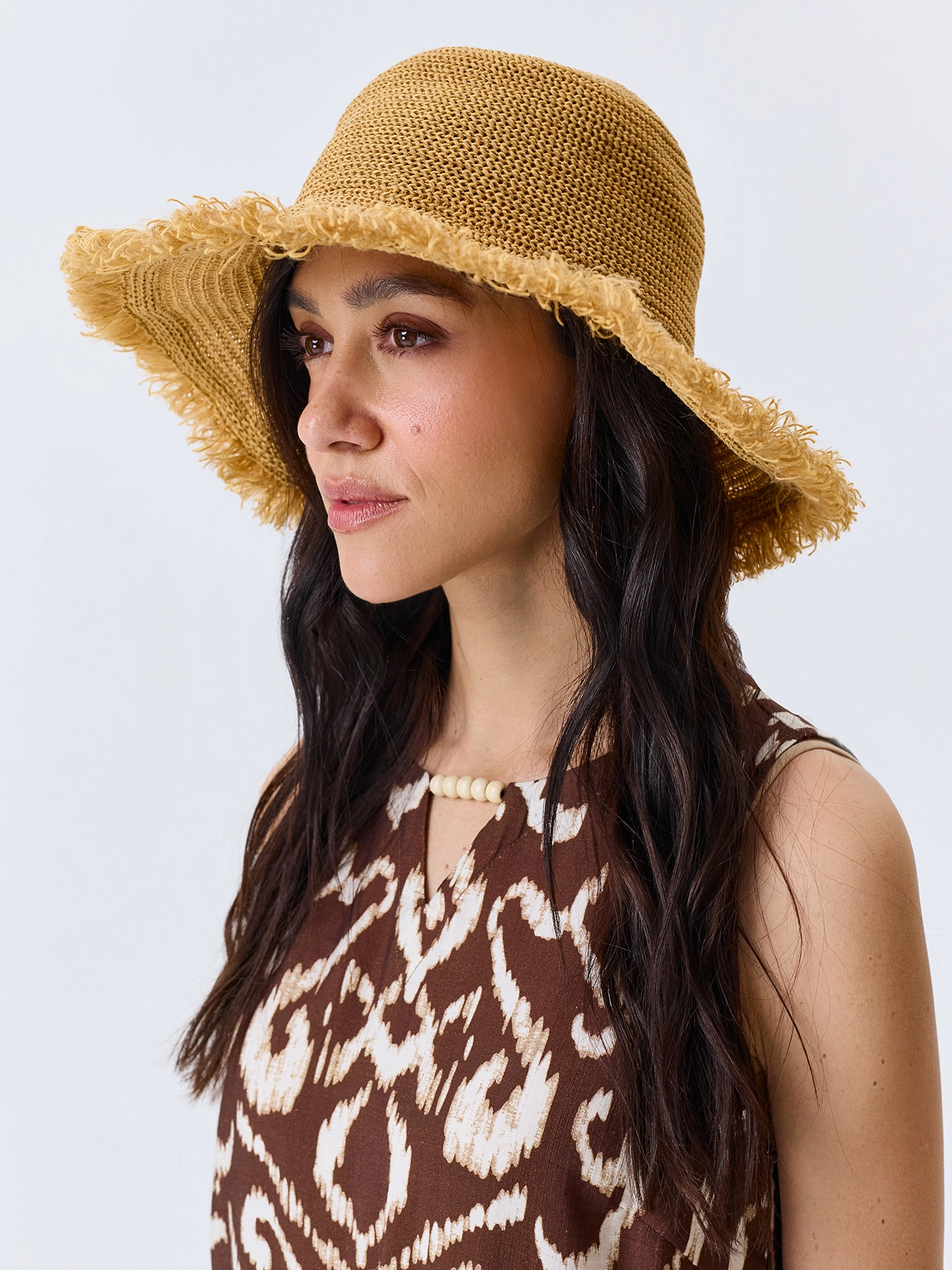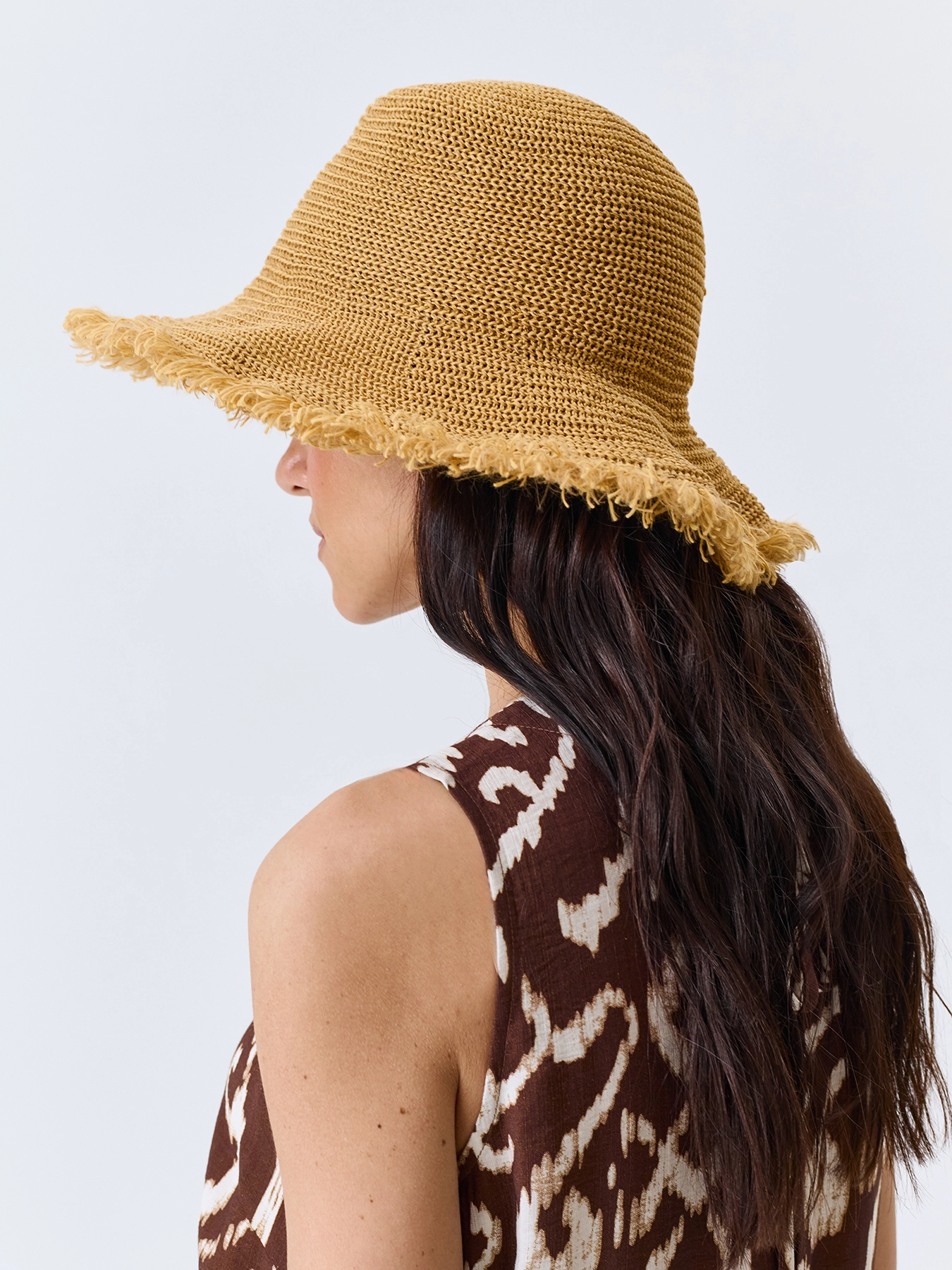 Летняя вязаная шляпа с широкими, опущенными вниз полями. Круглая тулья. Дополнена деликатной бахромой по краю полей.