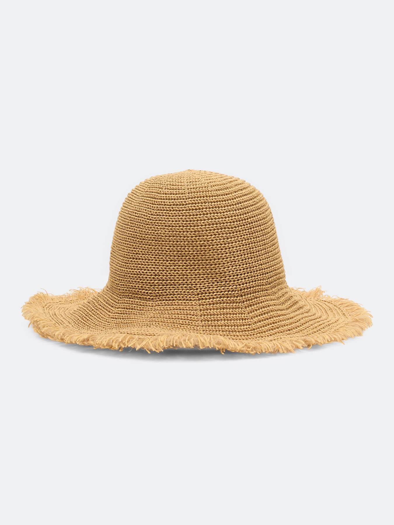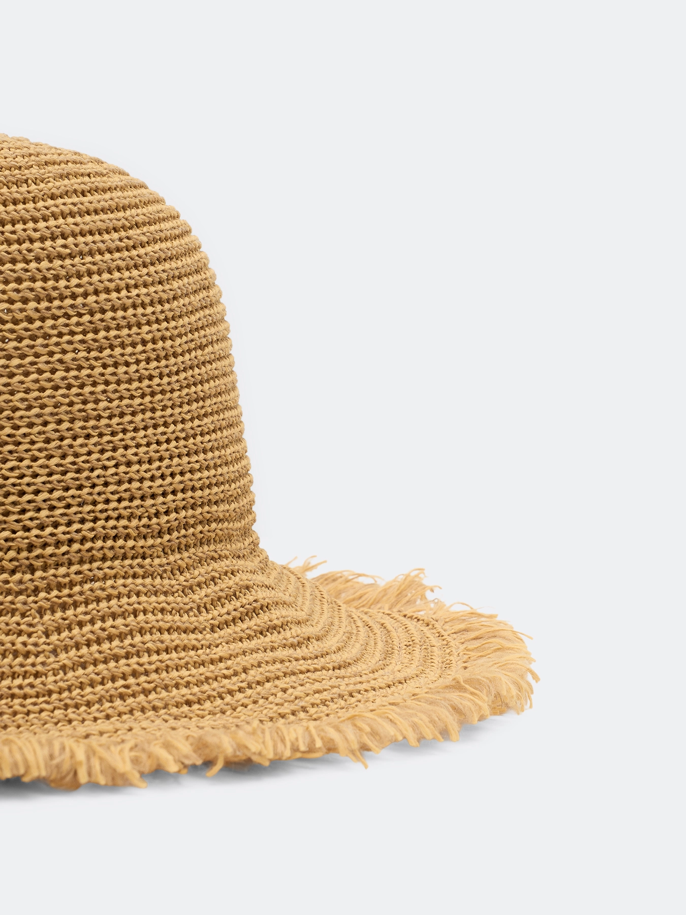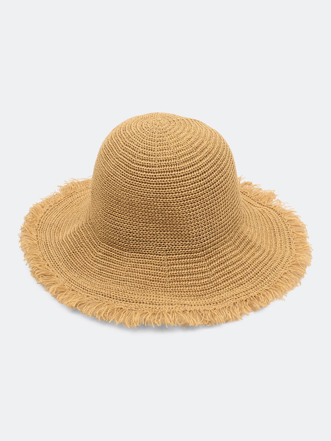 Летняя вязаная шляпа с широкими, опущенными вниз полями. Круглая тулья. Дополнена деликатной бахромой по краю полей.