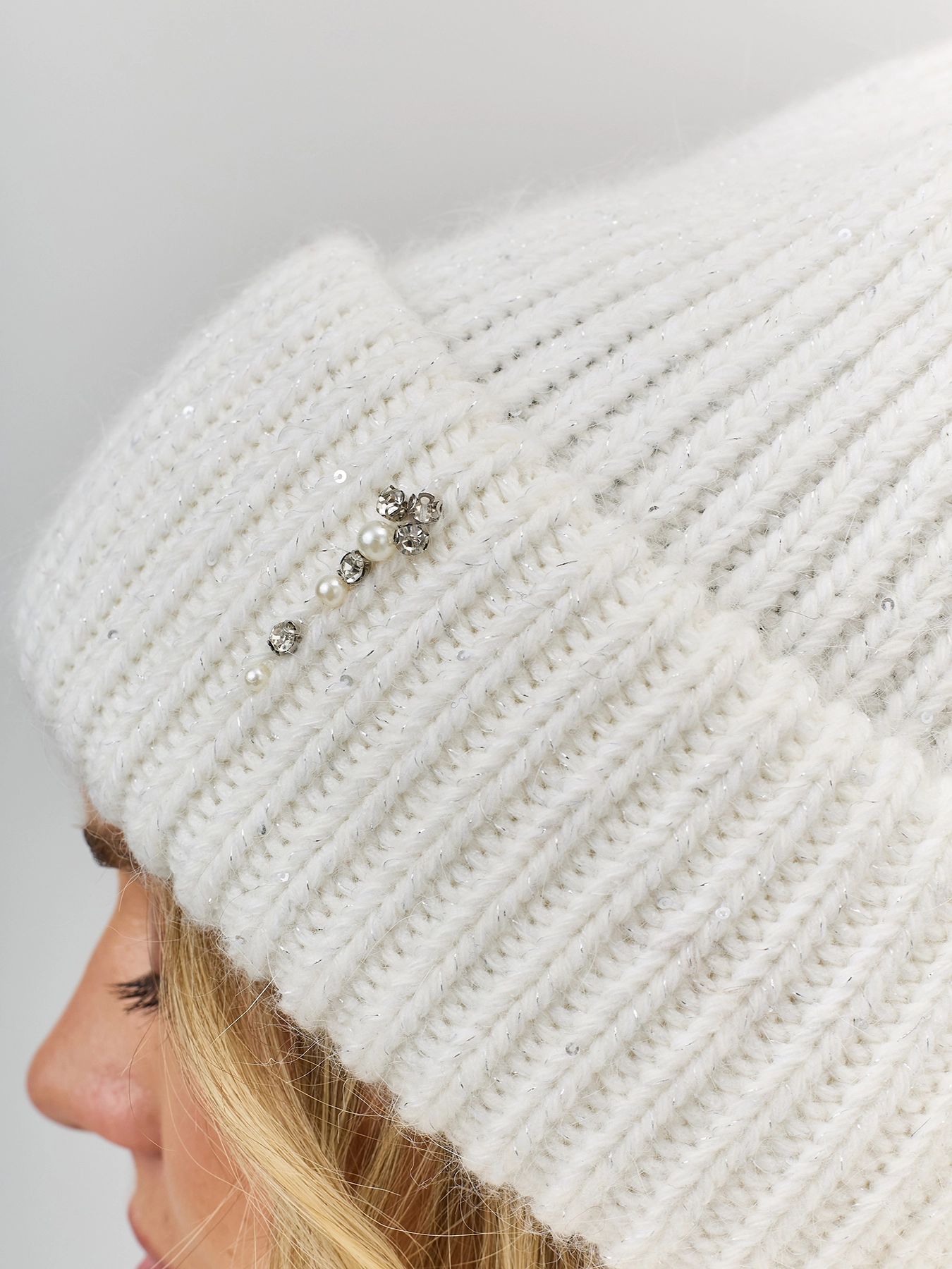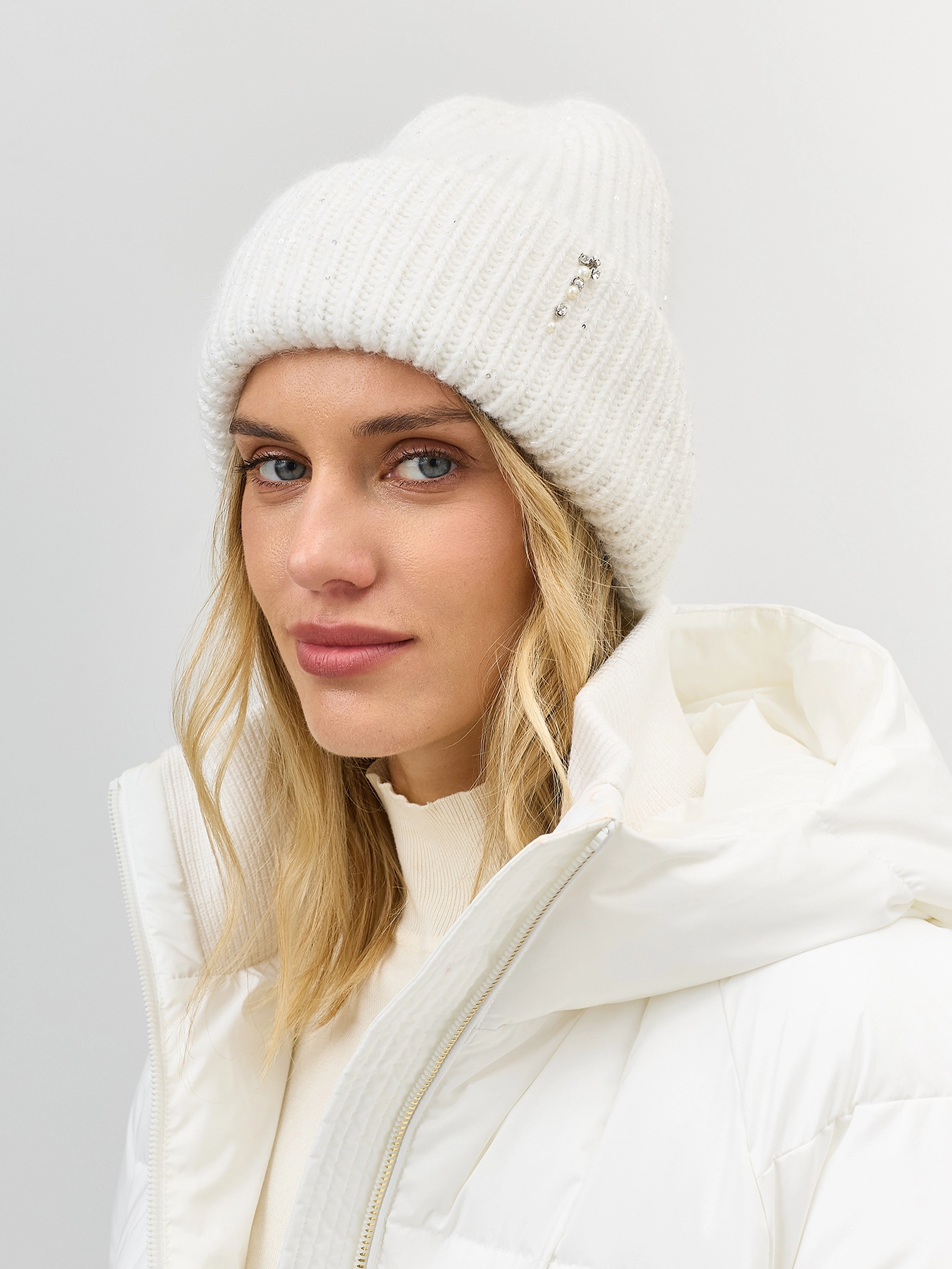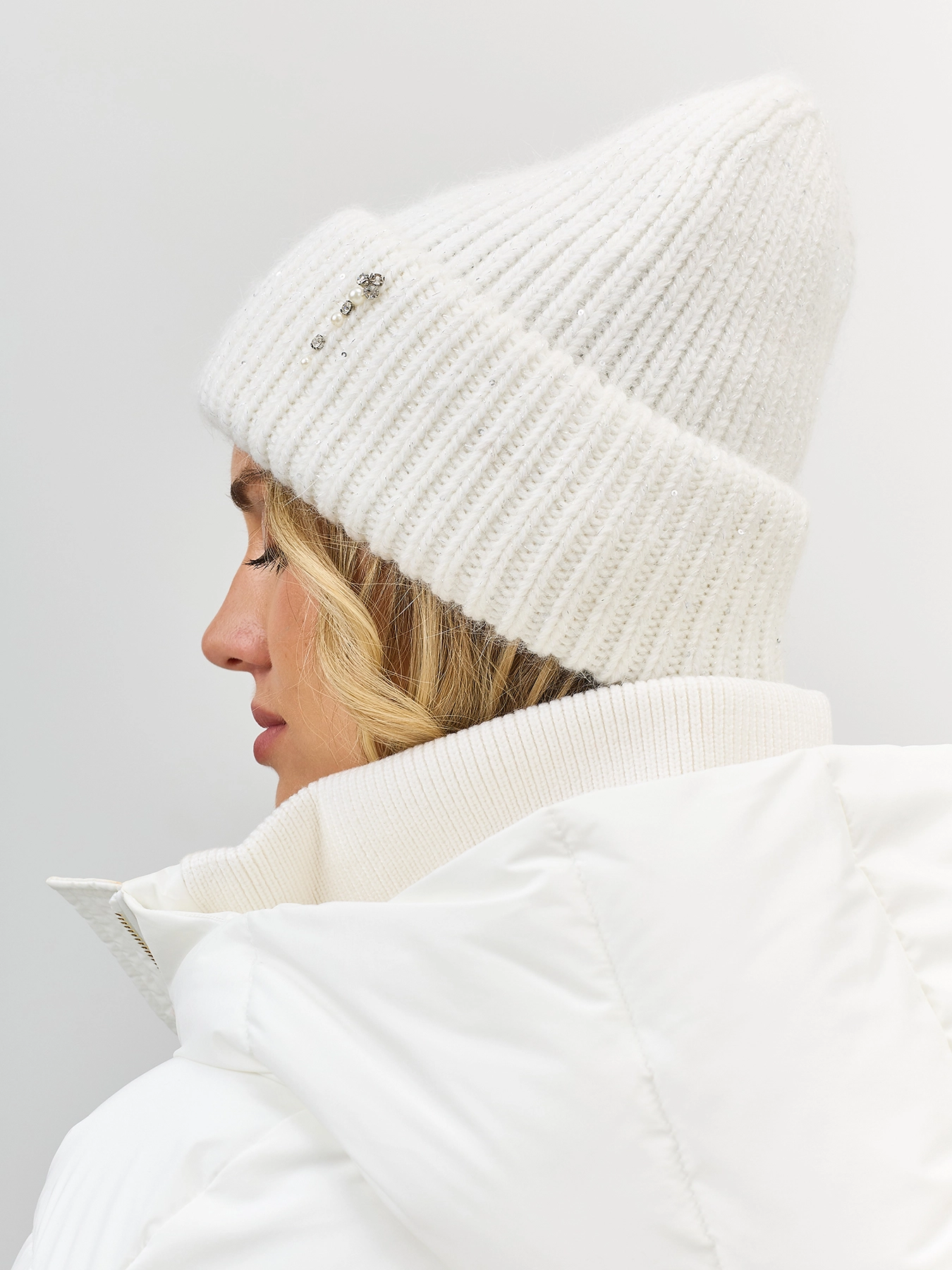 Шапка бини в рубчик с минималистичным декором на широком отвороте. Деликатный люрекс. В составе ангора.