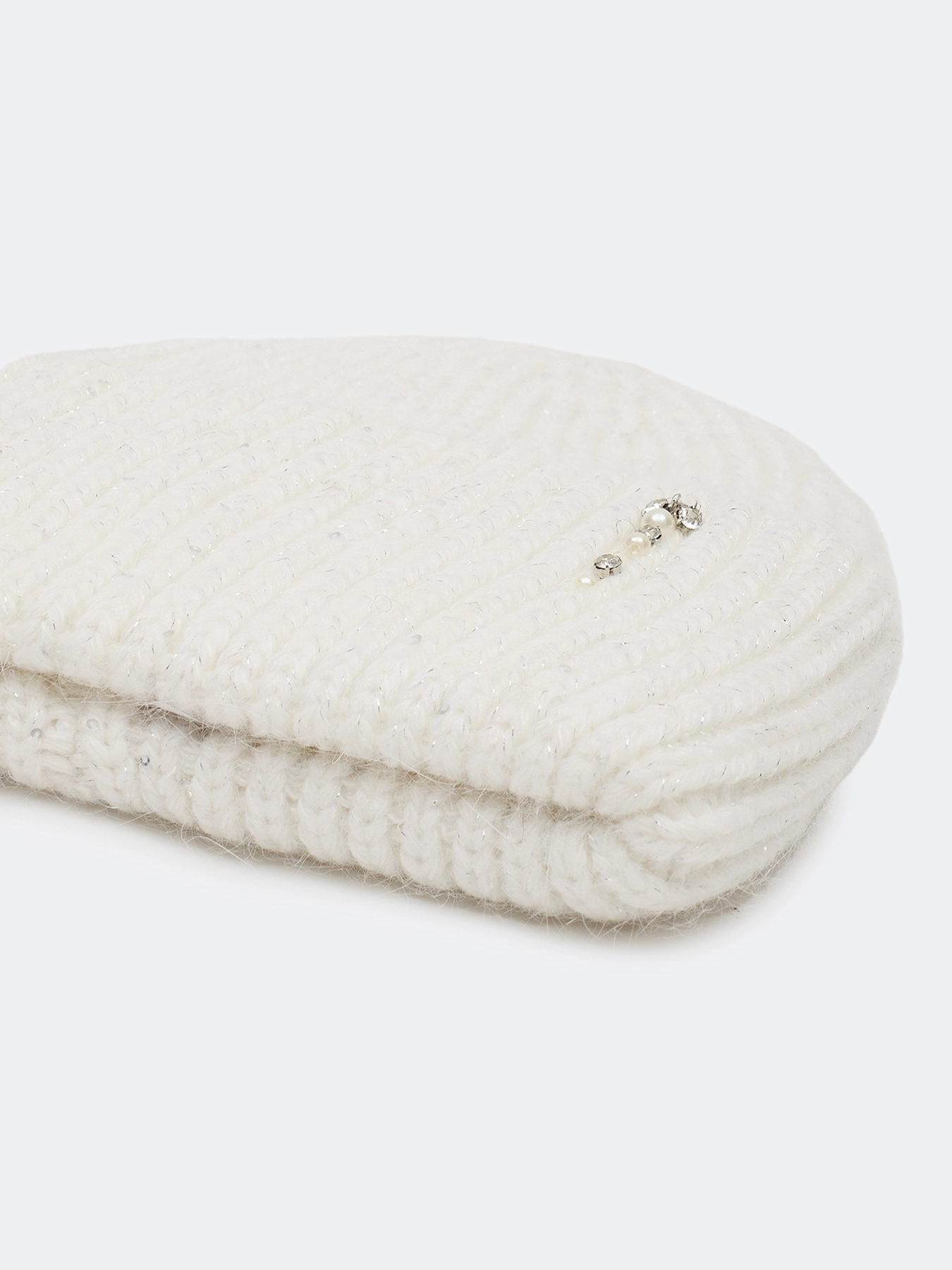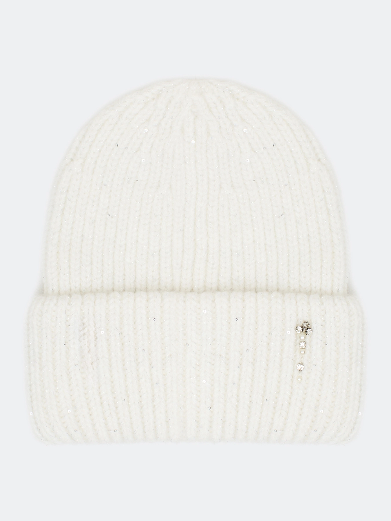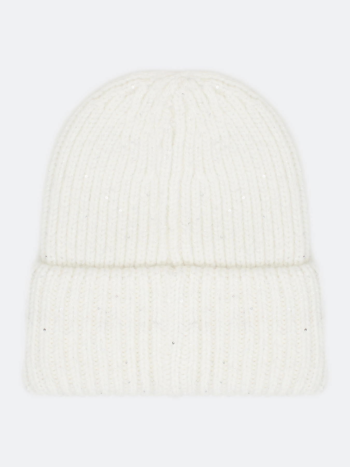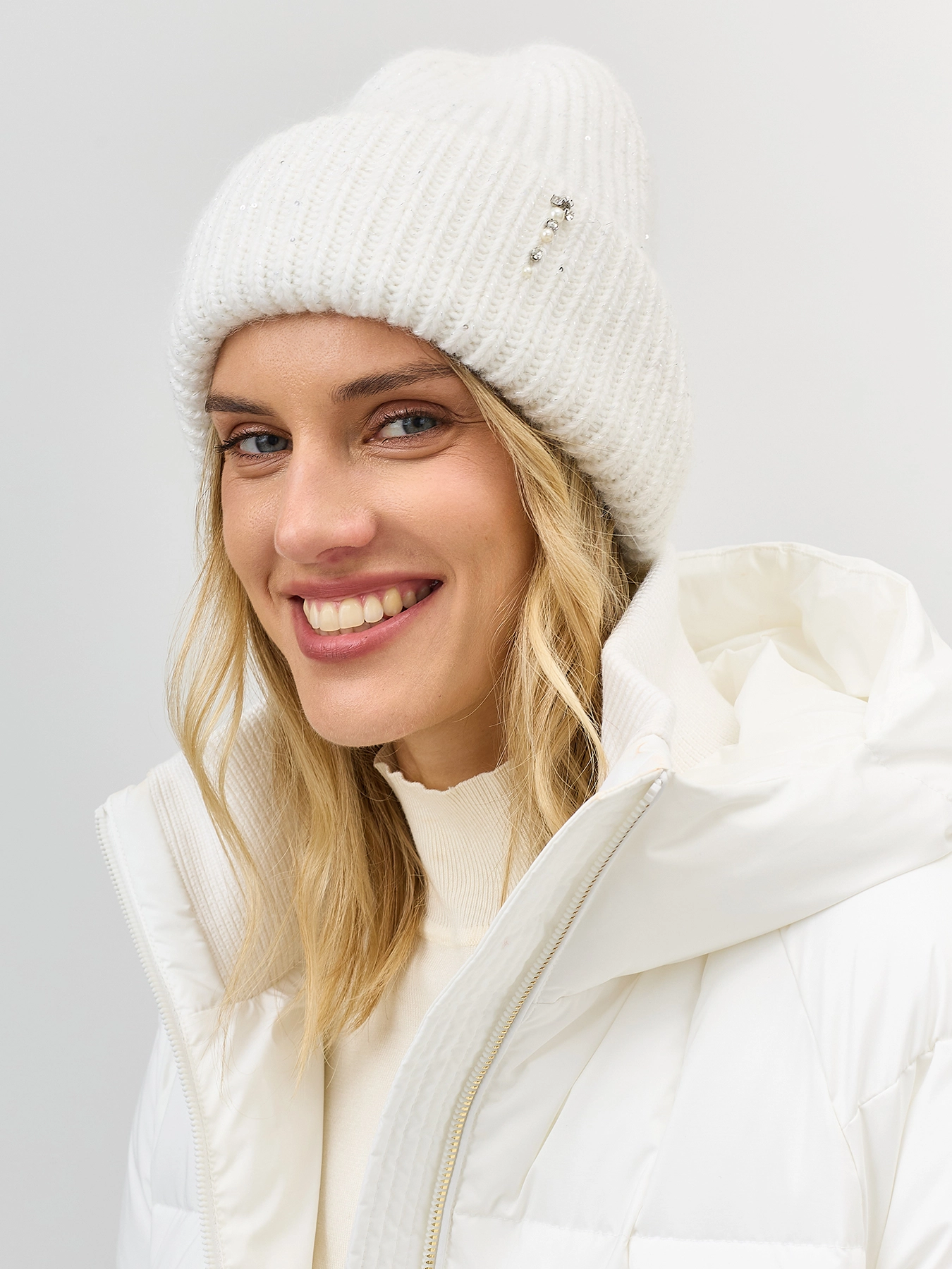 Шапка бини в рубчик с минималистичным декором на широком отвороте. Деликатный люрекс. В составе ангора.