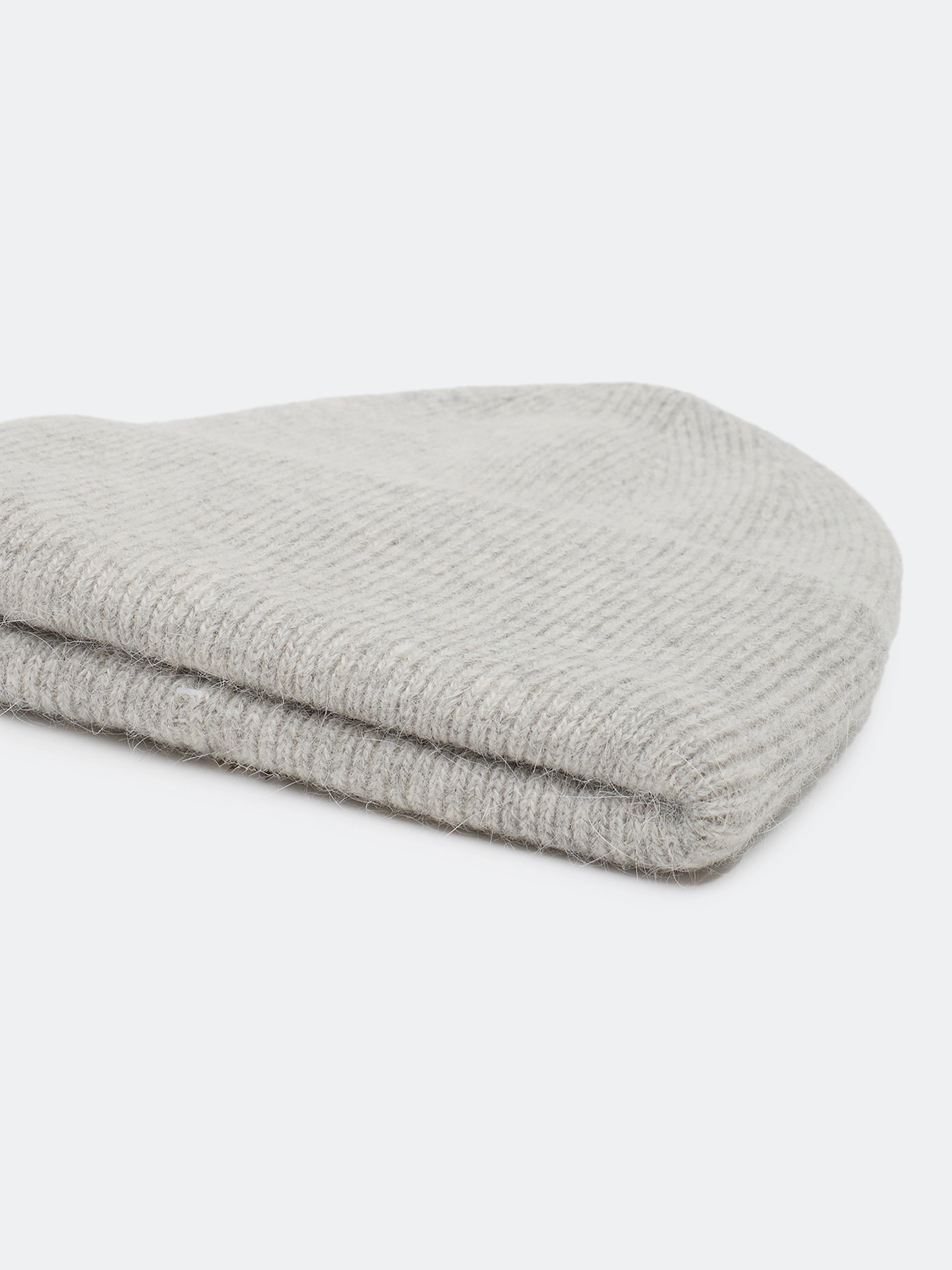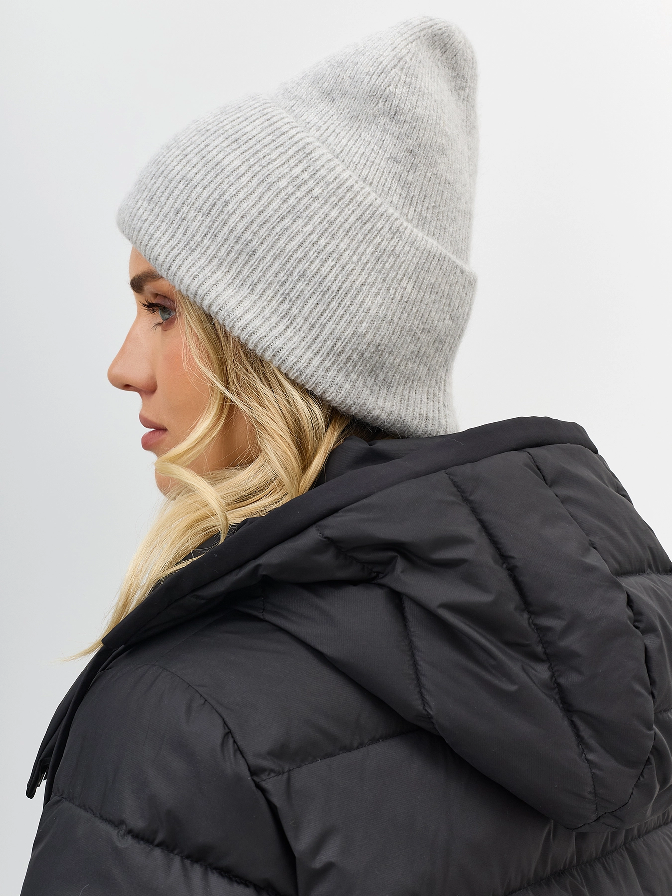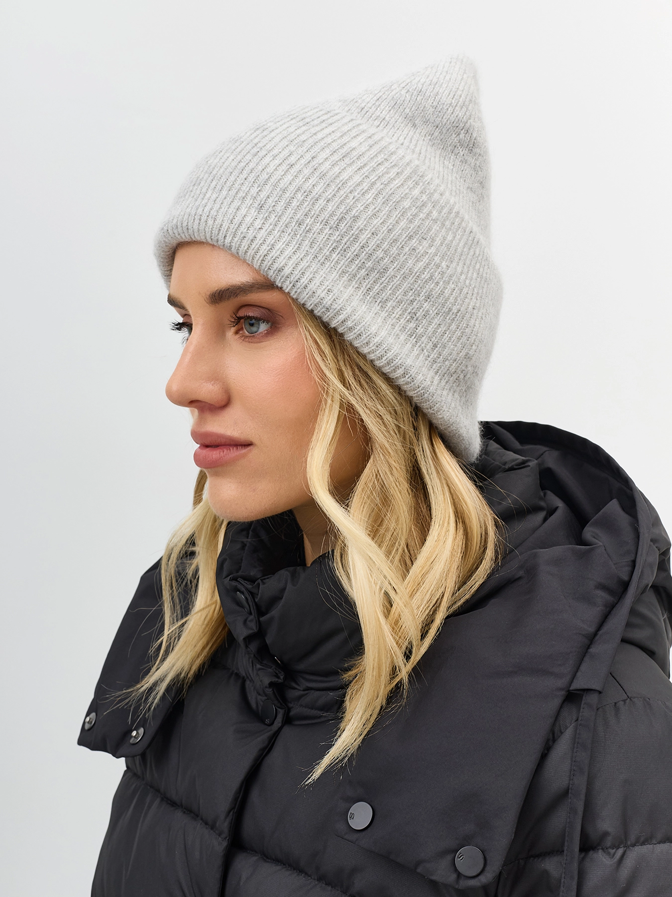 Шапка бини с широким отворотом. Двухслойная вязка в рубчик. В составе вискоза и ангора.
