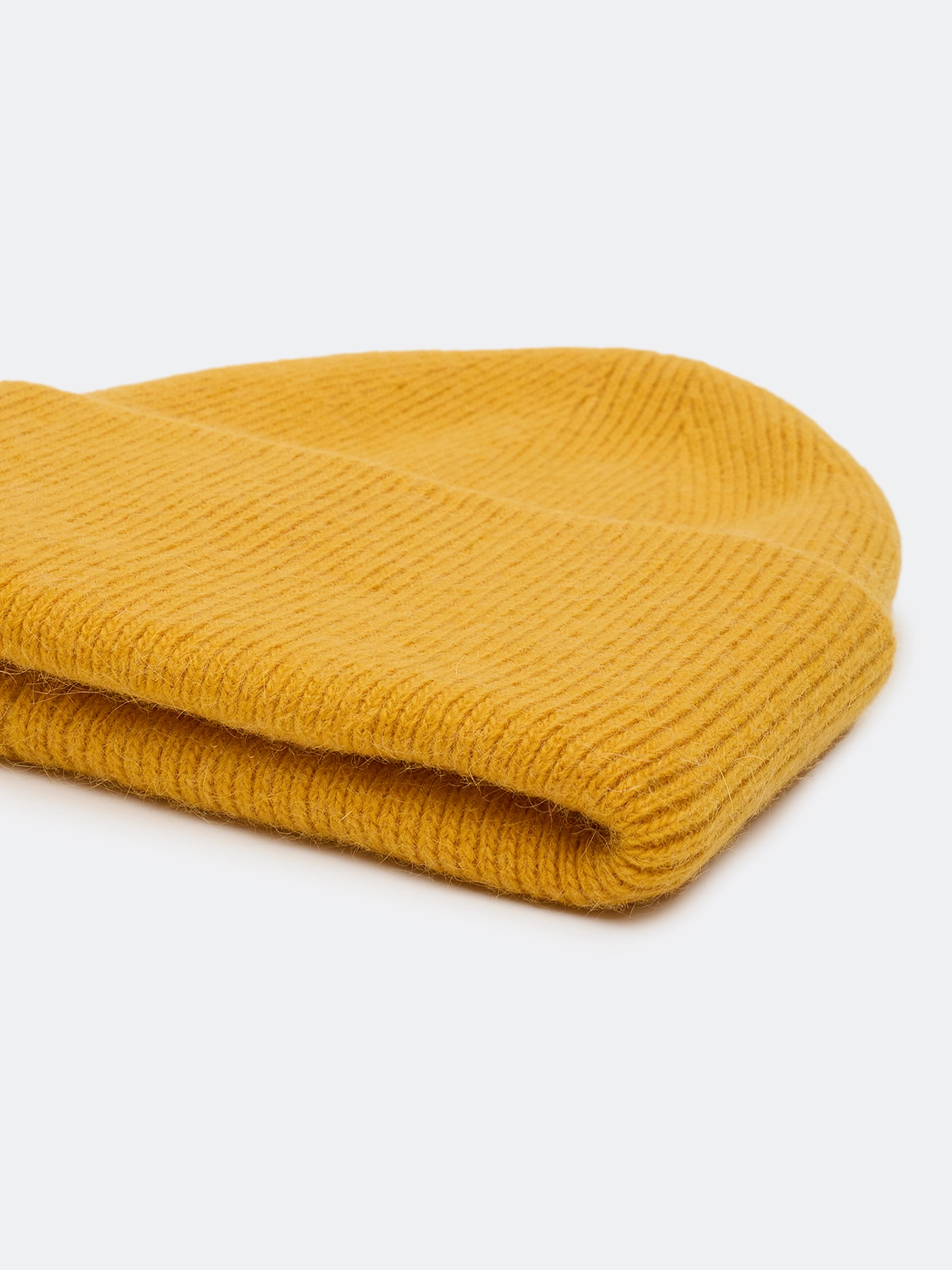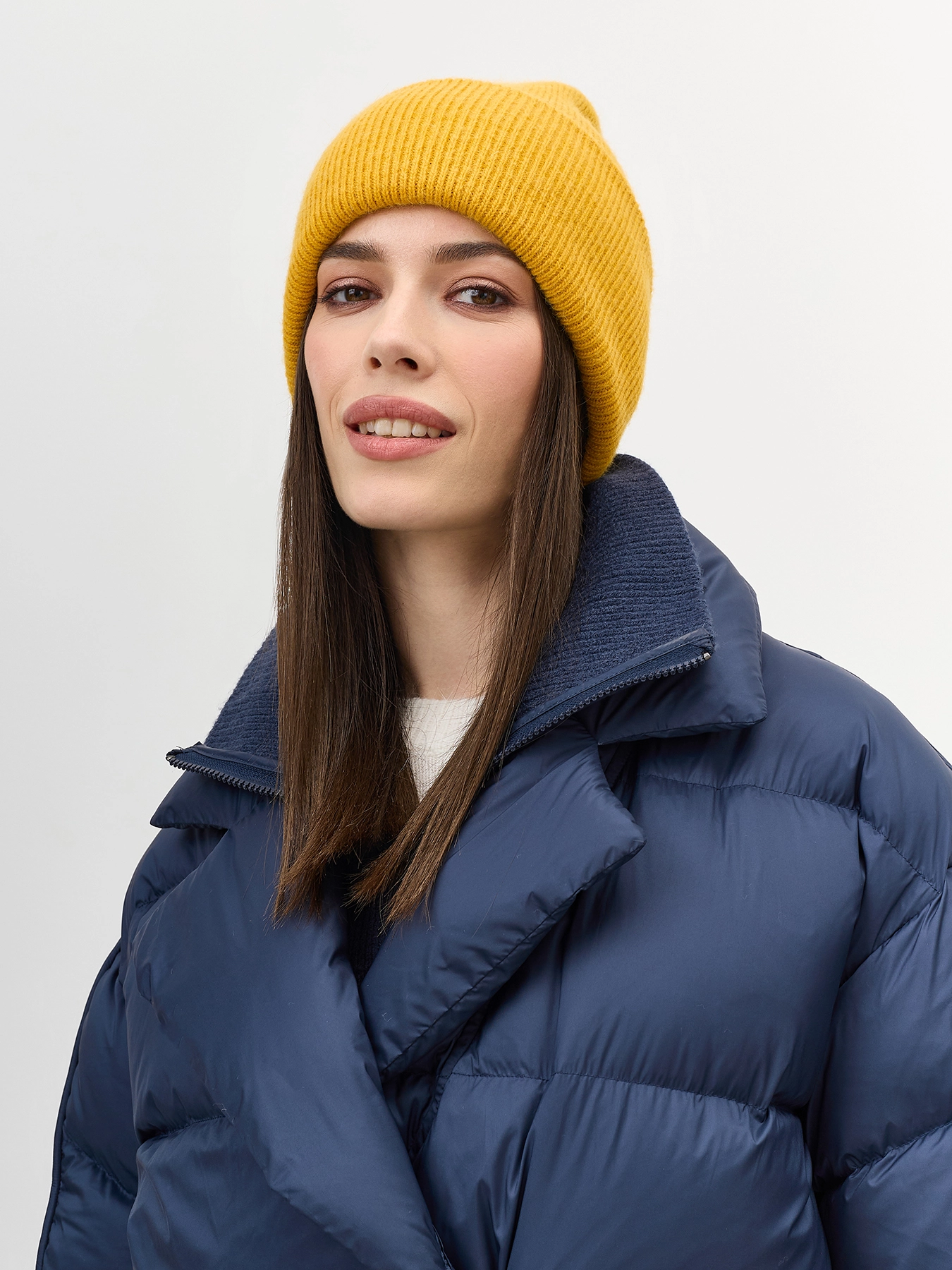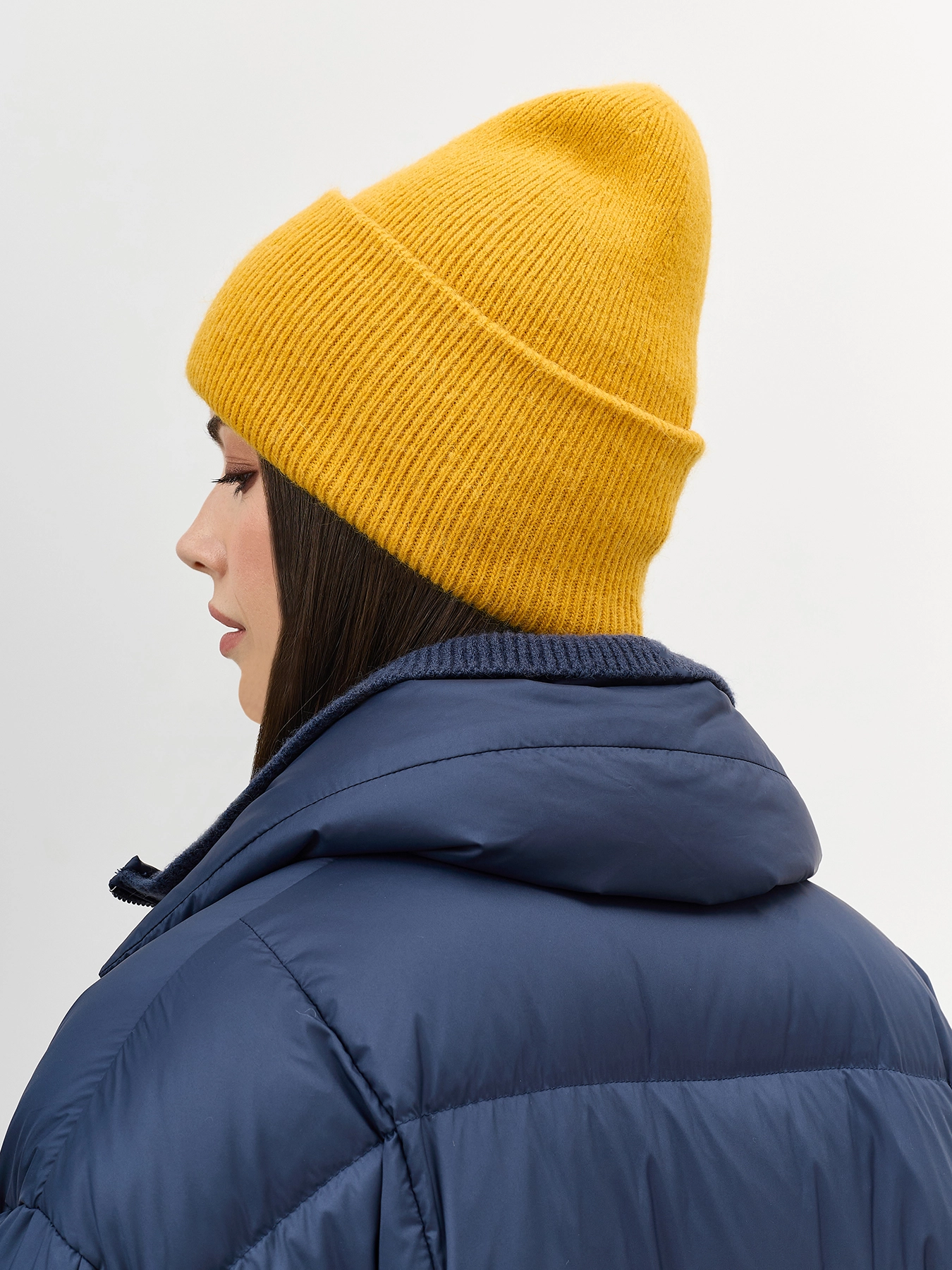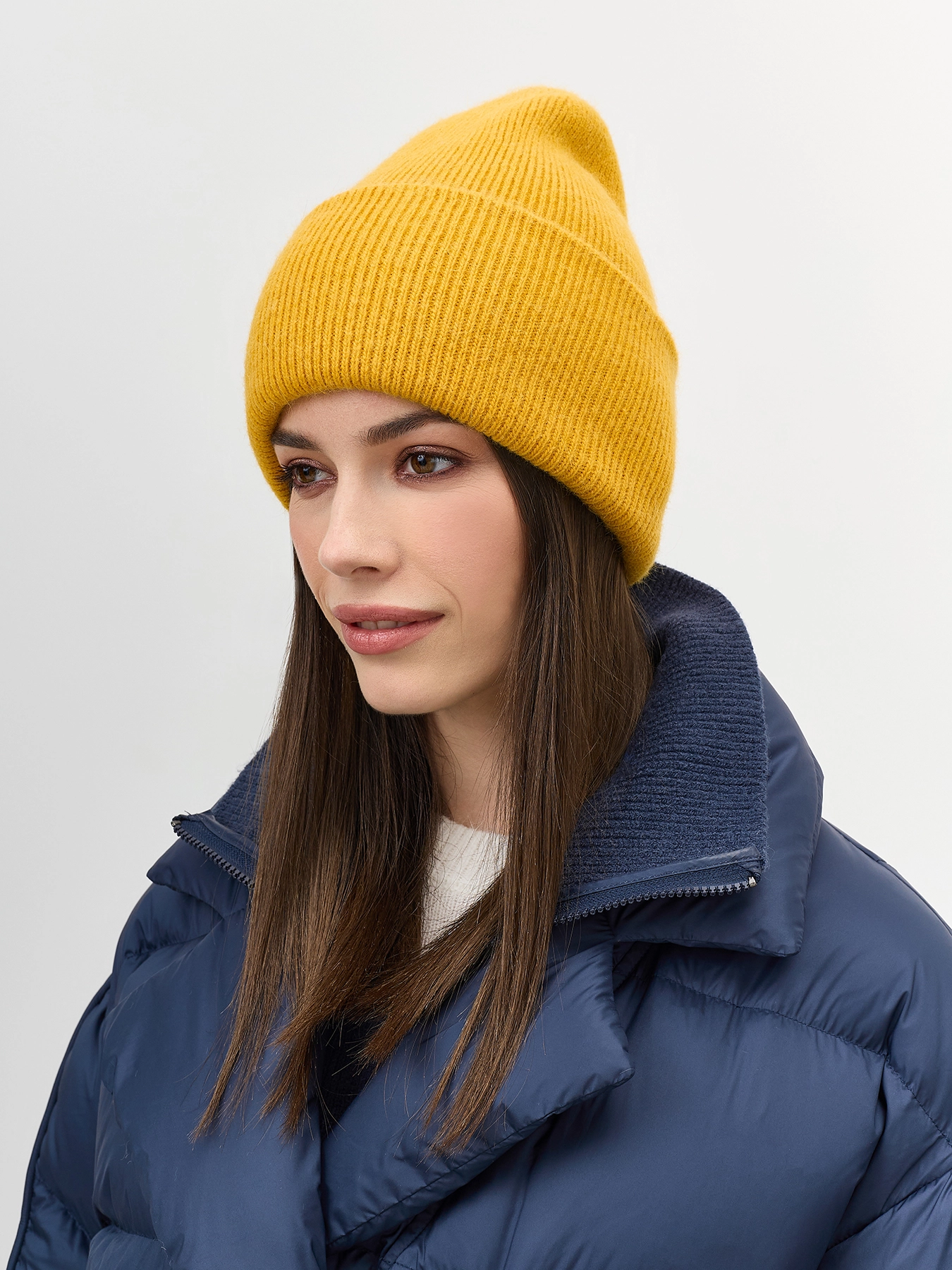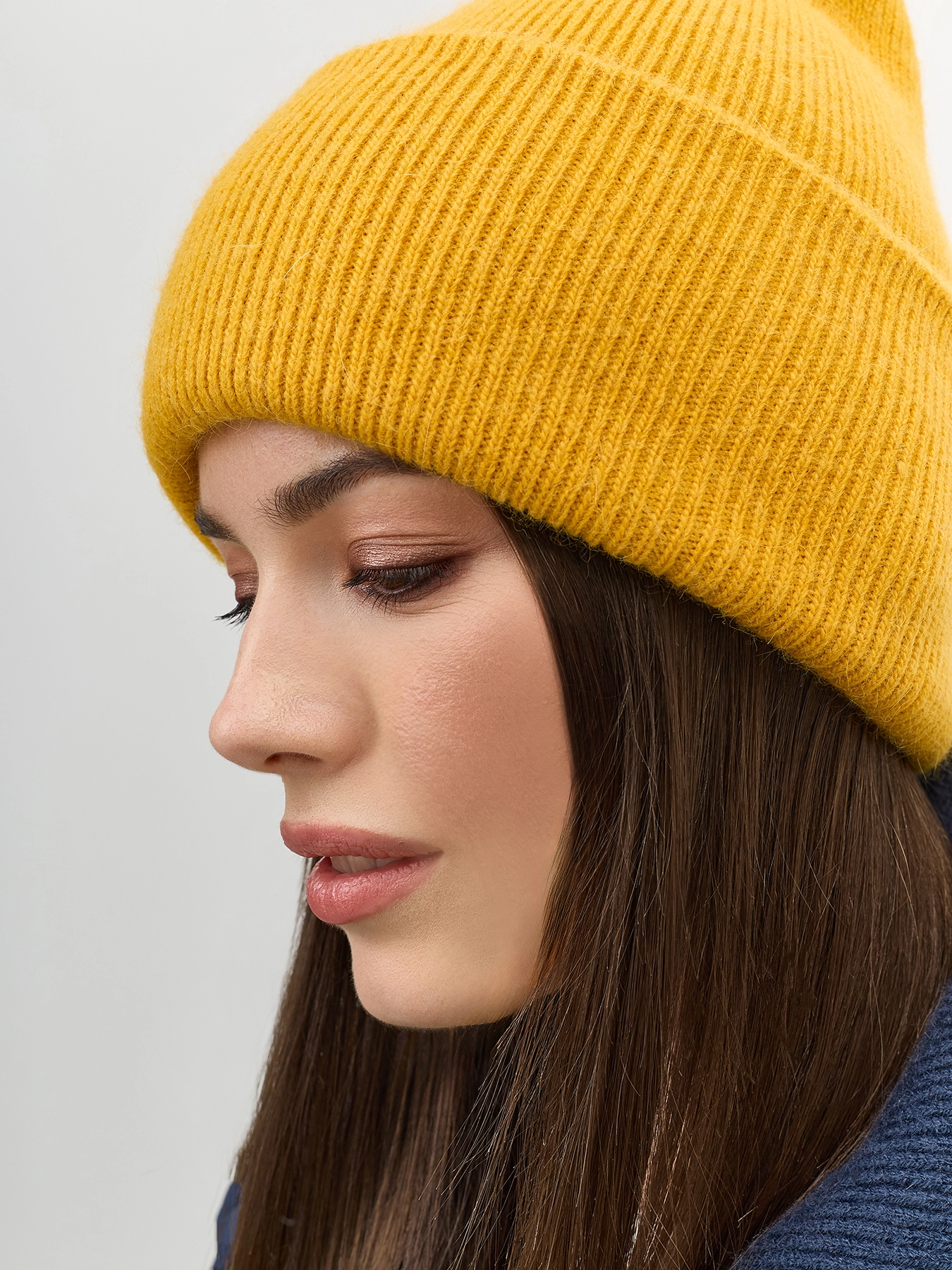 Шапка бини с широким отворотом. Двухслойная вязка в рубчик. В составе вискоза и ангора.