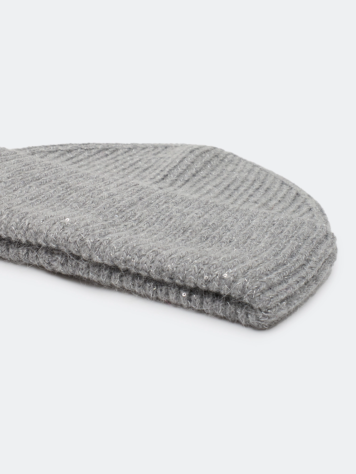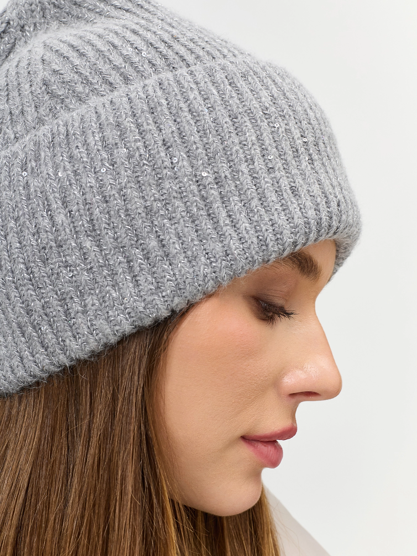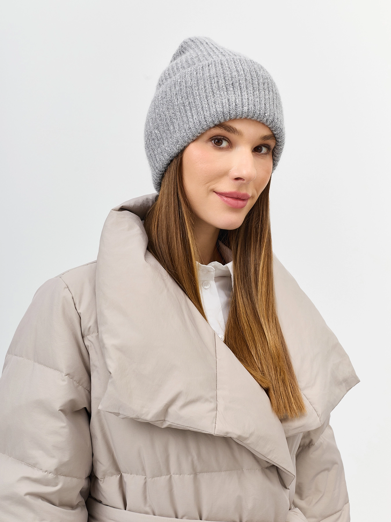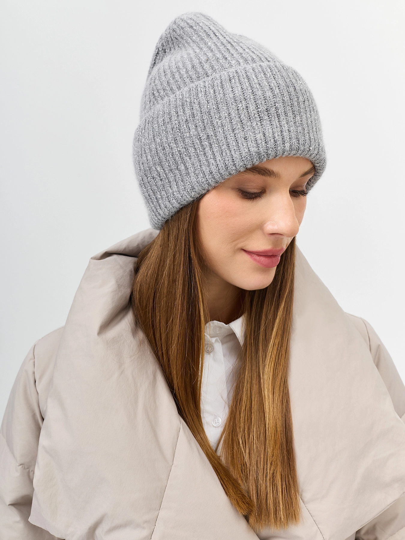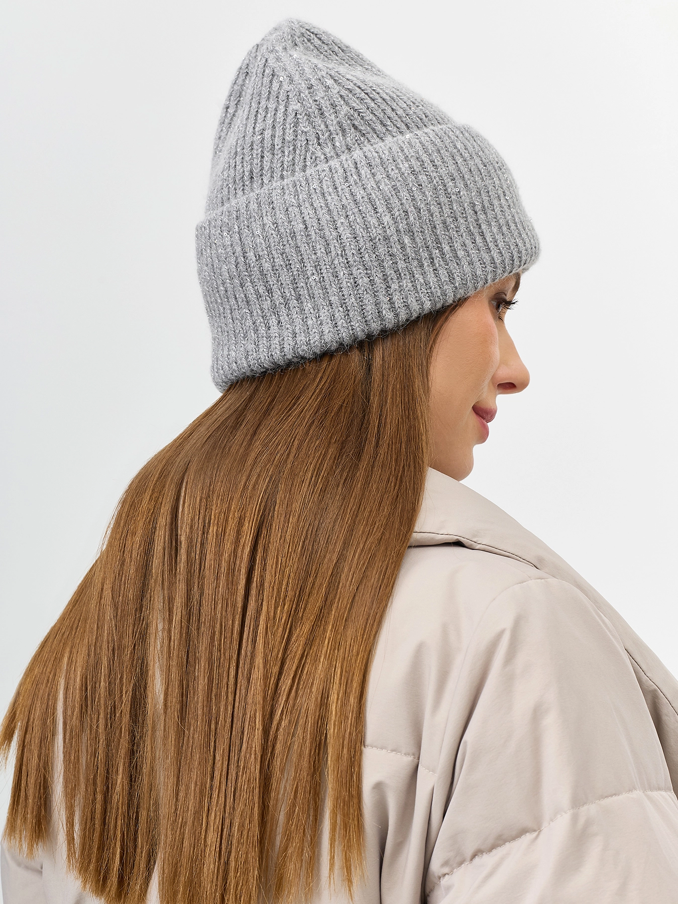 Шапка бини в рубчик с широким отворотом. В составе ангора, вискоза и шерсть.