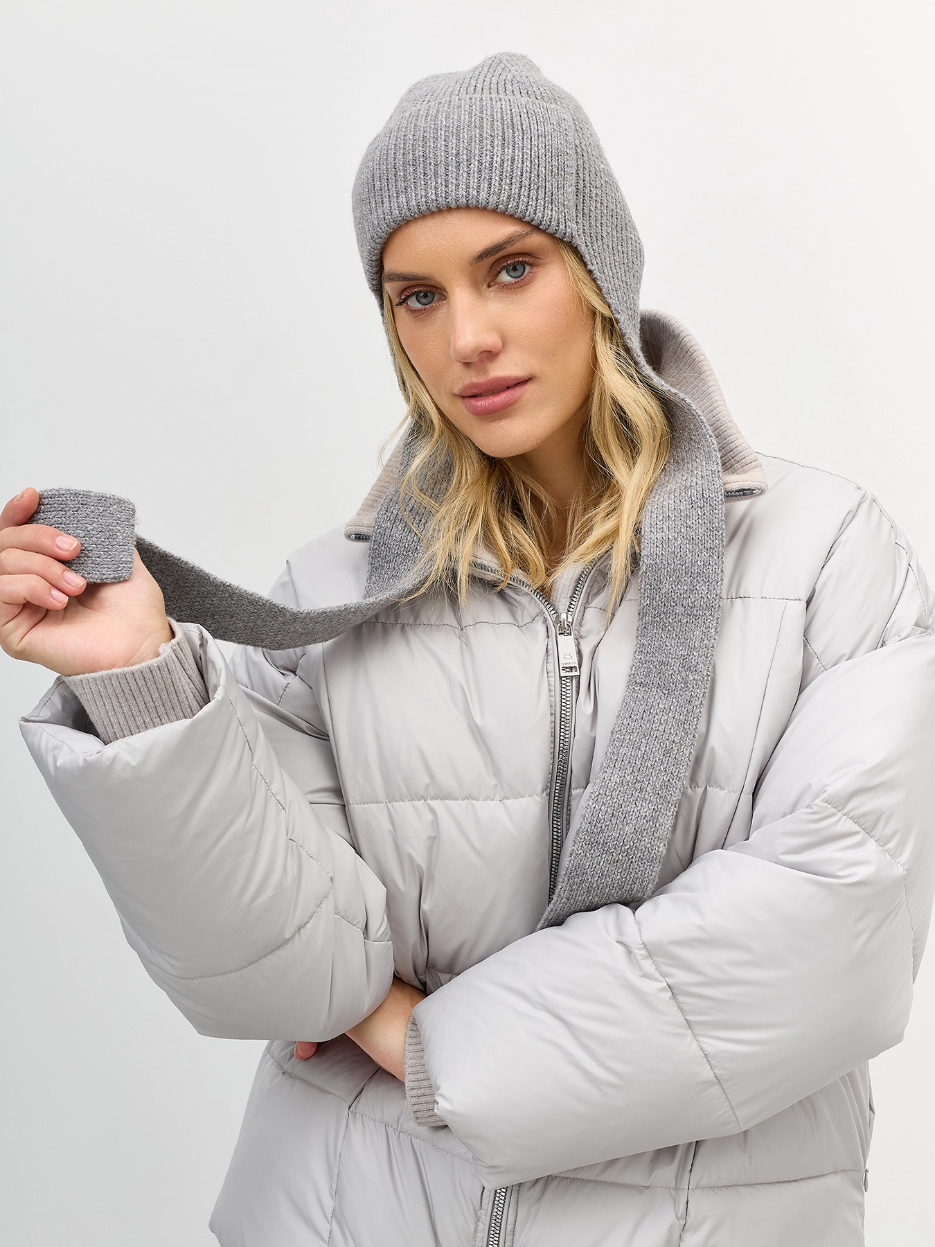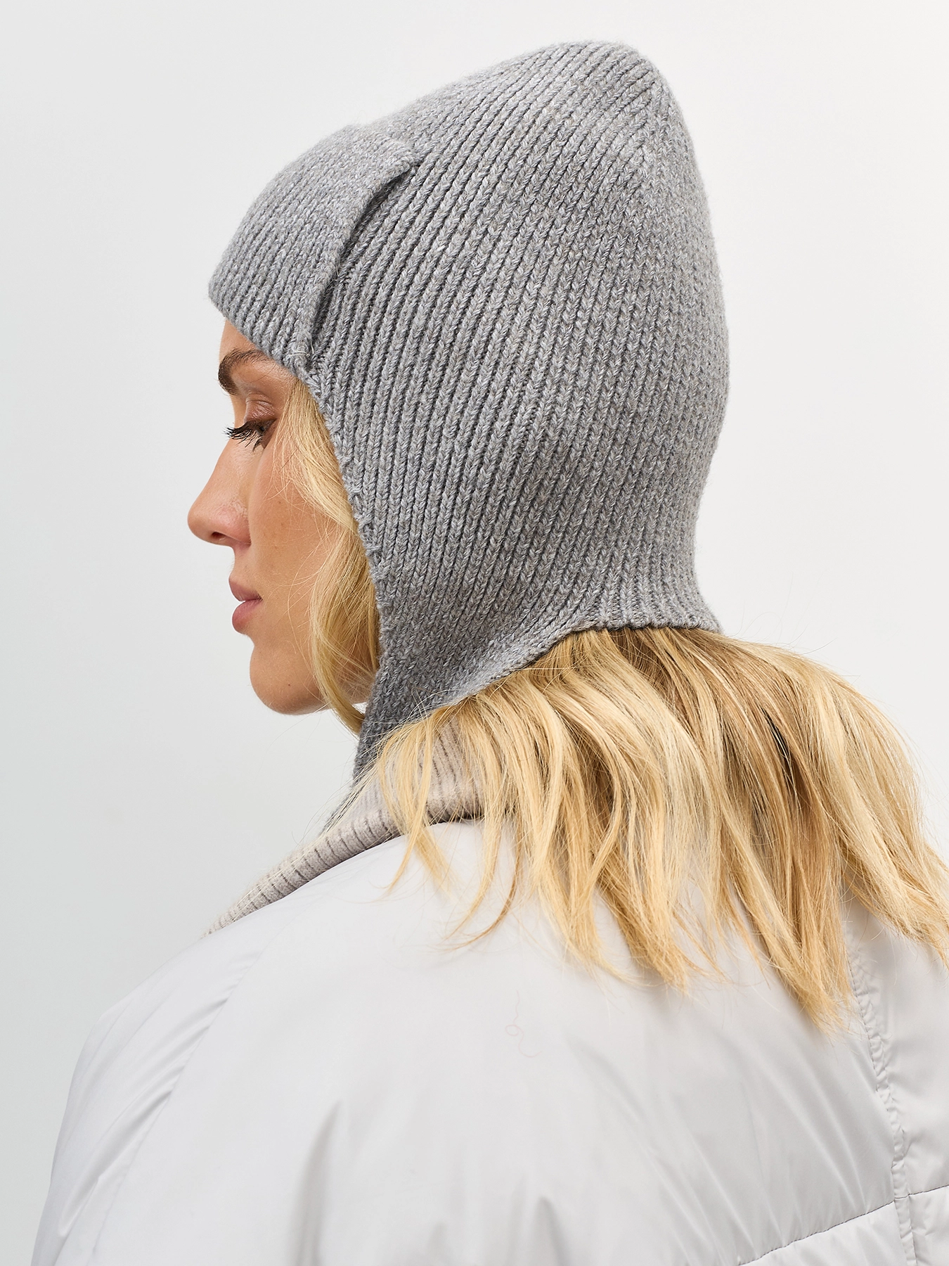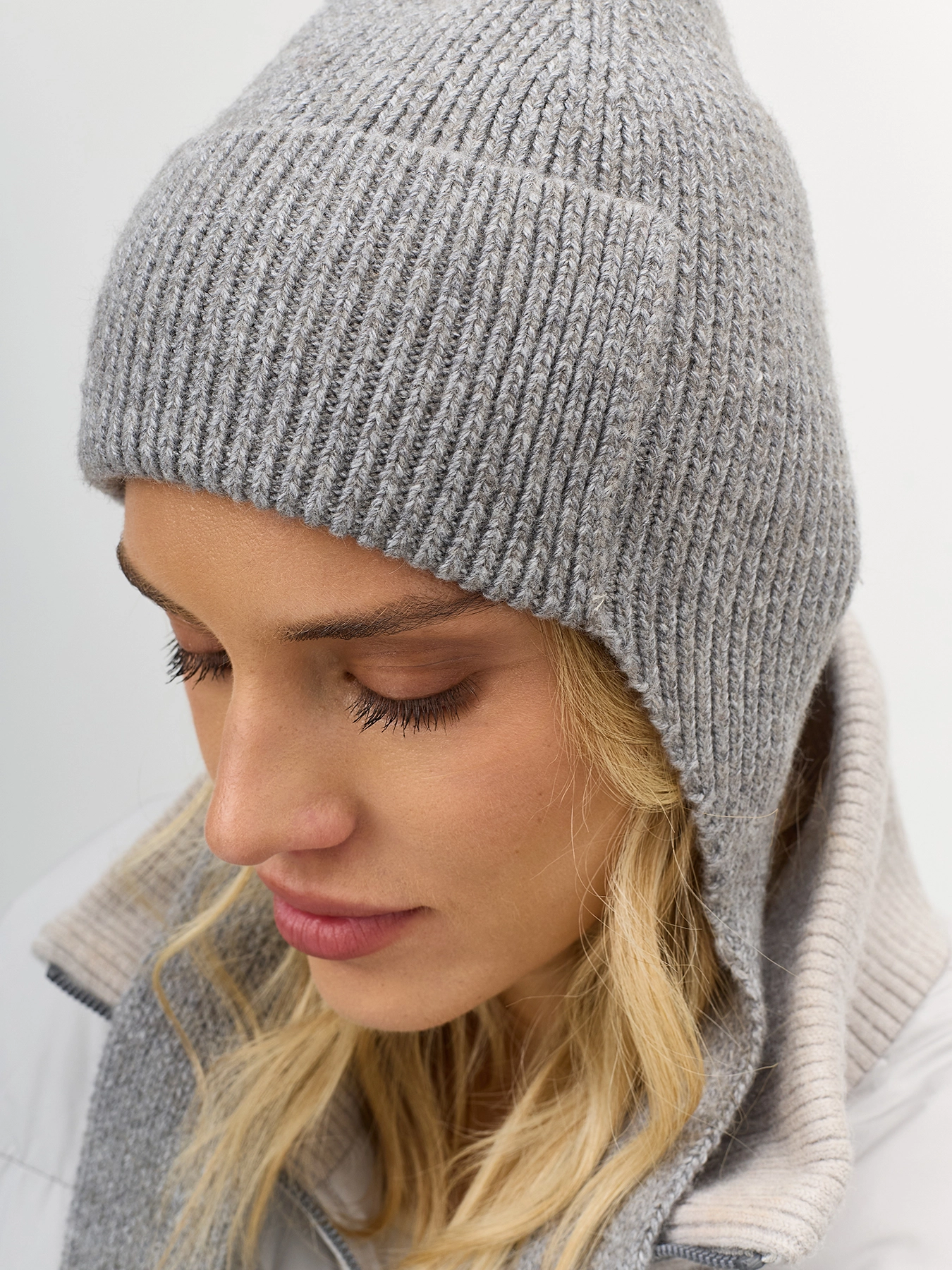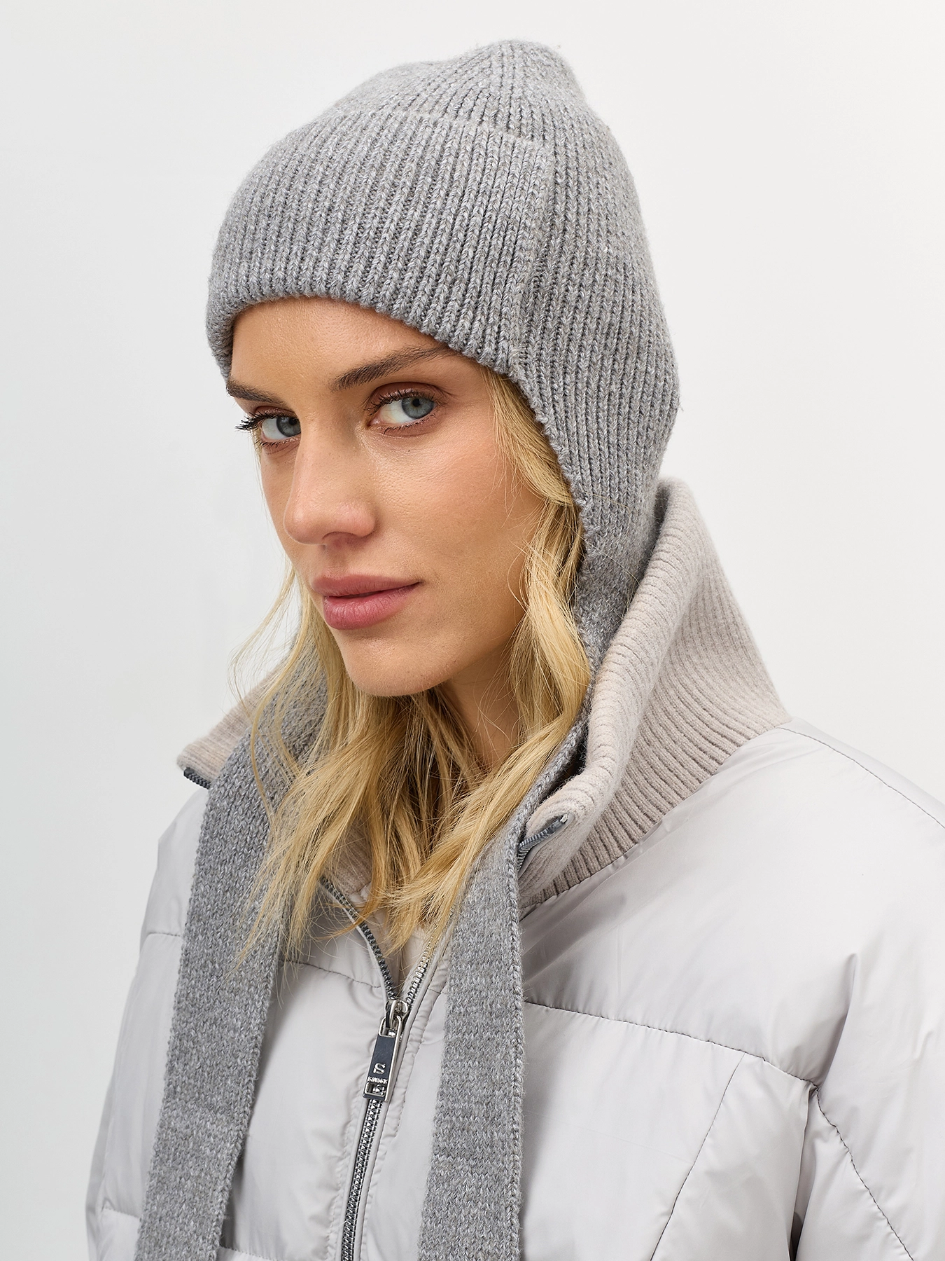 Шапка-чепчик в рубчик с широким отворотом. Широкие завязки. В составе вискоза и шерсть.