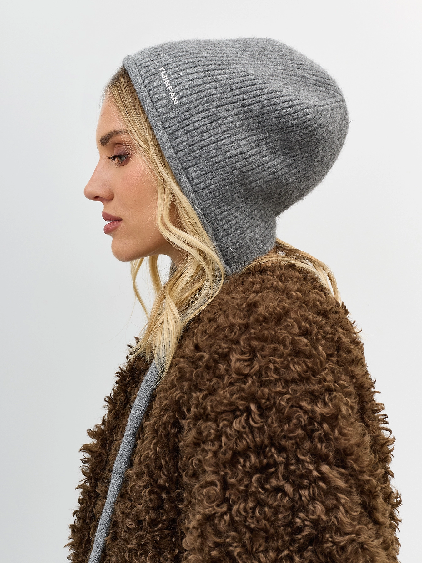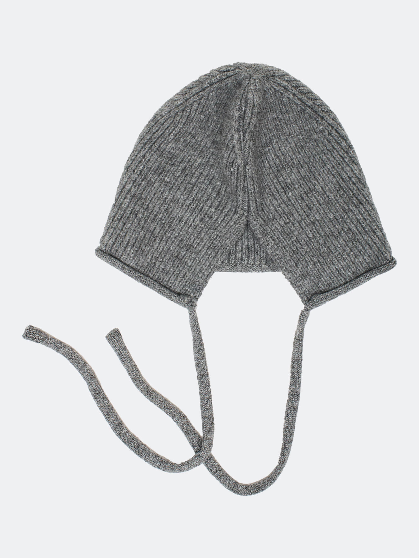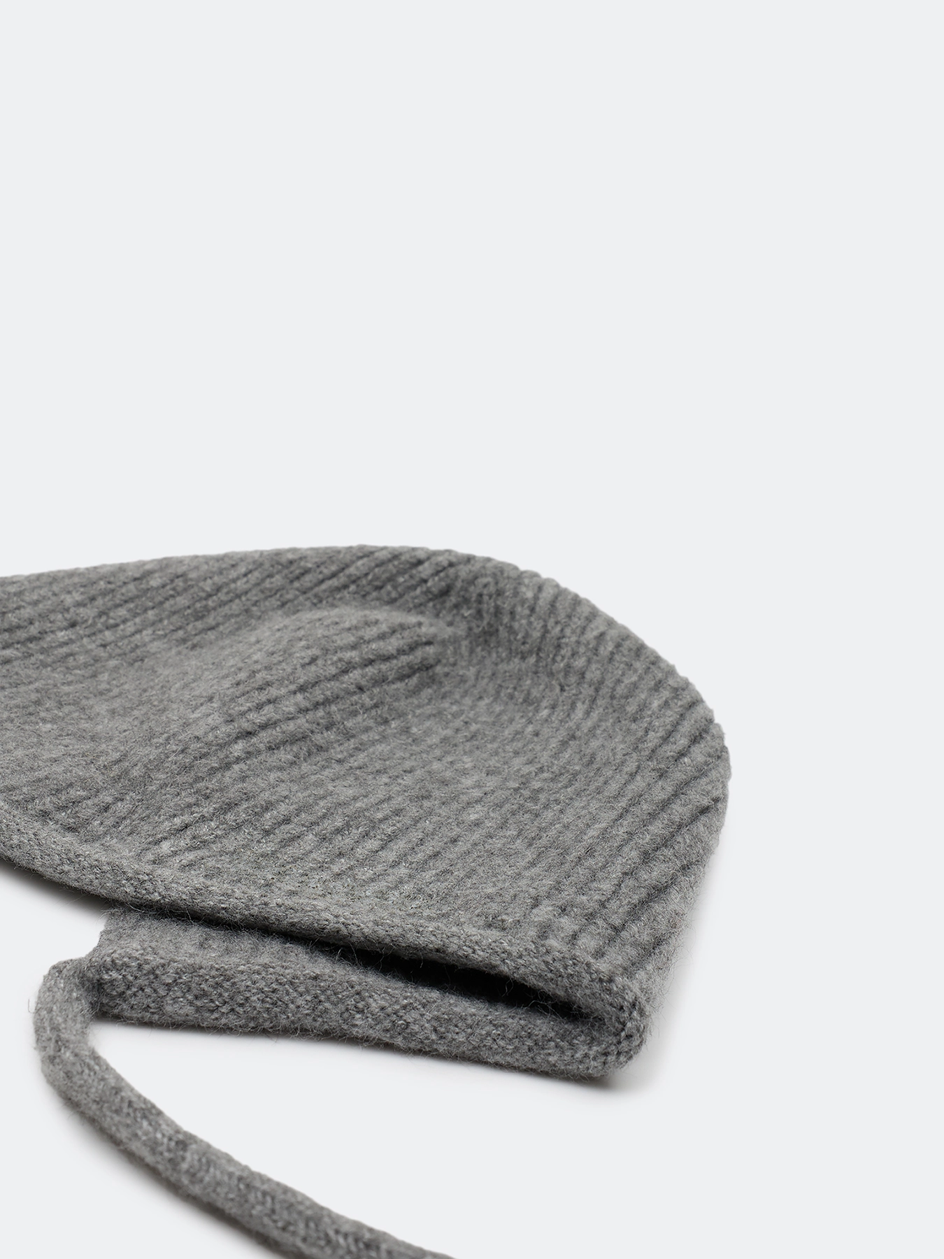 Шапка-чепчик с завязками и закругленным краем вокруг лица. Вязка в рубчик.