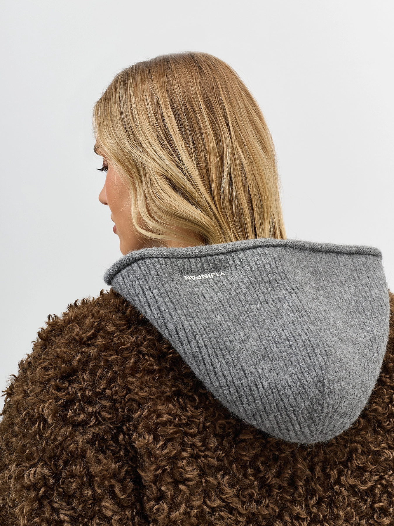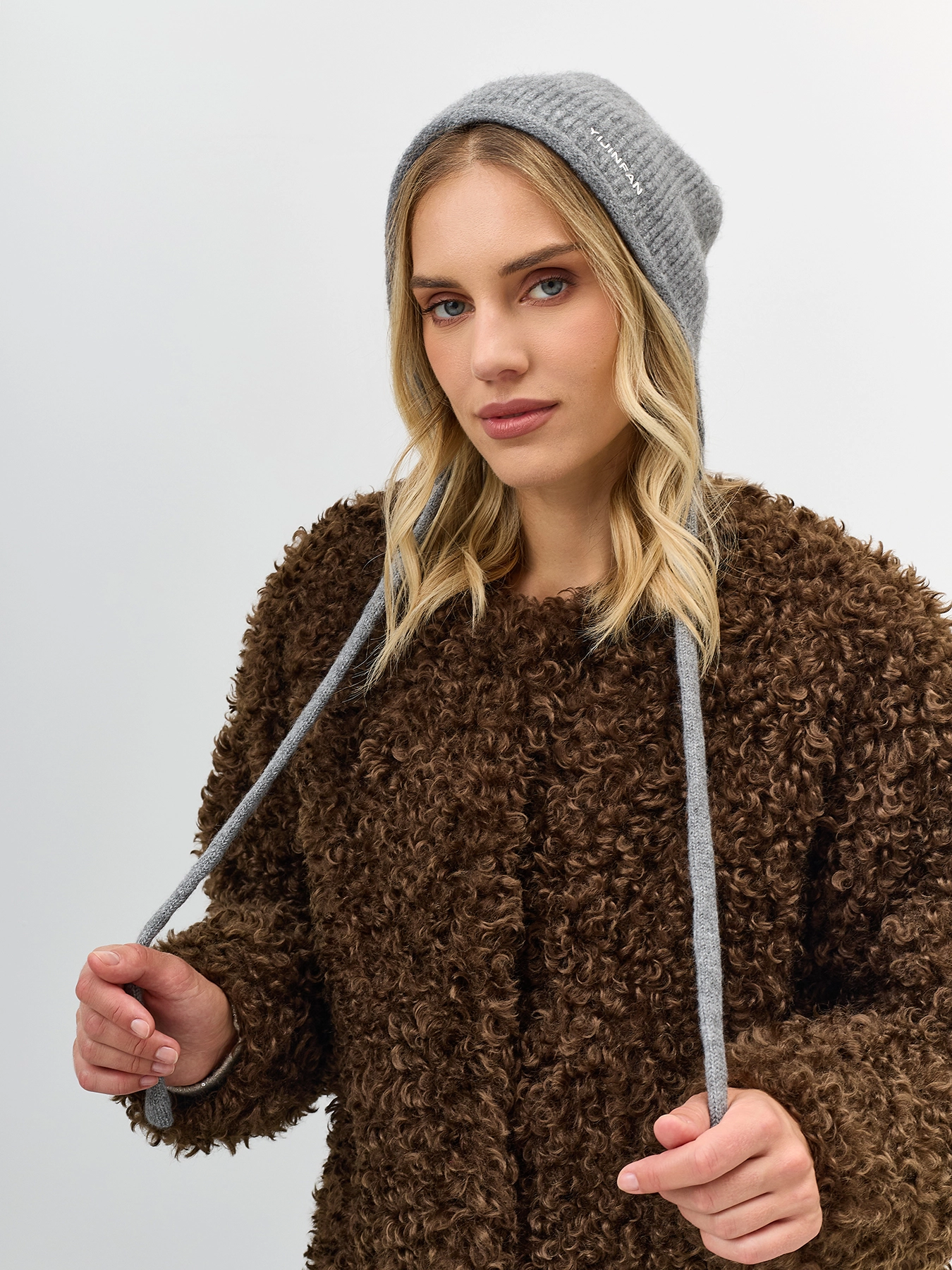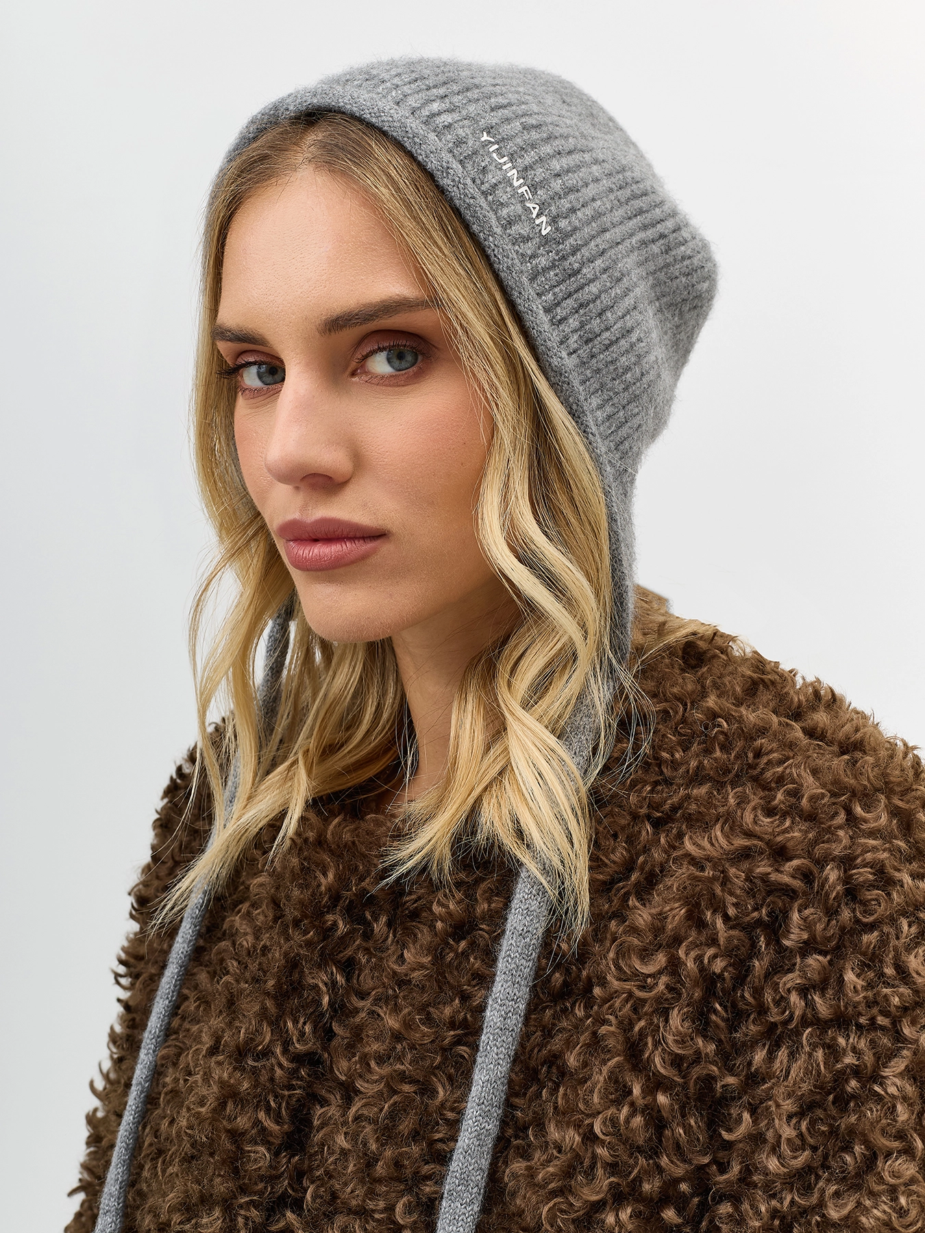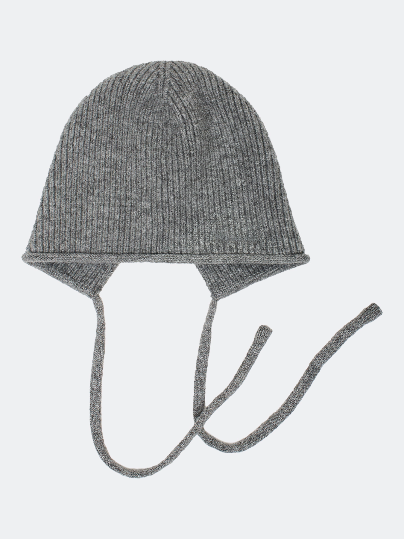 Шапка-чепчик с завязками и закругленным краем вокруг лица. Вязка в рубчик.