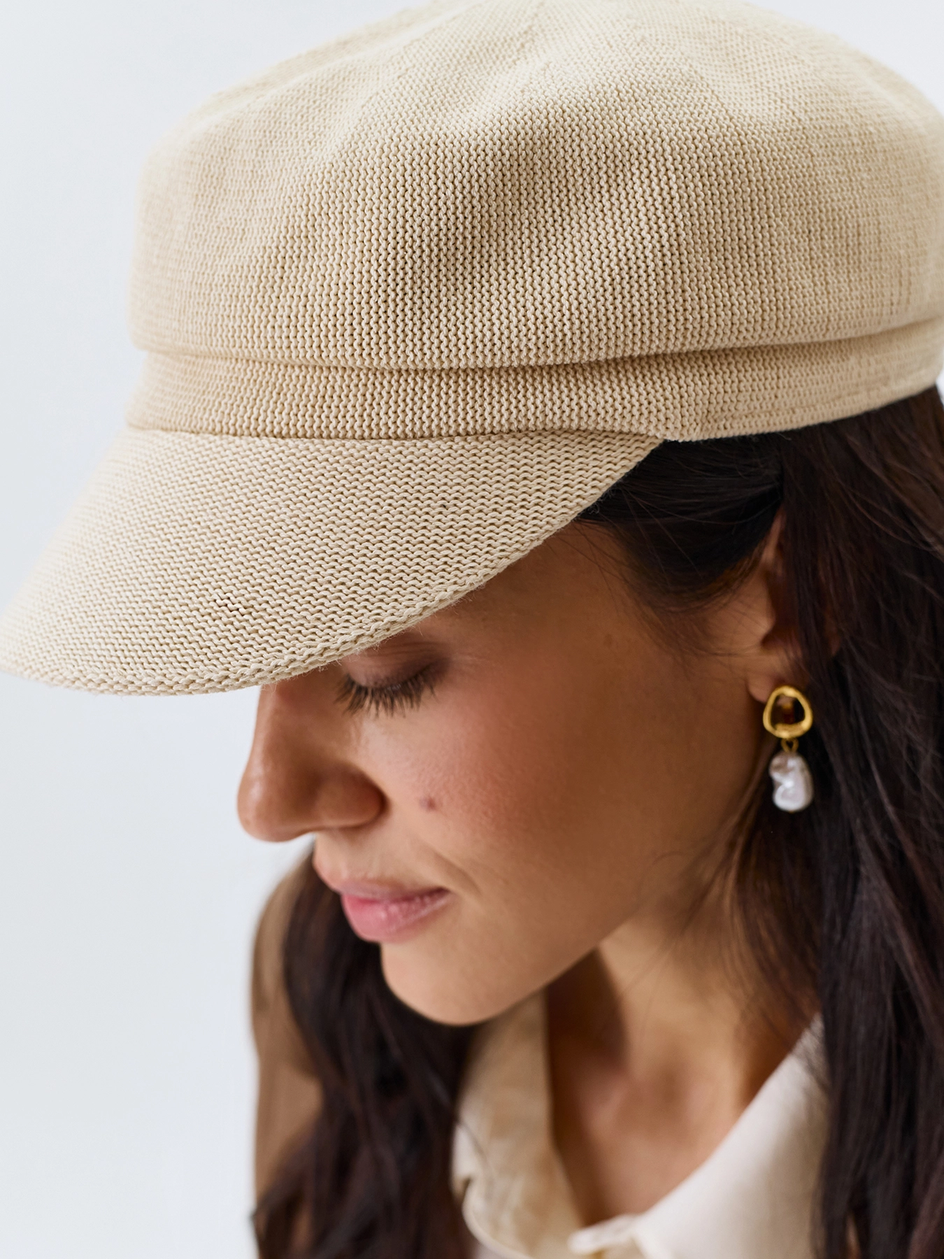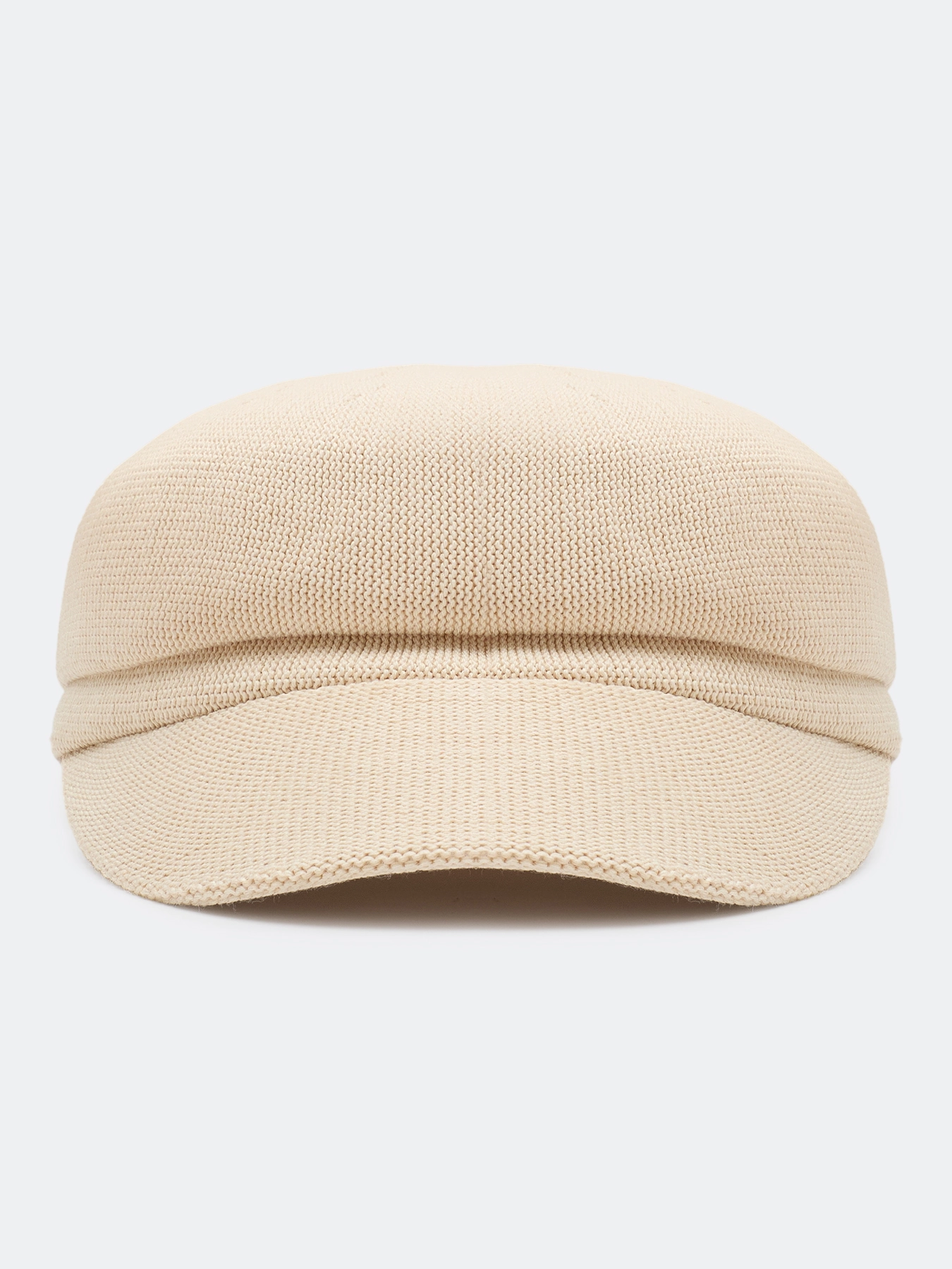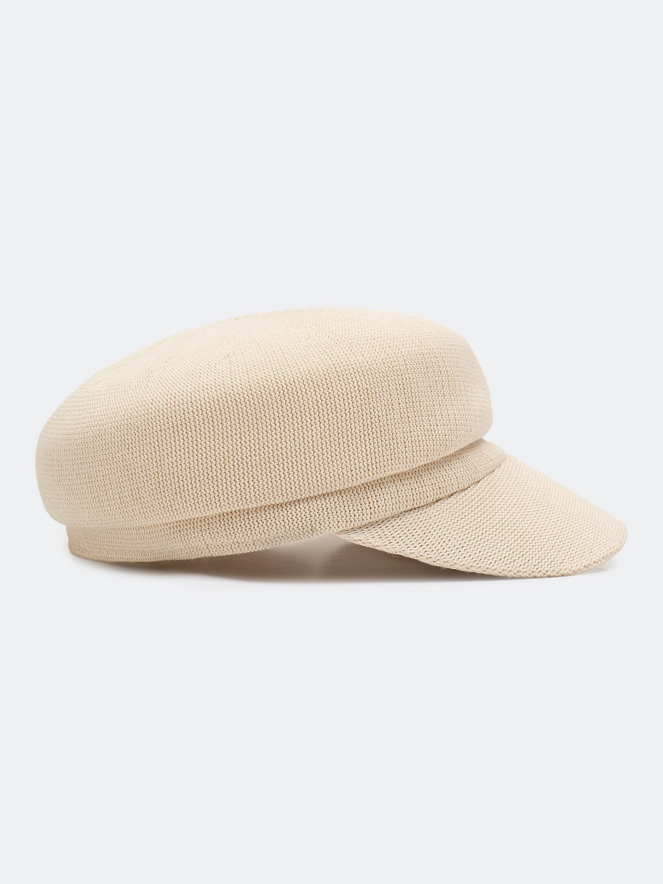 Элегантная вязаная кепи. Широкий изогнутый козырек немного опущен вниз.