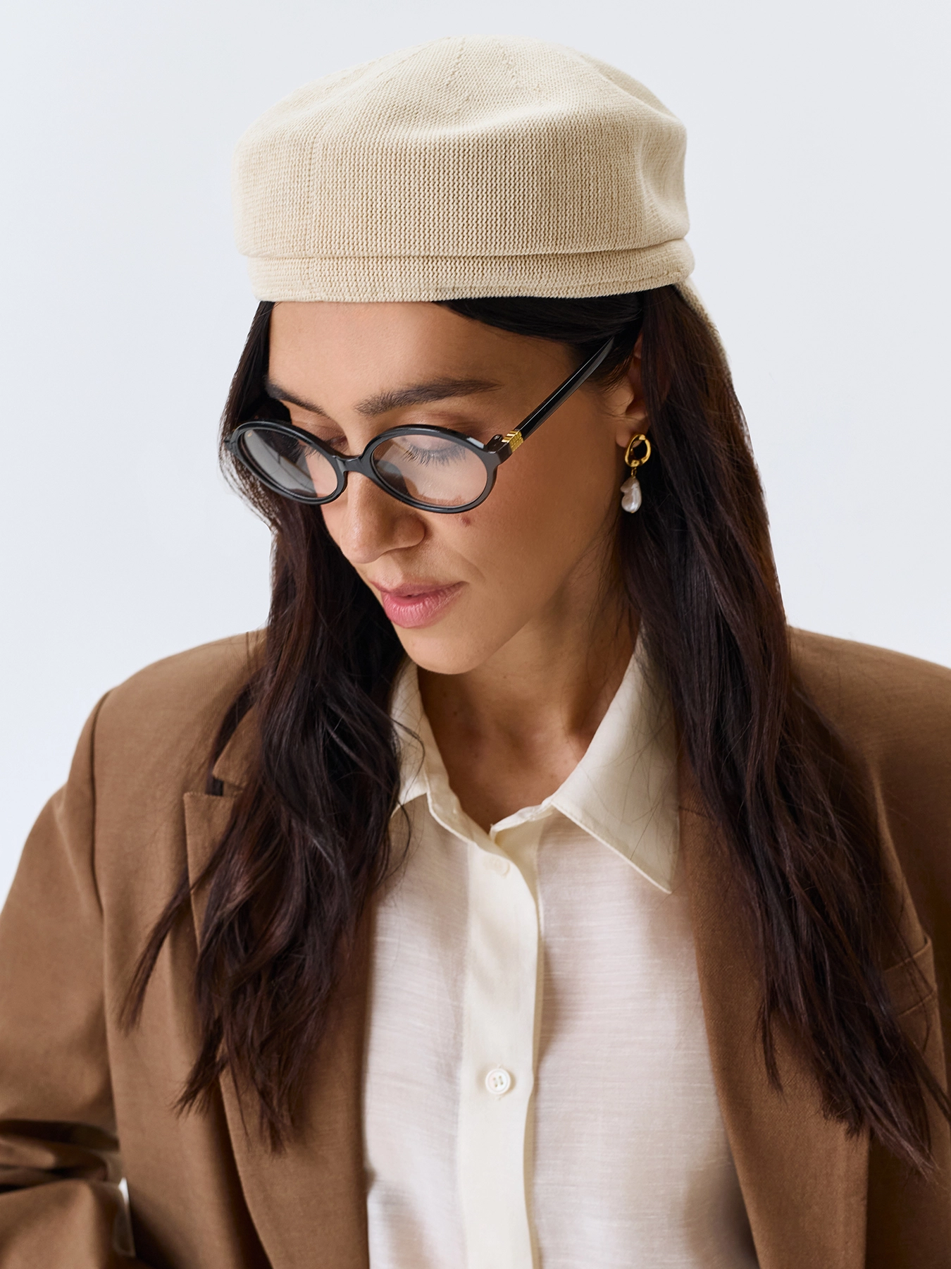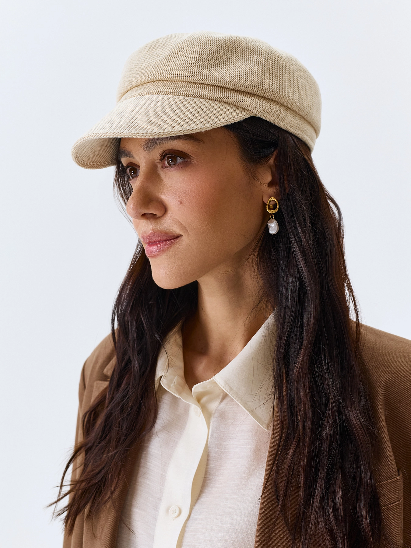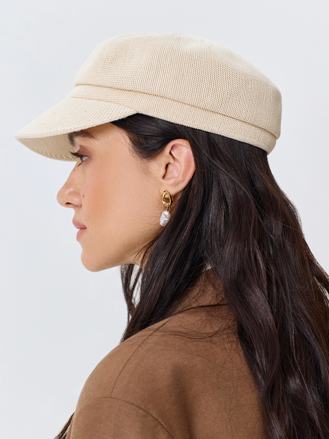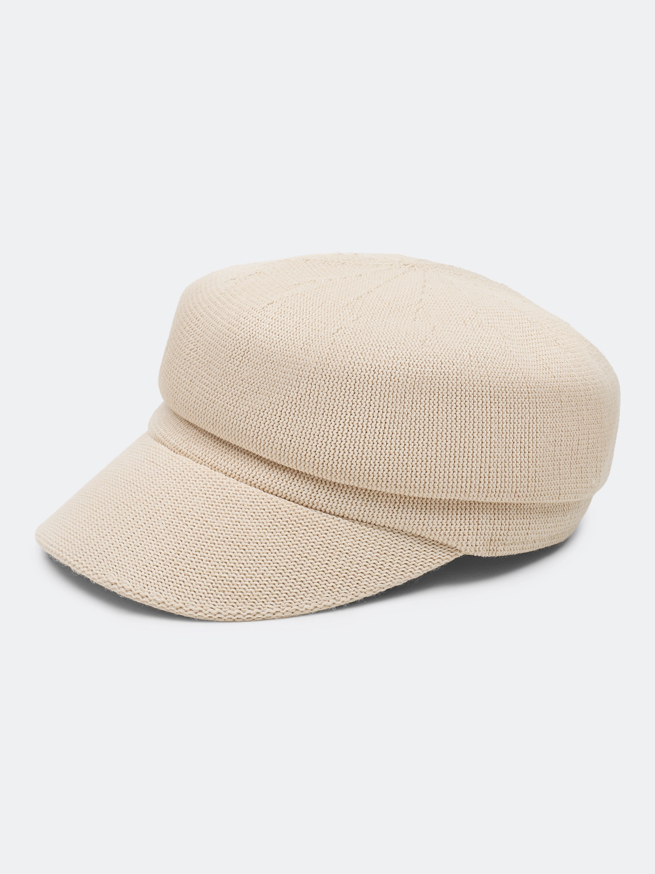 Элегантная вязаная кепи. Широкий изогнутый козырек немного опущен вниз.