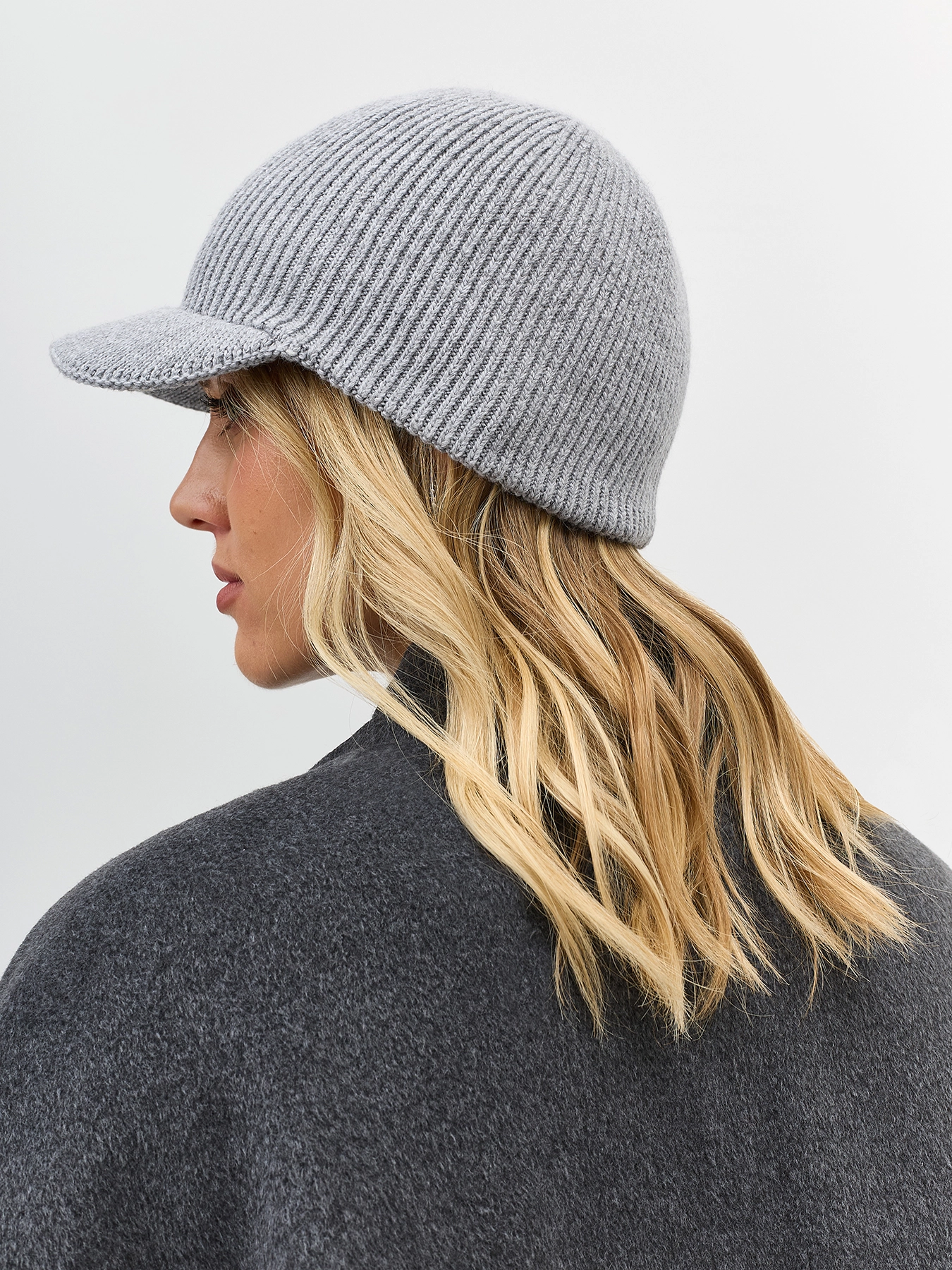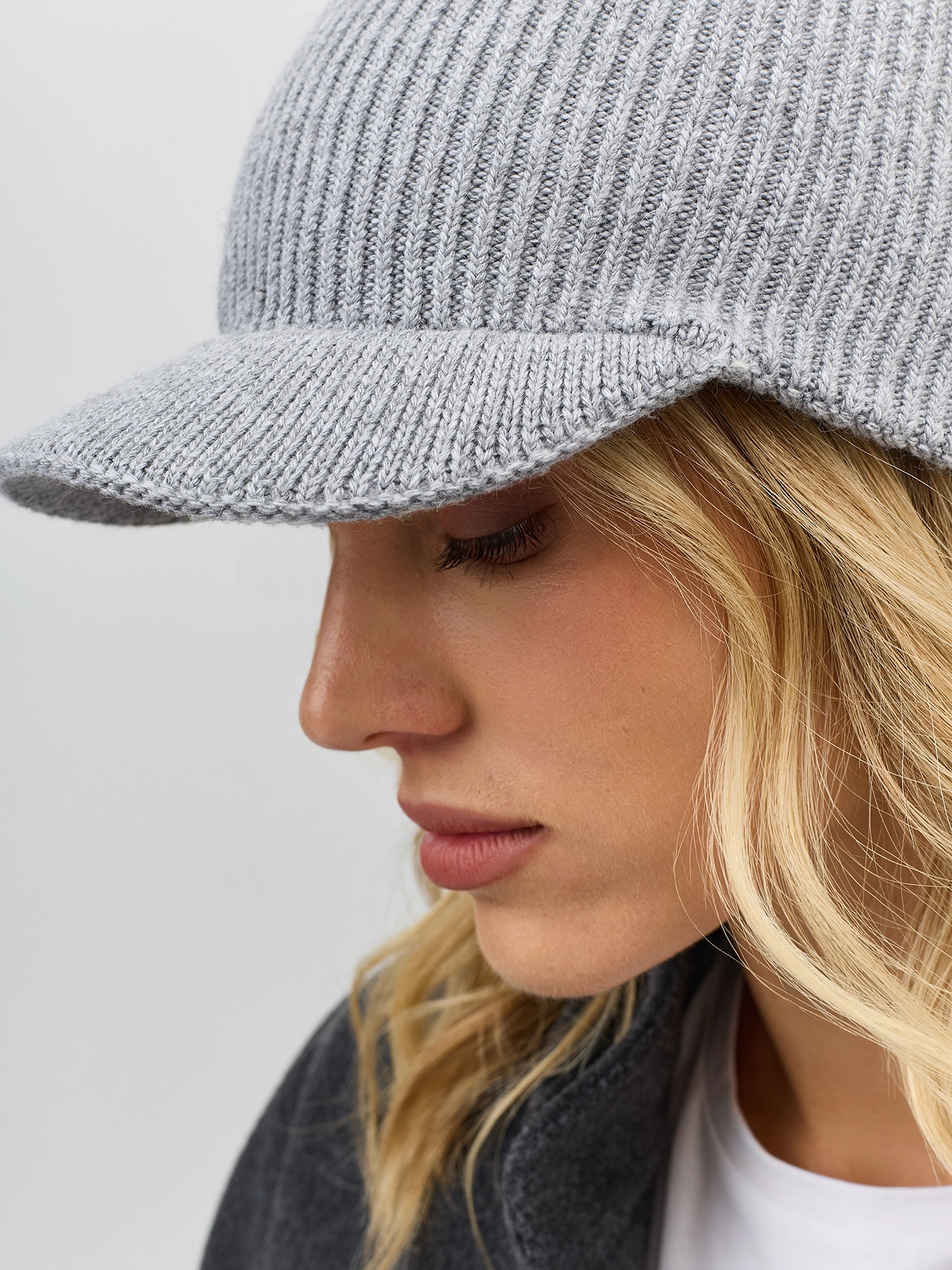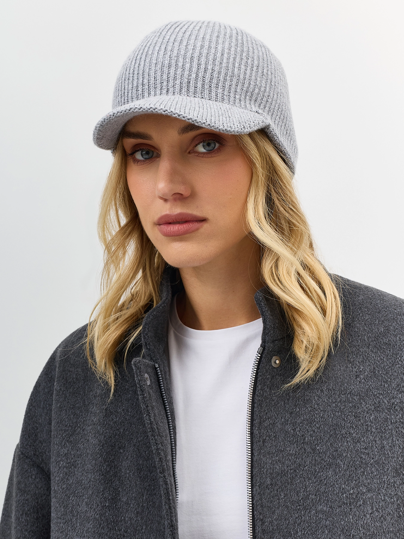 Вязаная кепка в рубчик с изогнутым козырьком. В составе вискоза и ангора.