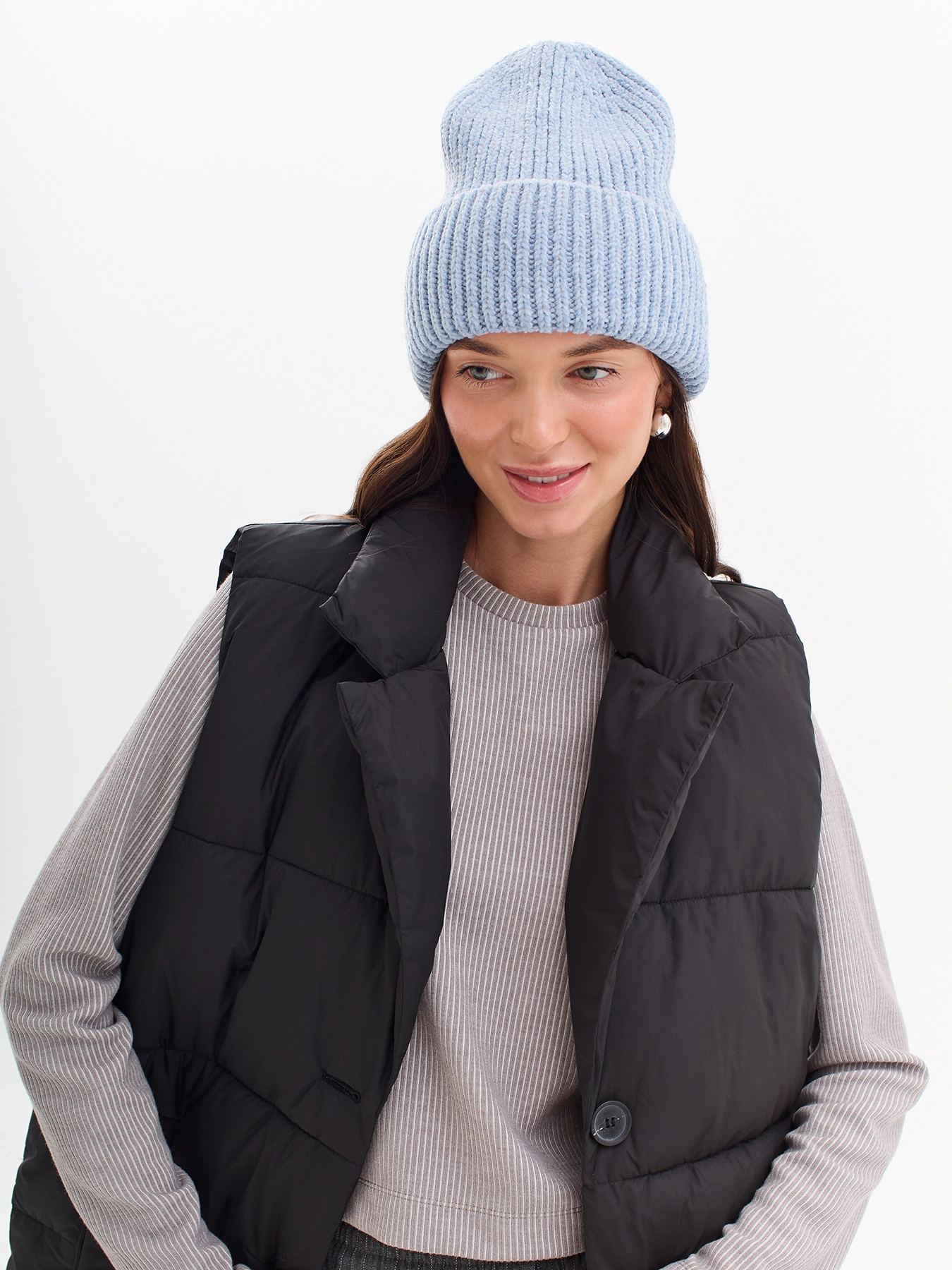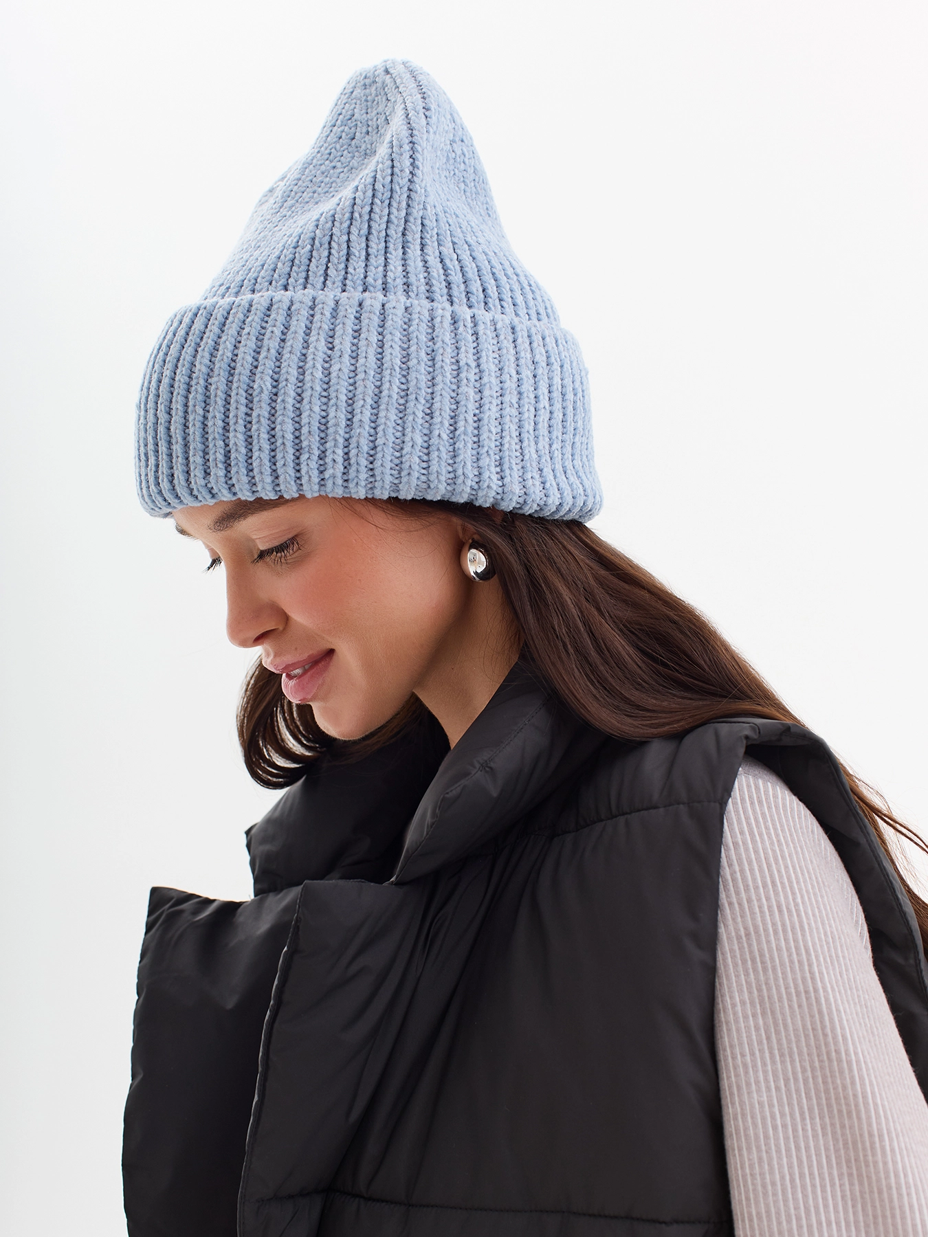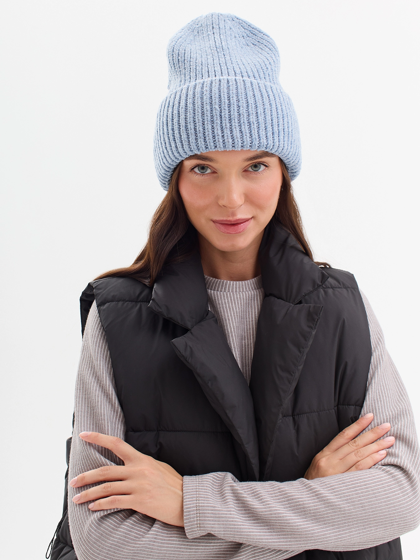 Шапка бини в рубчик с отворотом. Плотное облегание. Вязка в резинку.
