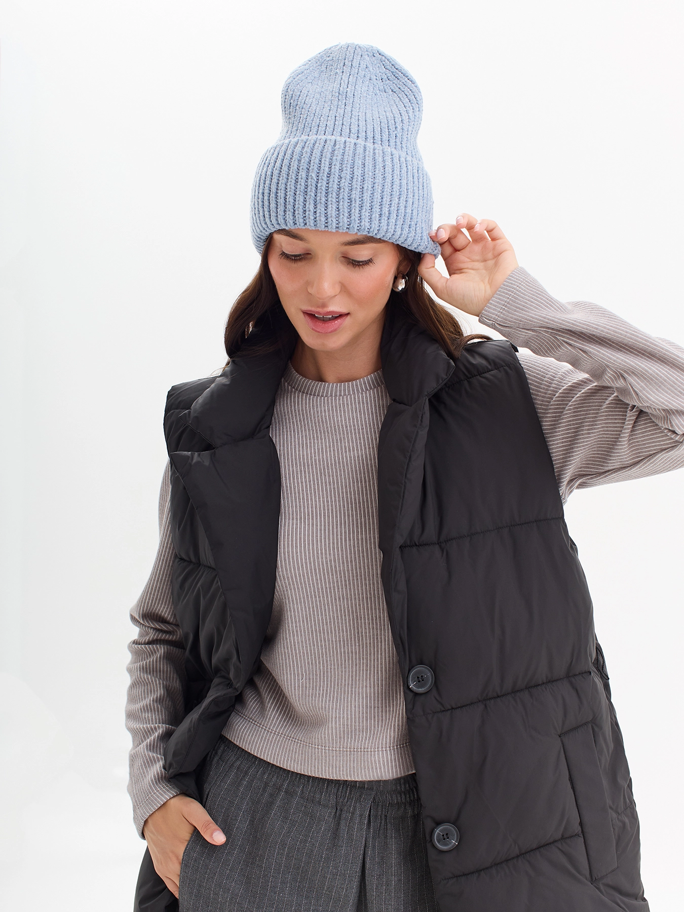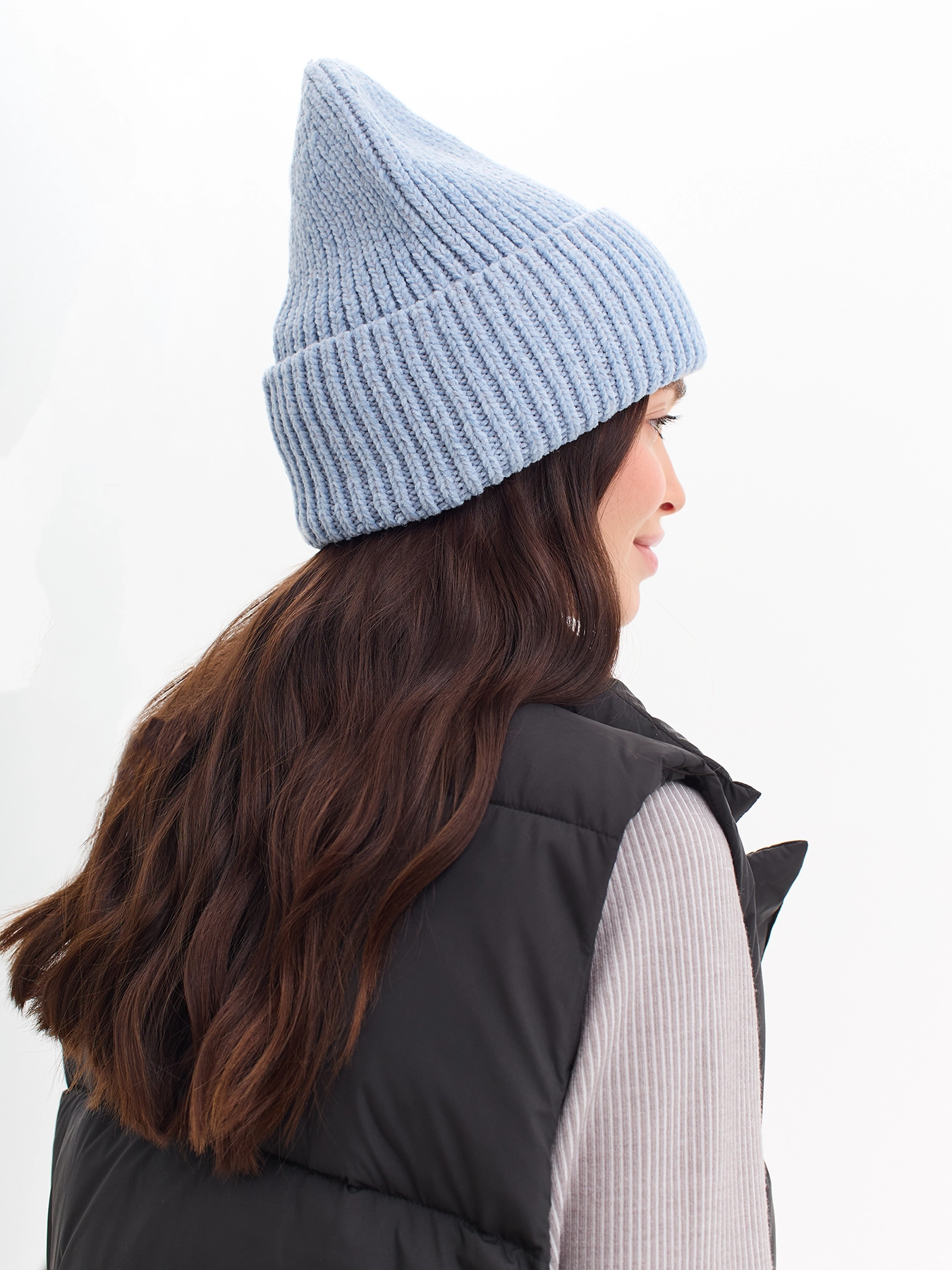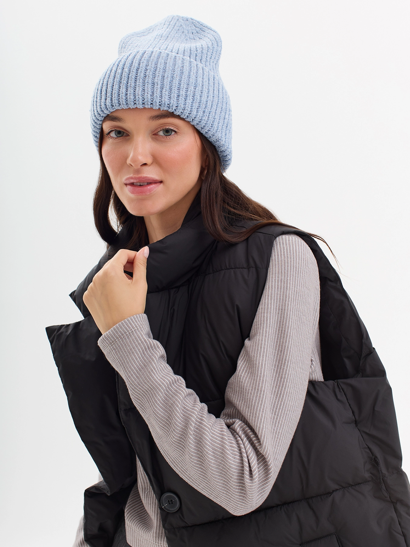 Шапка бини в рубчик с отворотом. Плотное облегание. Вязка в резинку.