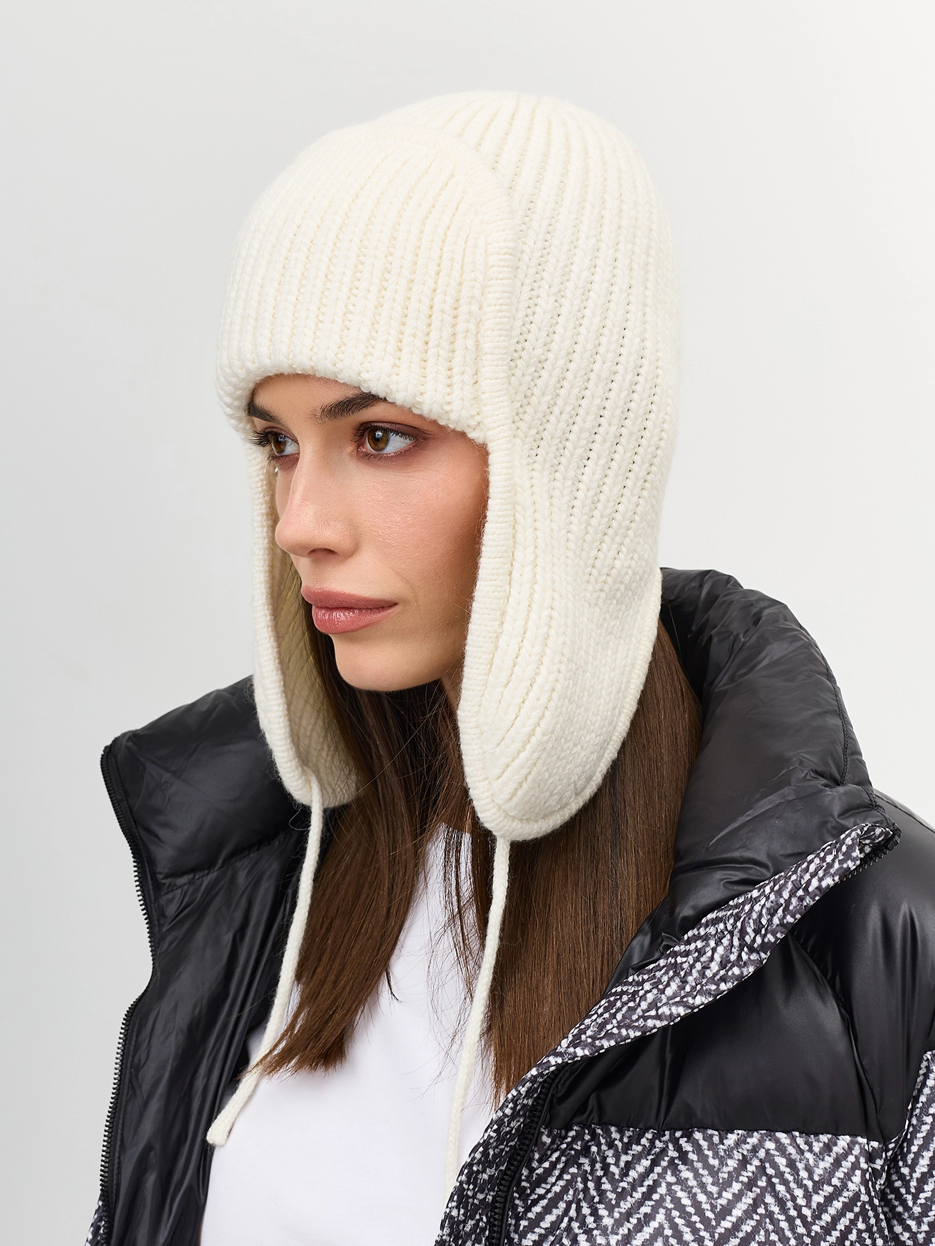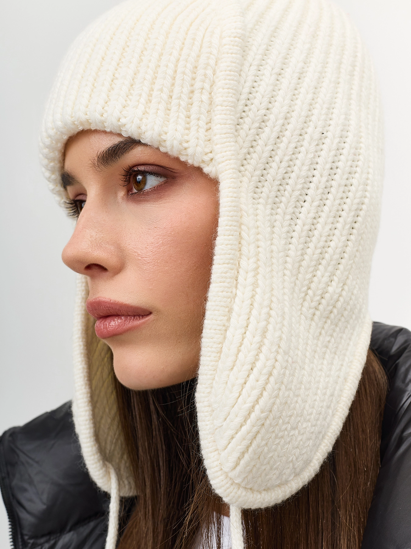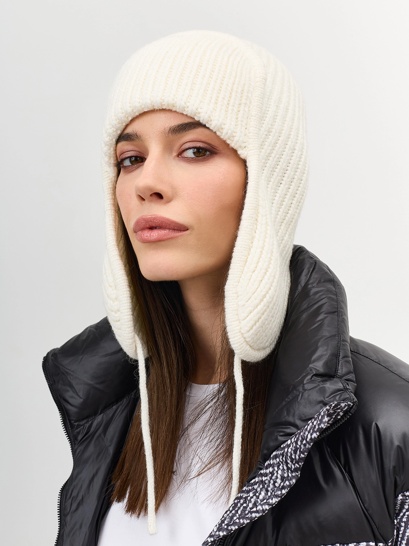 Шапка-ушанка в рубчик с широким отворотом. Тонкие завязки. В составе вискоза и ангора. Комплект с варежками SVG602549.
