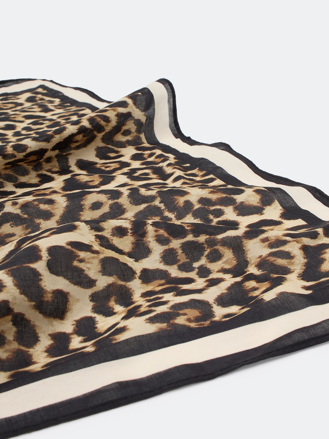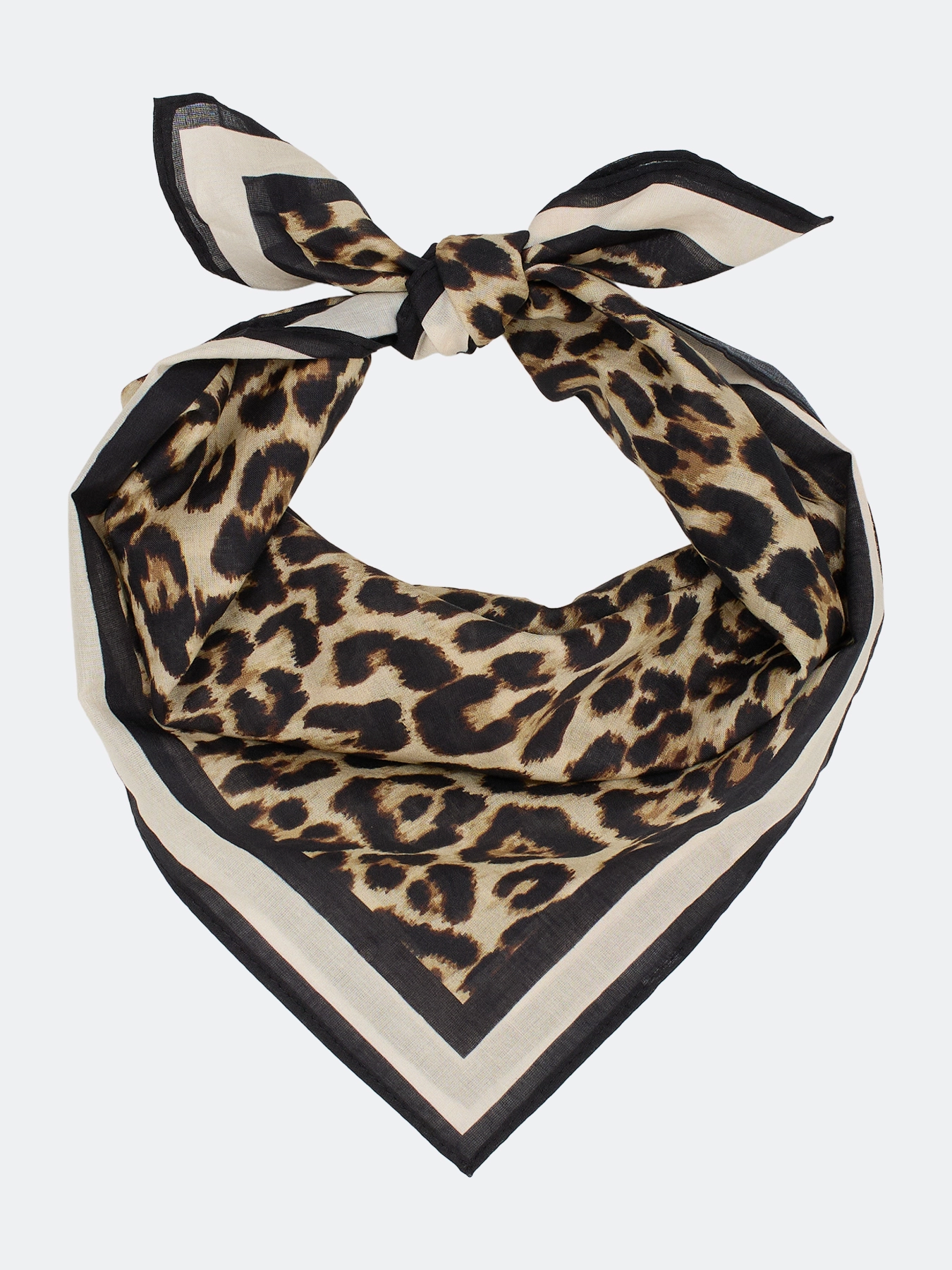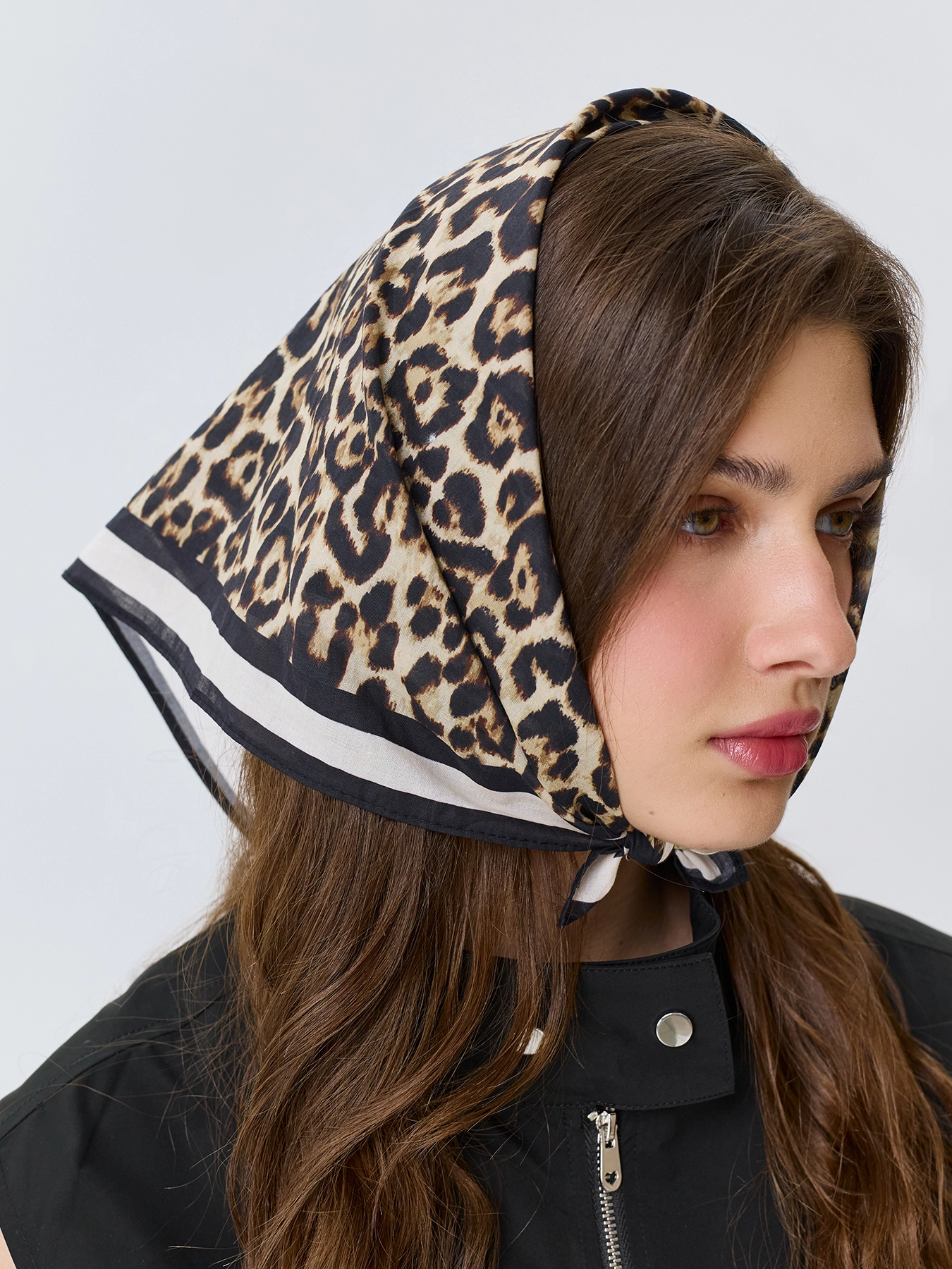 Легкий шейный платок с анималистичным принтом. В составе 100% хлопок. Можно повязать на сумку, использовать как бандану или повязать на шею.