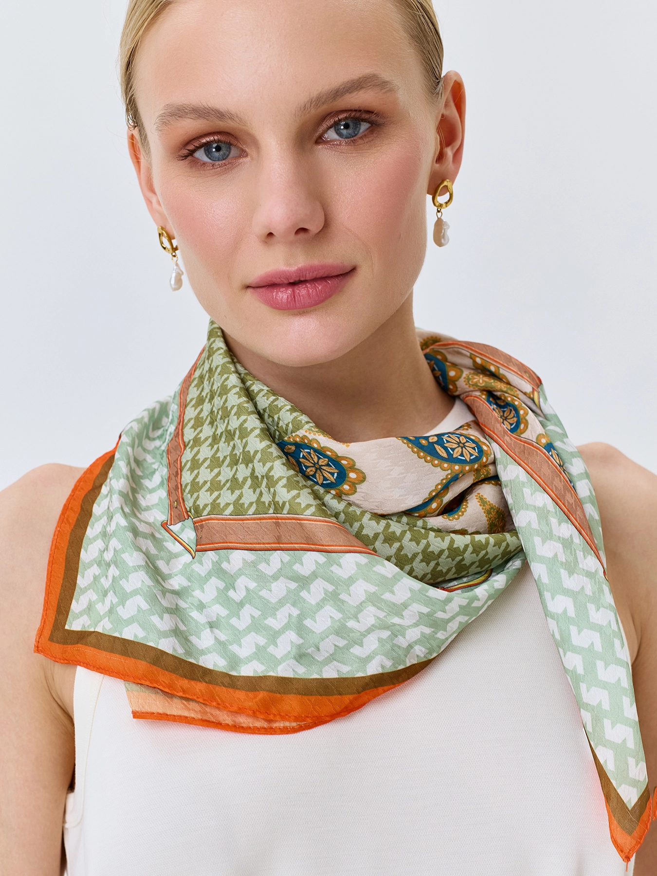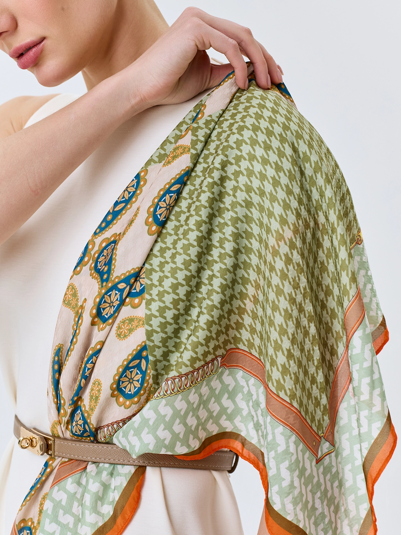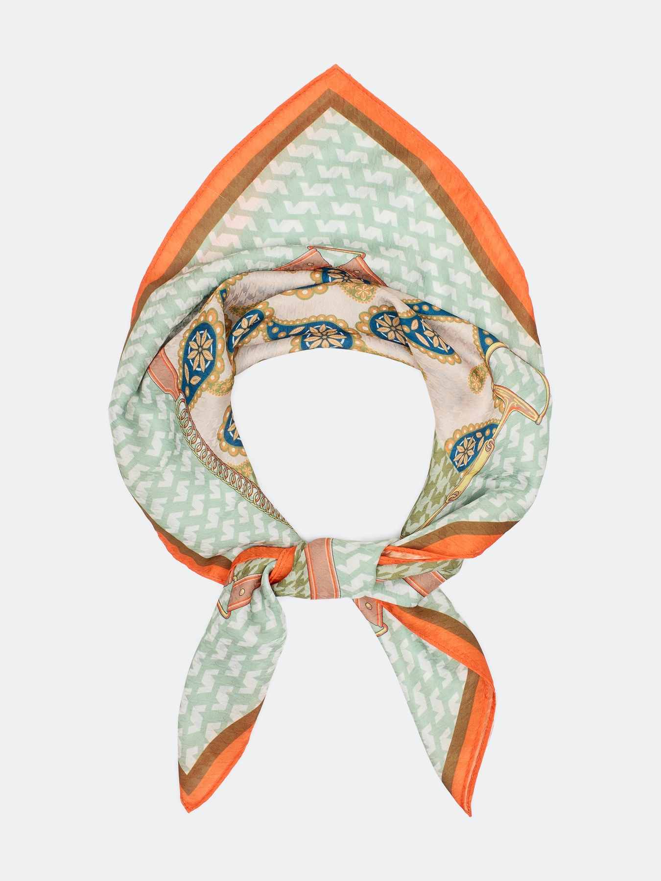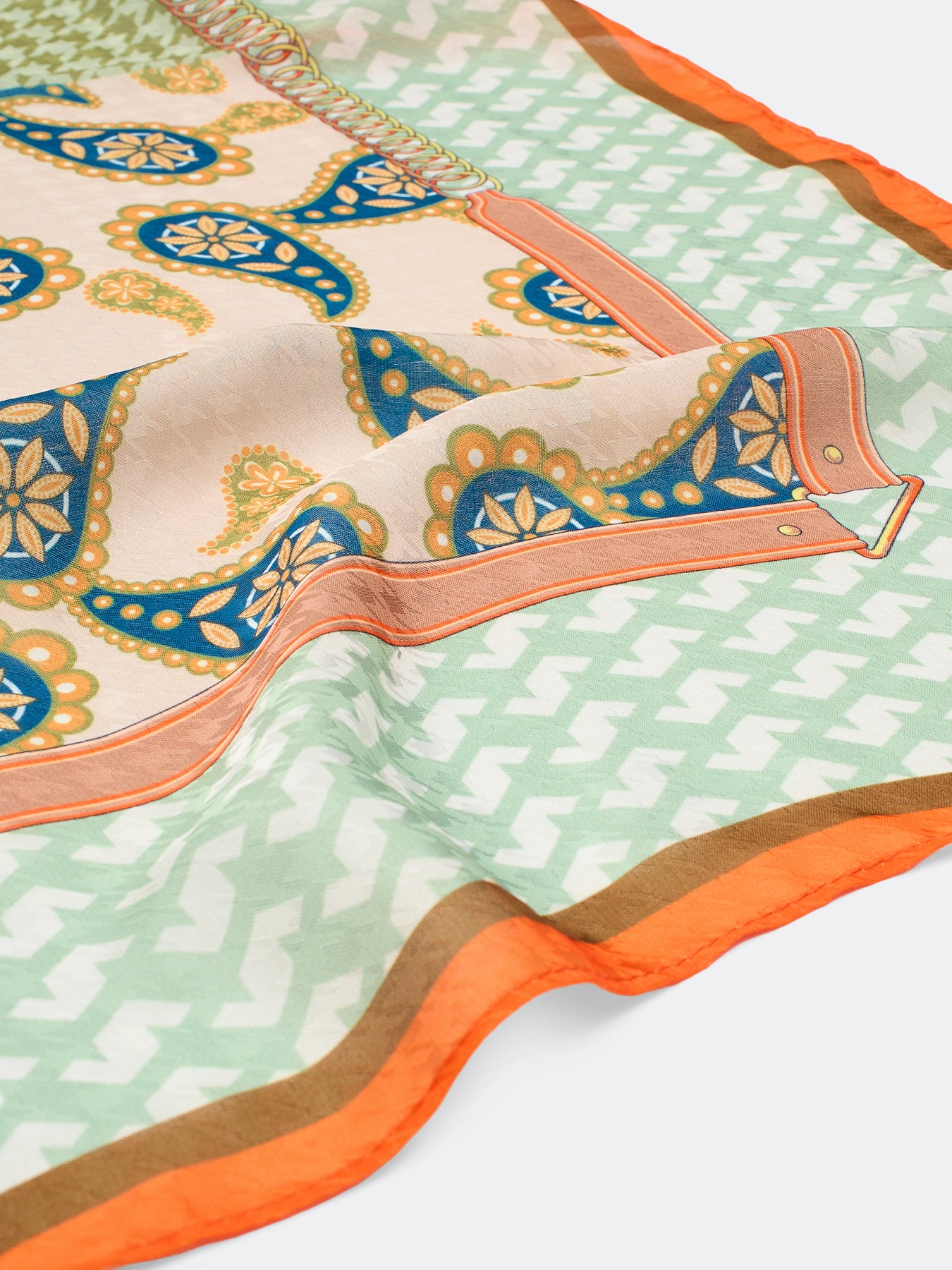 Легкий шейный платок с геометрическим принтом. Можно повязать на сумку, использовать как бандану или повязать на шею.