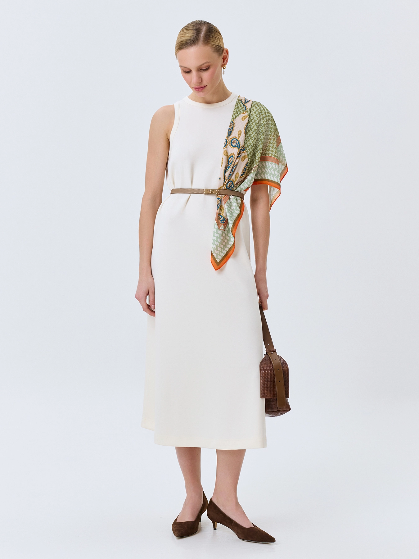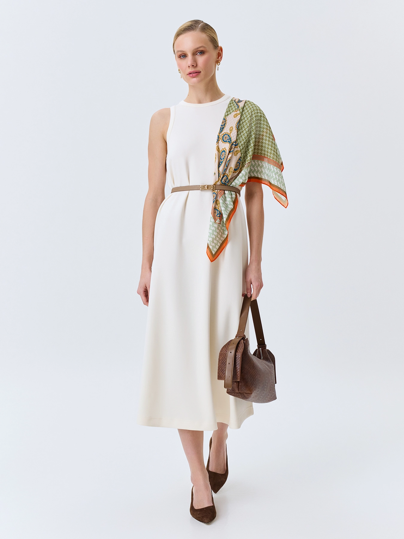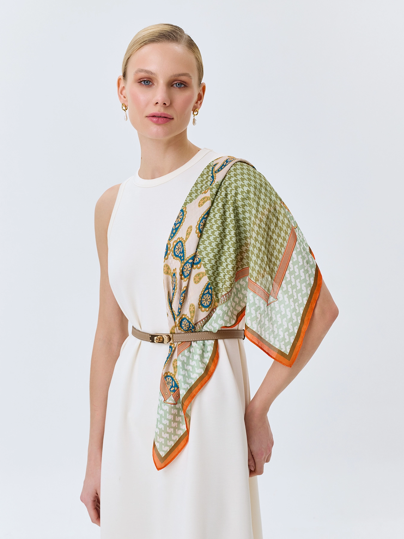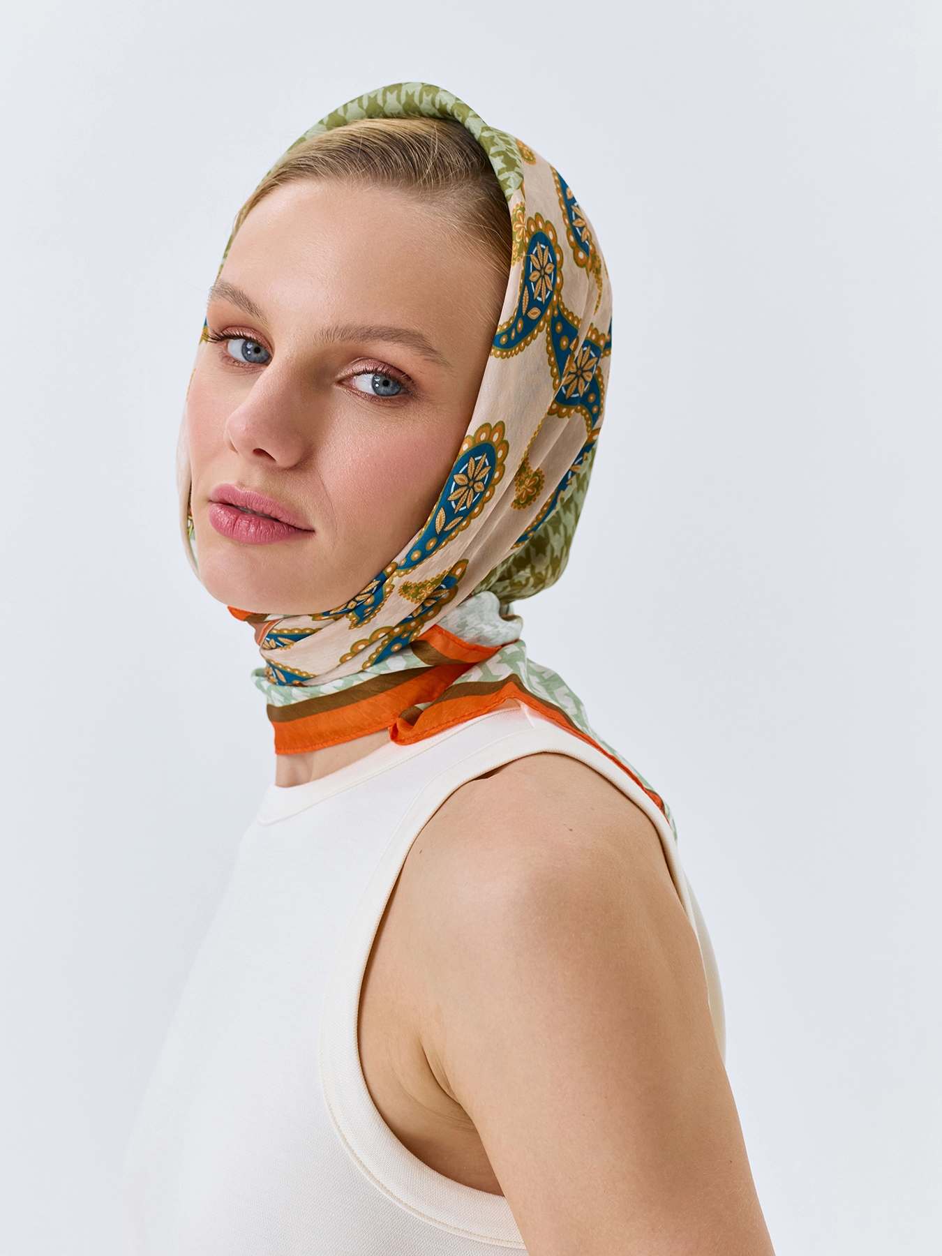 Легкий шейный платок с геометрическим принтом. Можно повязать на сумку, использовать как бандану или повязать на шею.