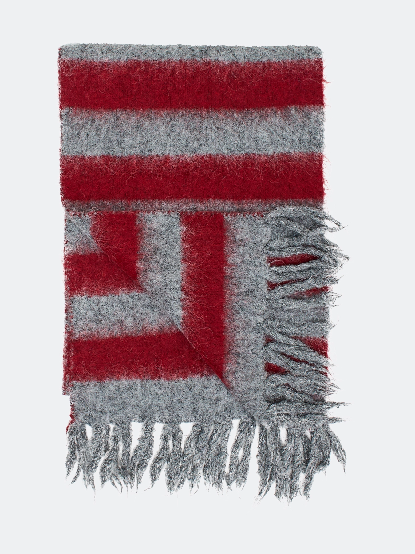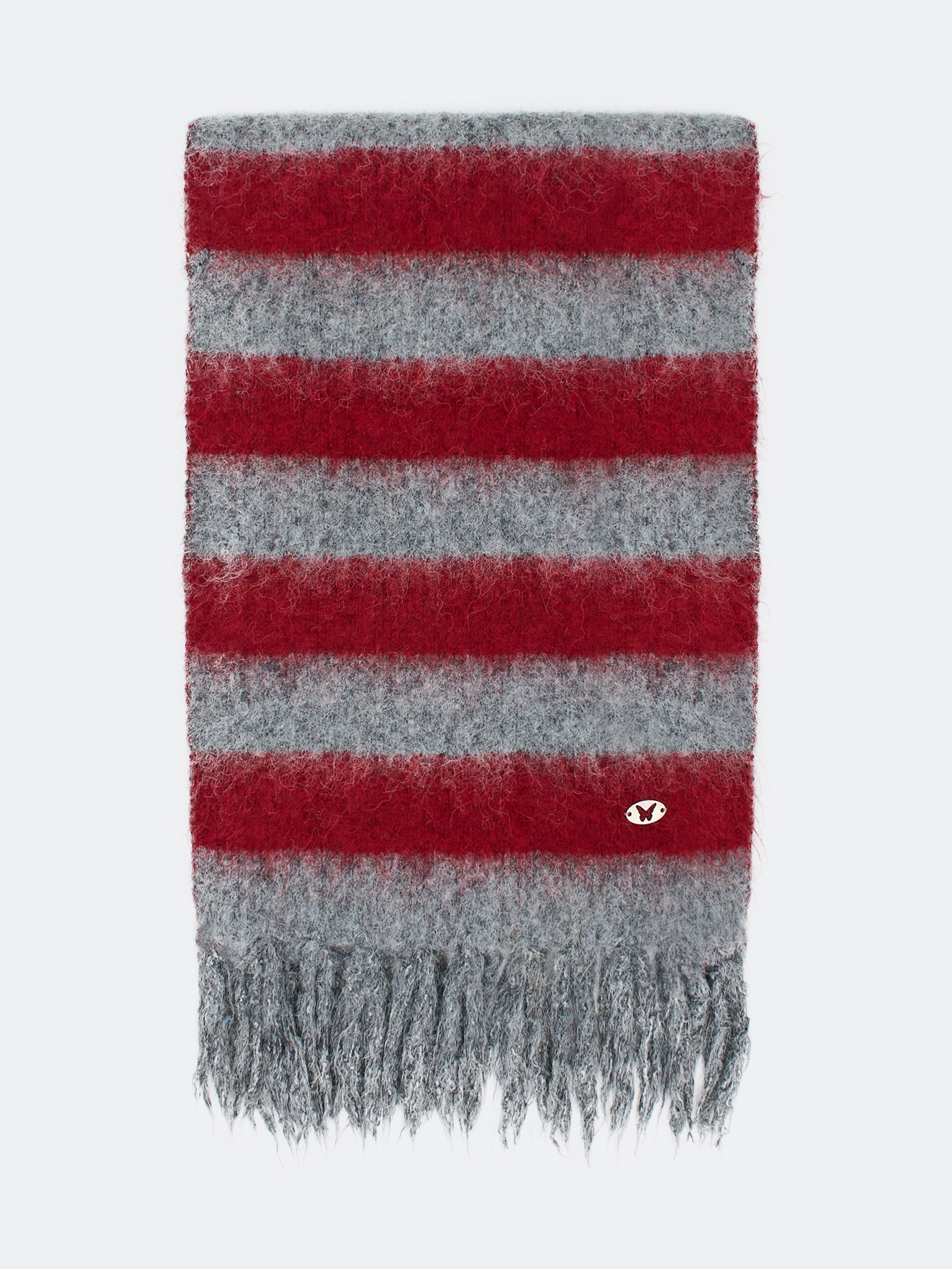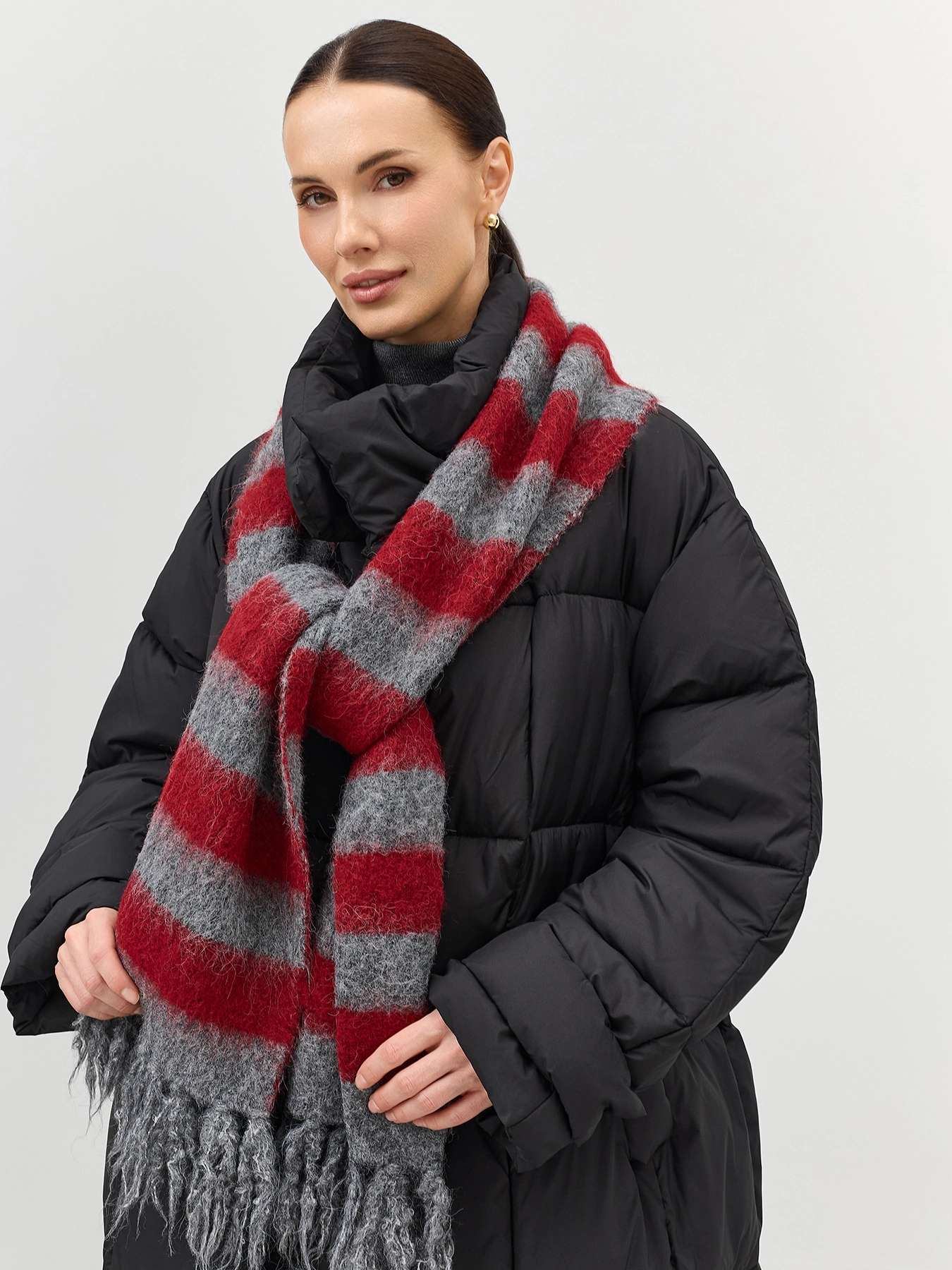 Яркий шарф из объемной пряжи с добавлением шерсти в широкую полоску. Деликатная бахрома по низу. Дополнен металлической деталью. Прямоугольная форма, one size