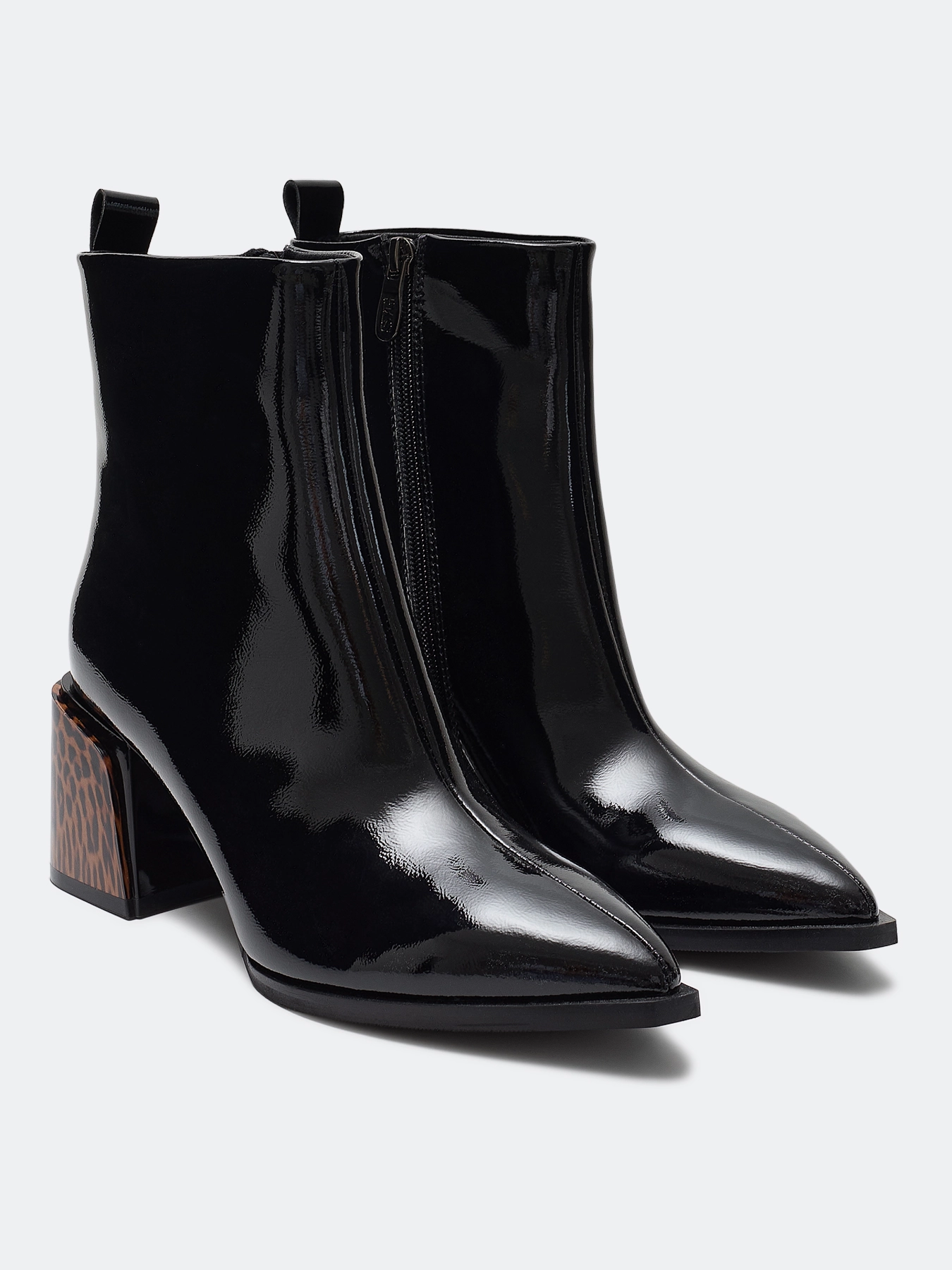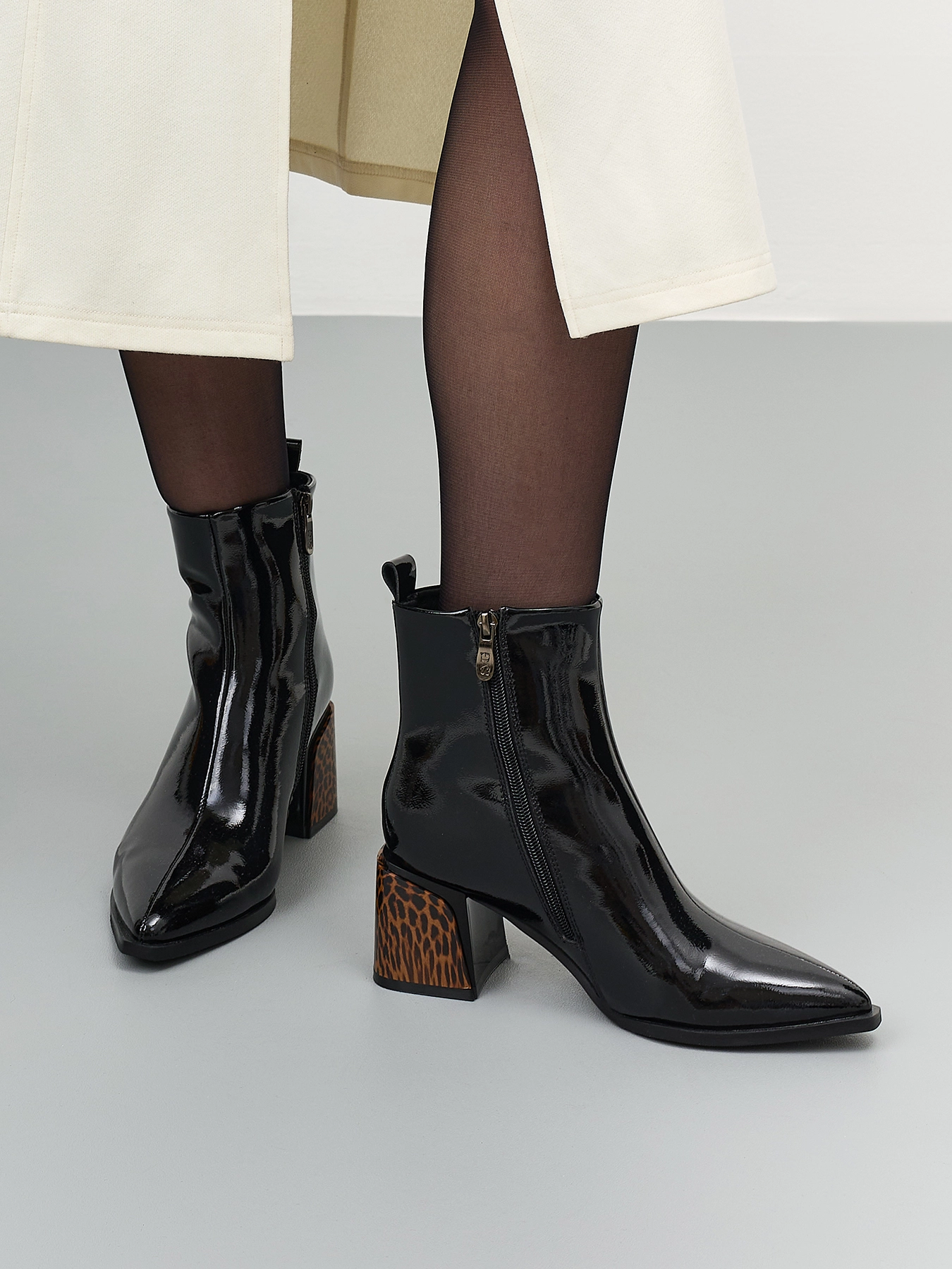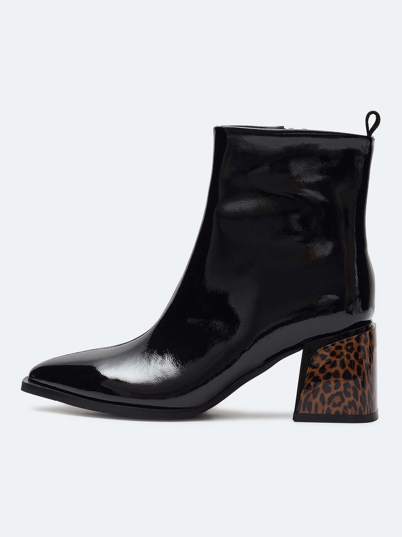 Ботильоны из лаковой кожи и контрастным каблуком с анималистичным принтом. Заостренный мыс. Тонкая подошва из термопластичной резины. Застежка на молнию с внутренней стороны. Устойчивый каблук средней высоты и подошва из резины обеспечивают комфорт при ходьбе. Подкладка и стелька из теплого текстиля.