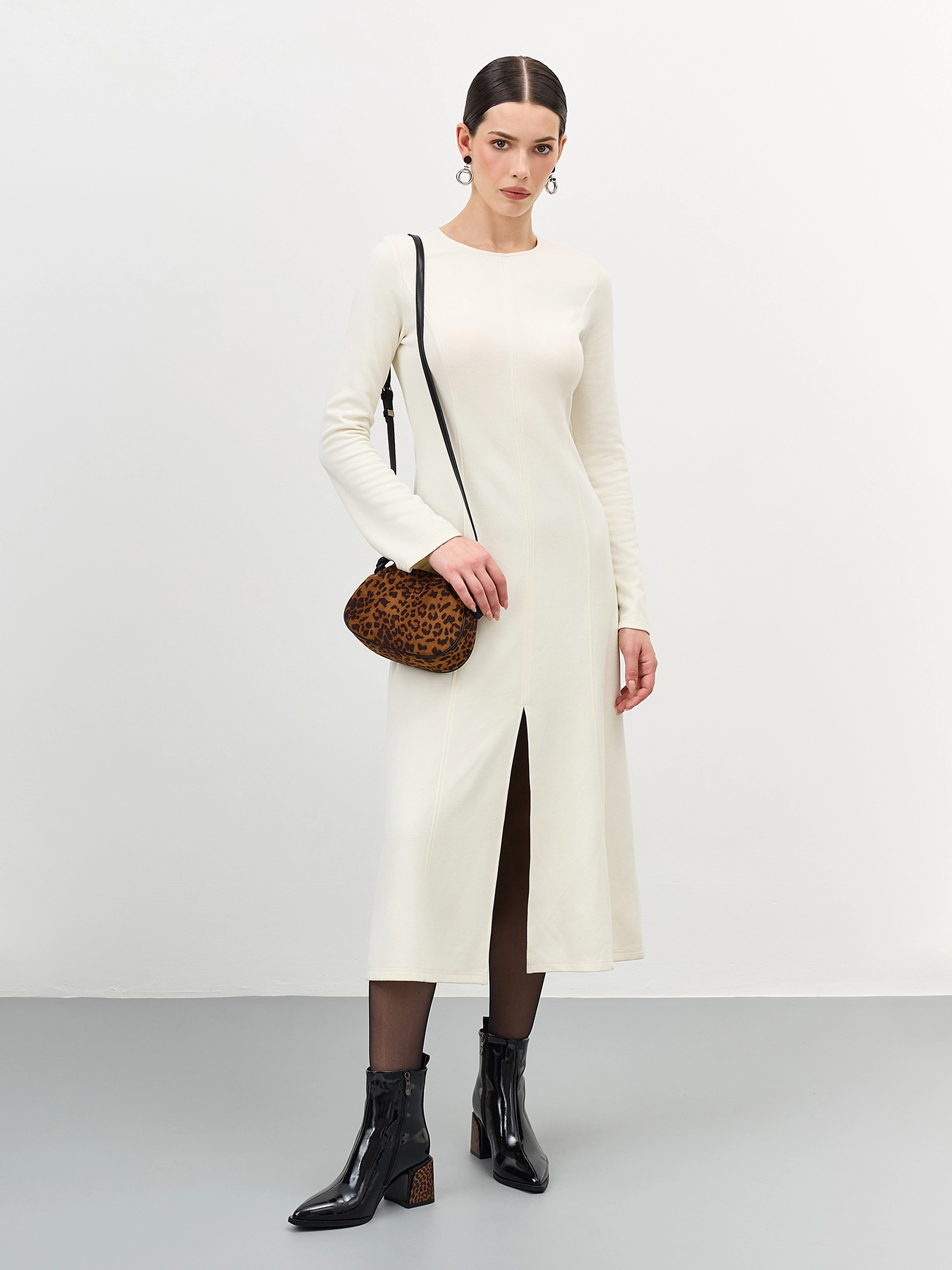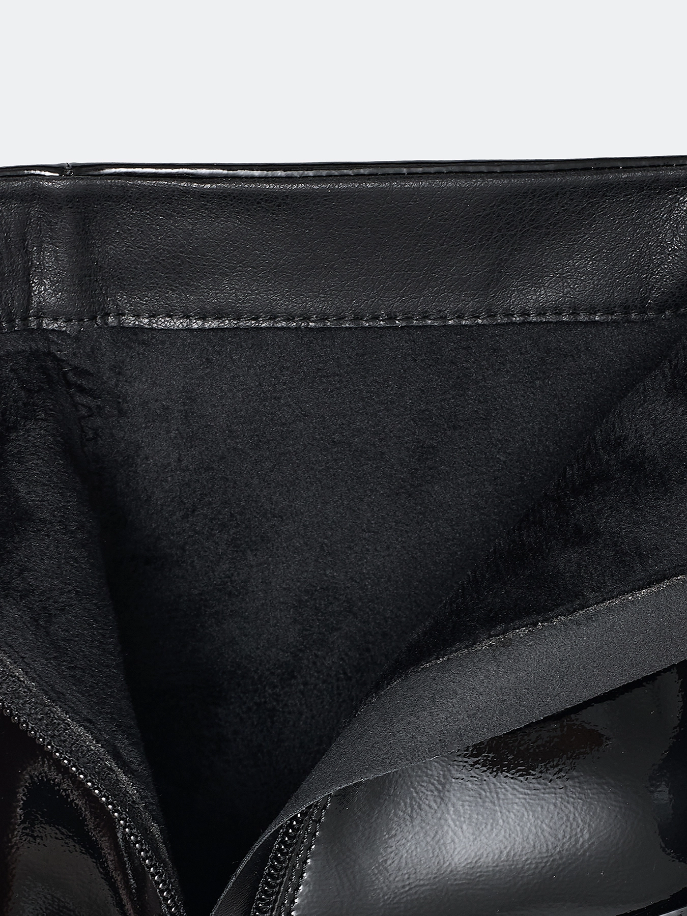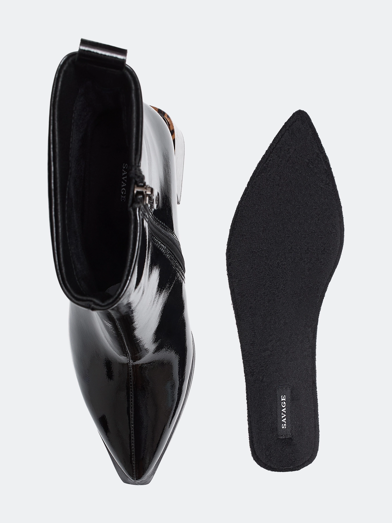 Ботильоны из лаковой кожи и контрастным каблуком с анималистичным принтом. Заостренный мыс. Тонкая подошва из термопластичной резины. Застежка на молнию с внутренней стороны. Устойчивый каблук средней высоты и подошва из резины обеспечивают комфорт при ходьбе. Подкладка и стелька из теплого текстиля.