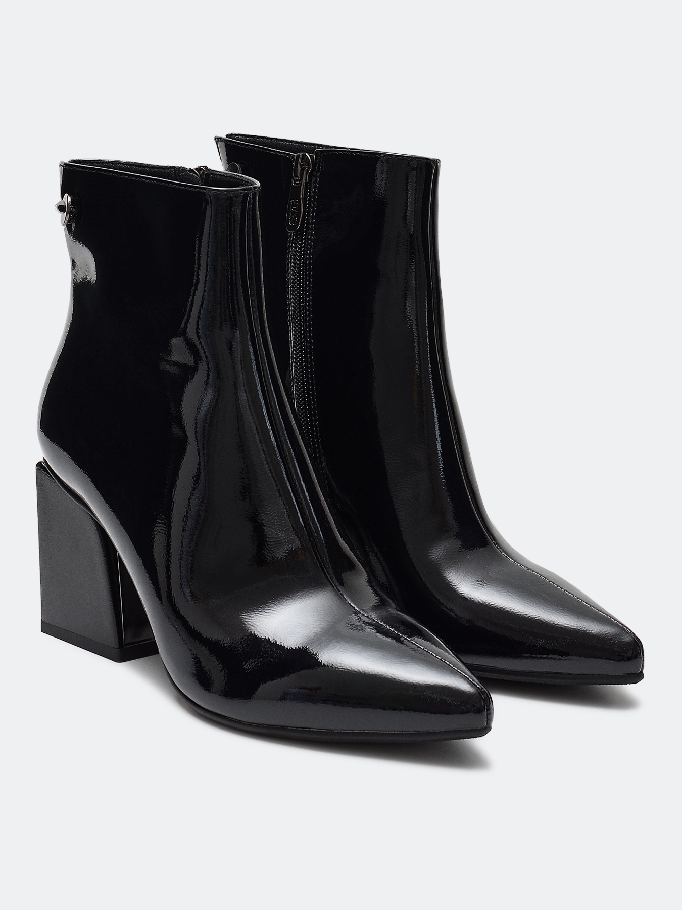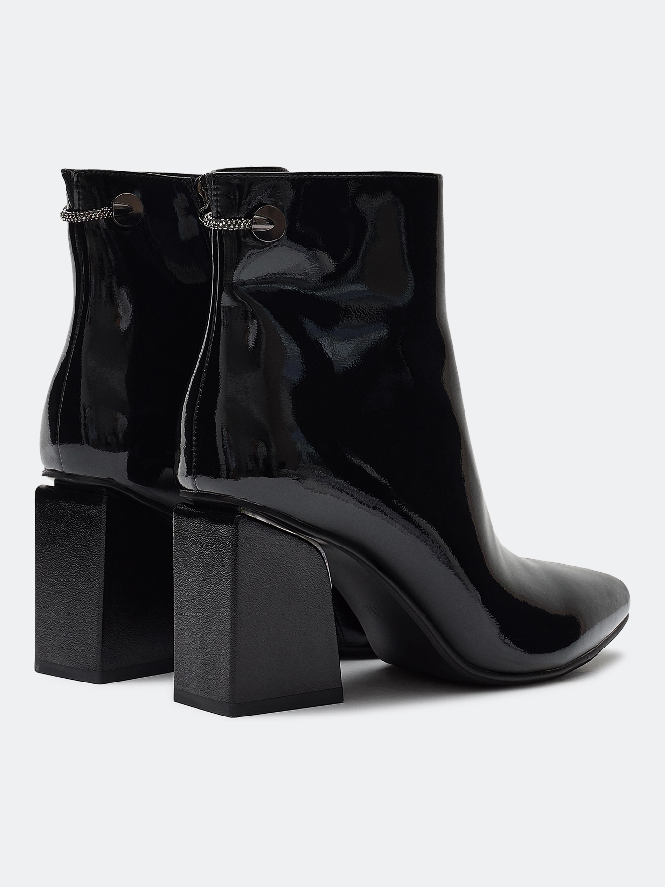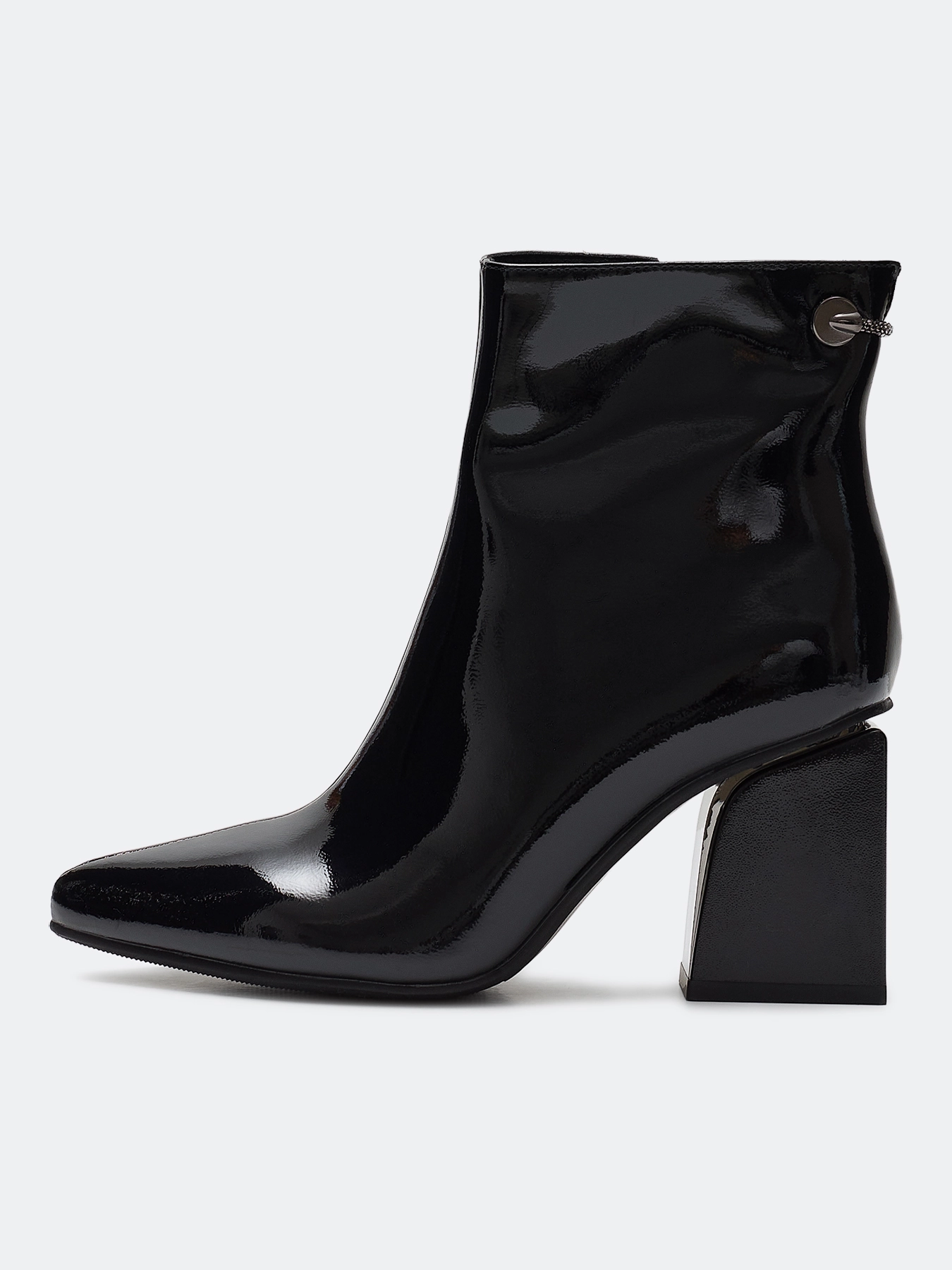 Ботильоны из лаковой кожи. Заостренный мыс. Тонкая подошва из термопластичной резины. Застежка на молнию с внутренней стороны. Устойчивый каблук средней высоты и подошва из резины обеспечивают комфорт при ходьбе. Подкладка и стелька из теплого текстиля.