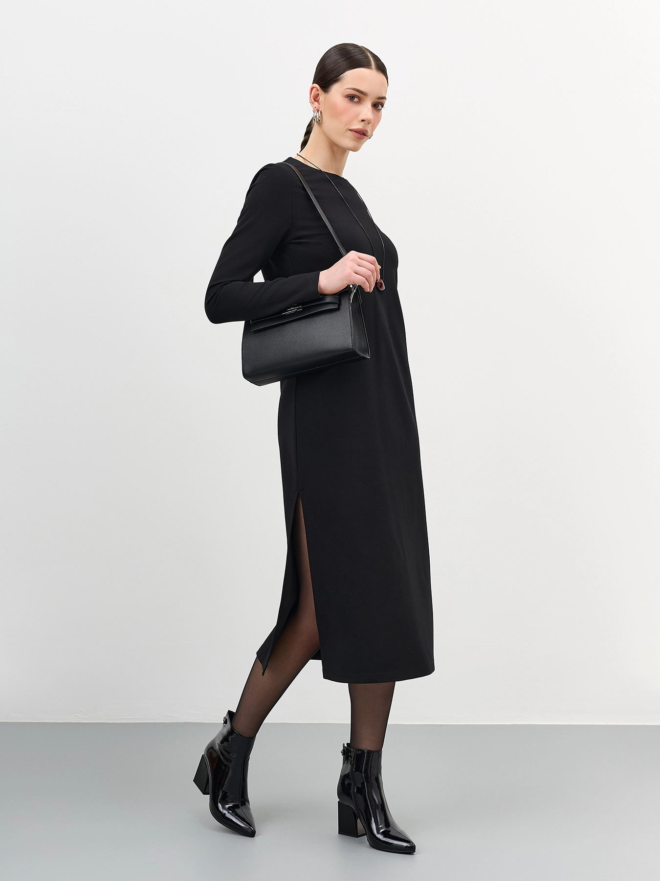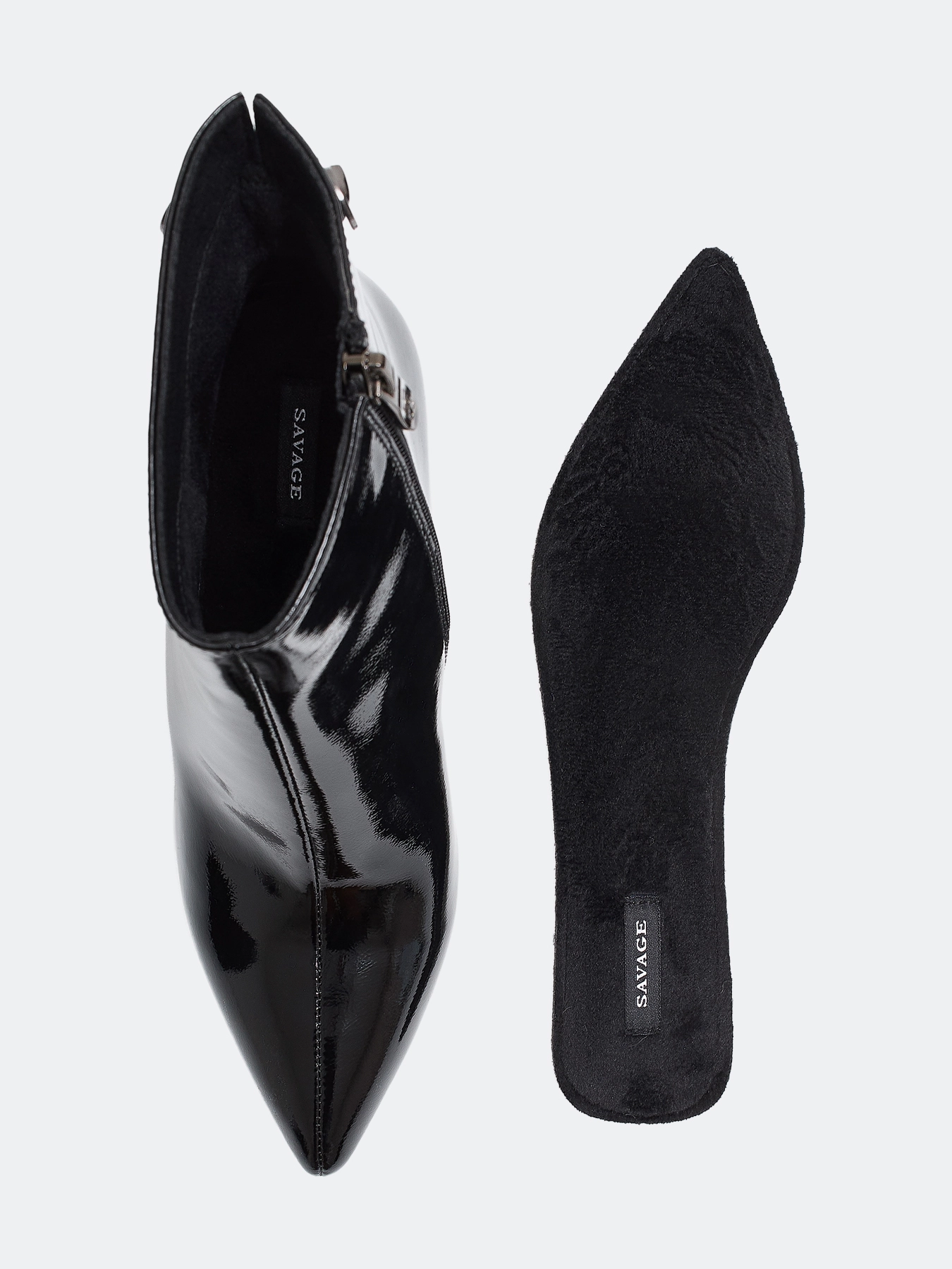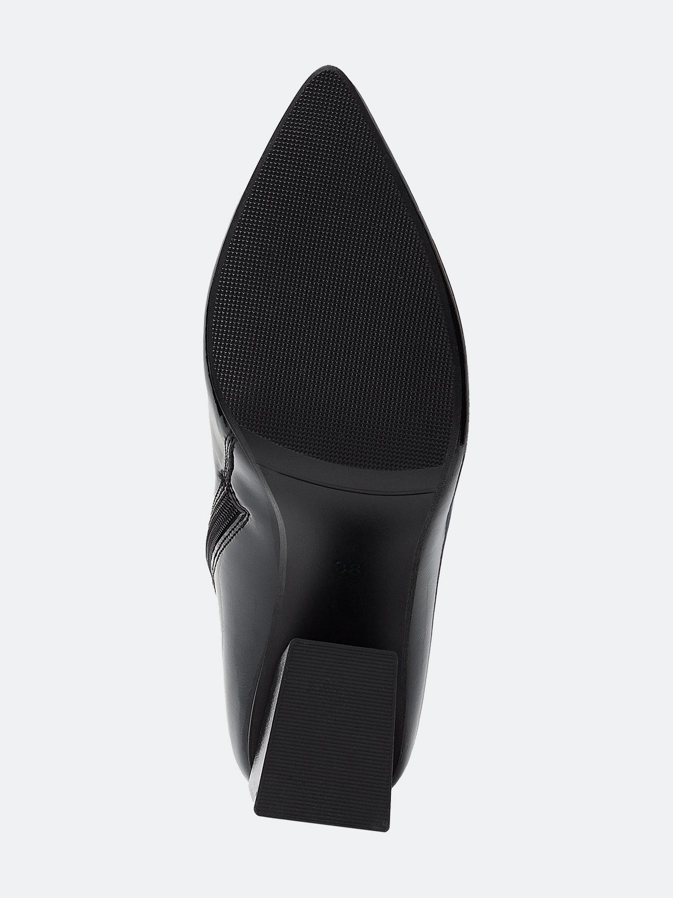 Ботильоны из лаковой кожи. Заостренный мыс. Тонкая подошва из термопластичной резины. Застежка на молнию с внутренней стороны. Устойчивый каблук средней высоты и подошва из резины обеспечивают комфорт при ходьбе. Подкладка и стелька из теплого текстиля.