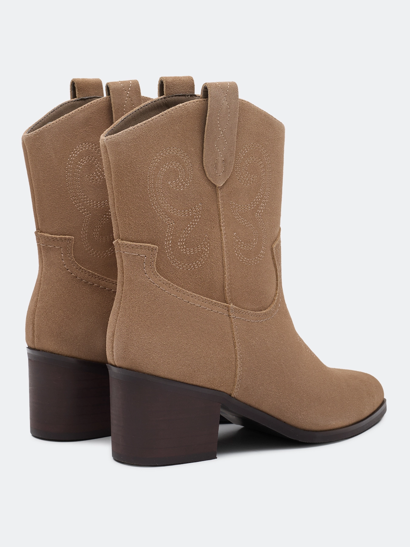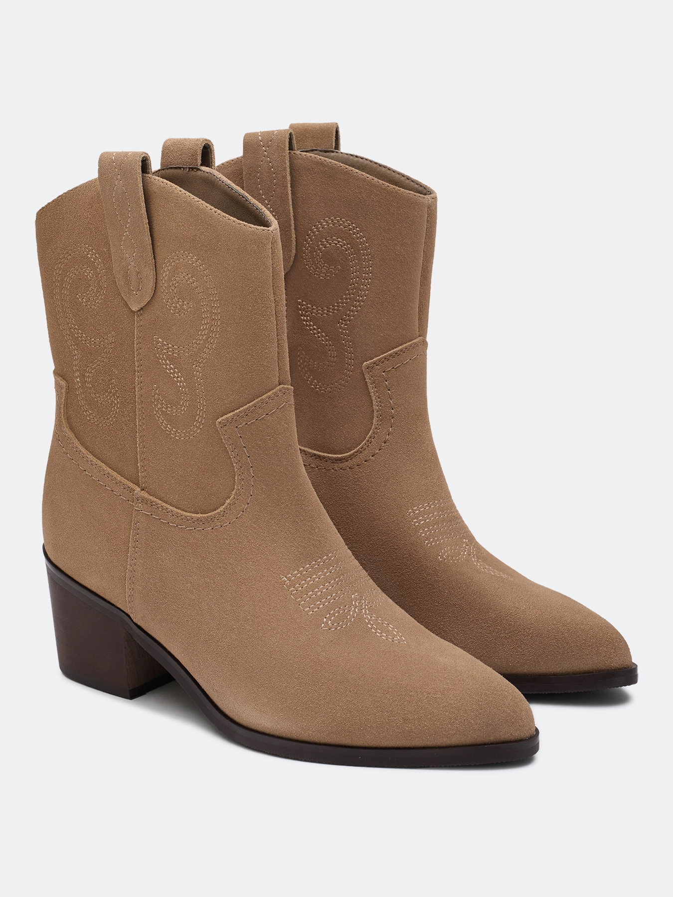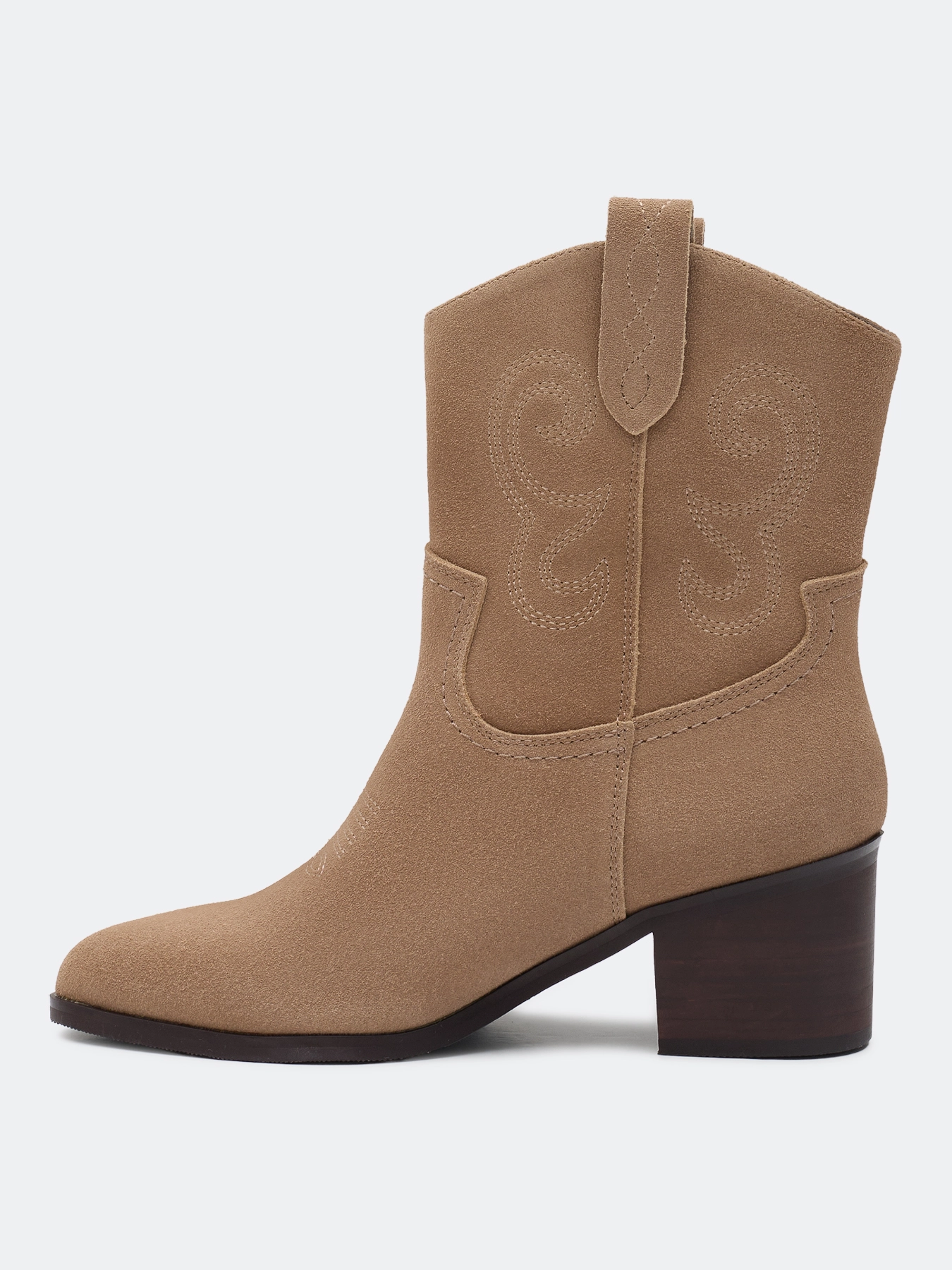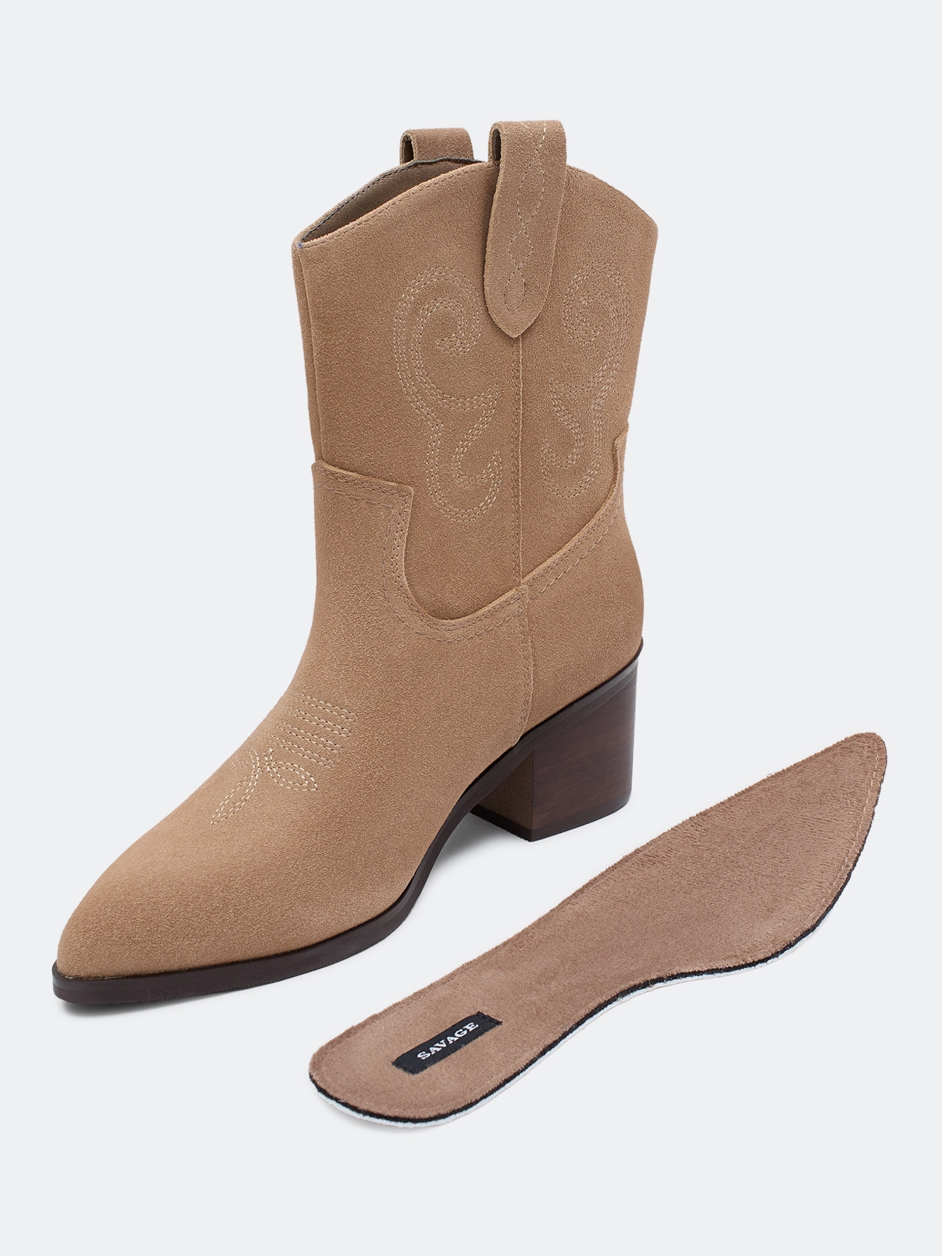 Казаки из натуральной замши в ковбойском стиле. Заостренный мыс. Тонкая подошва из термопластичной резины. Дополнены декоративной вышивкой на голенище. Устойчивый каблук средней высоты и подошва из резины обеспечивают комфорт при ходьбе. Подкладка и стелька из текстиля.