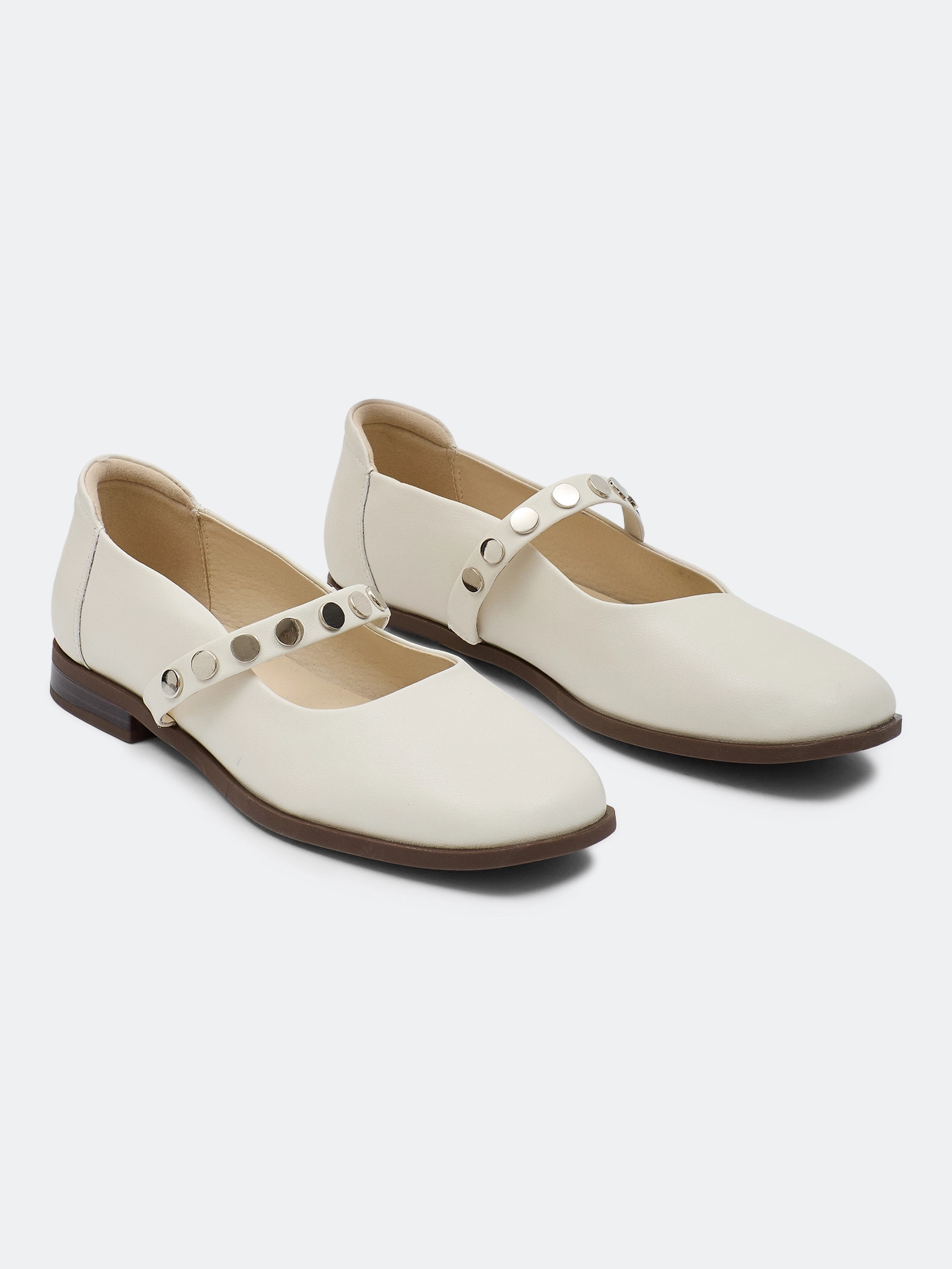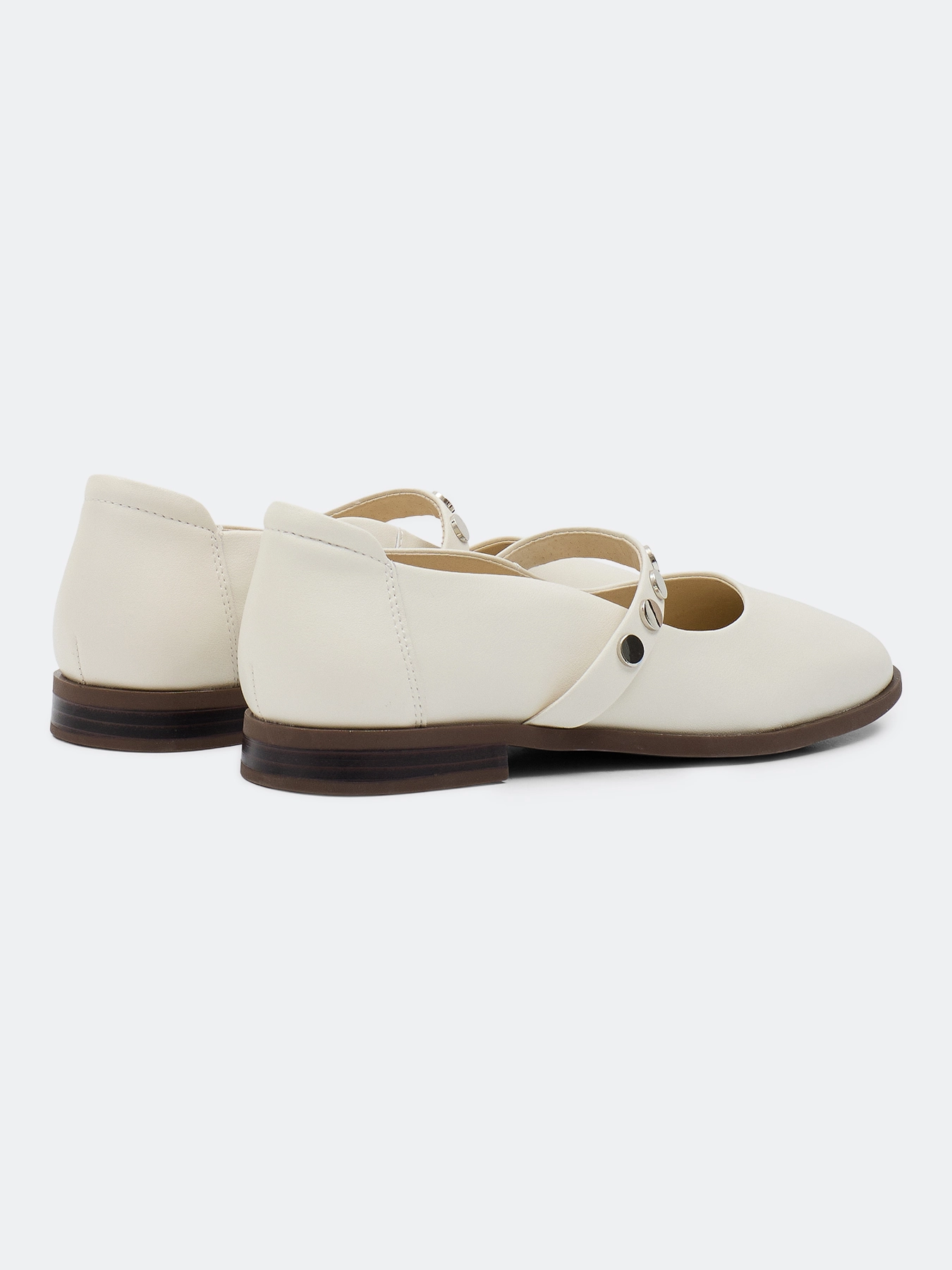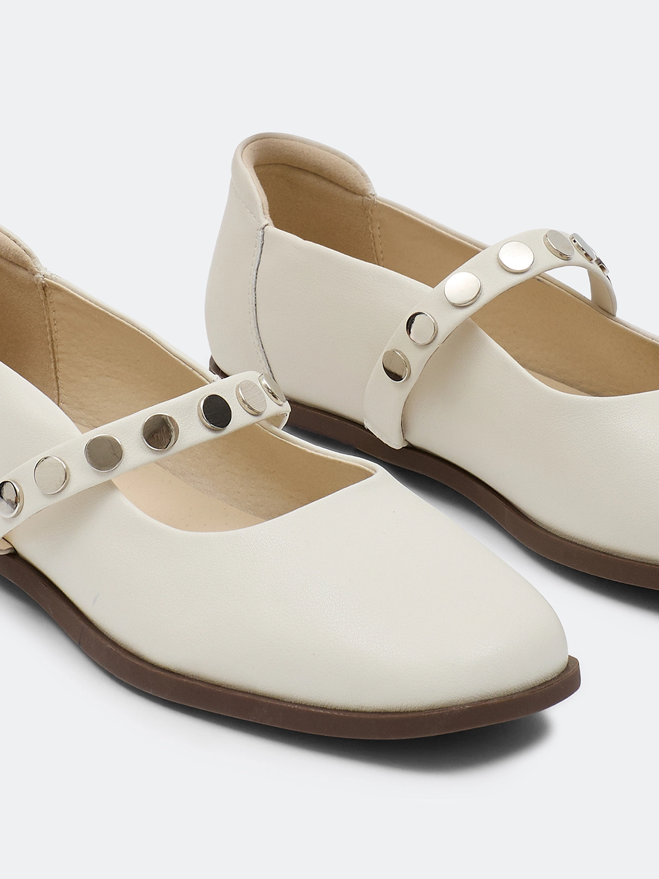 Балетки из натуральной кожи с контрастным декором. Круглый мыс. Фиксация на ремешок. Подкладка и стелька из натуральной кожи. Подошва из термопластичной резины.