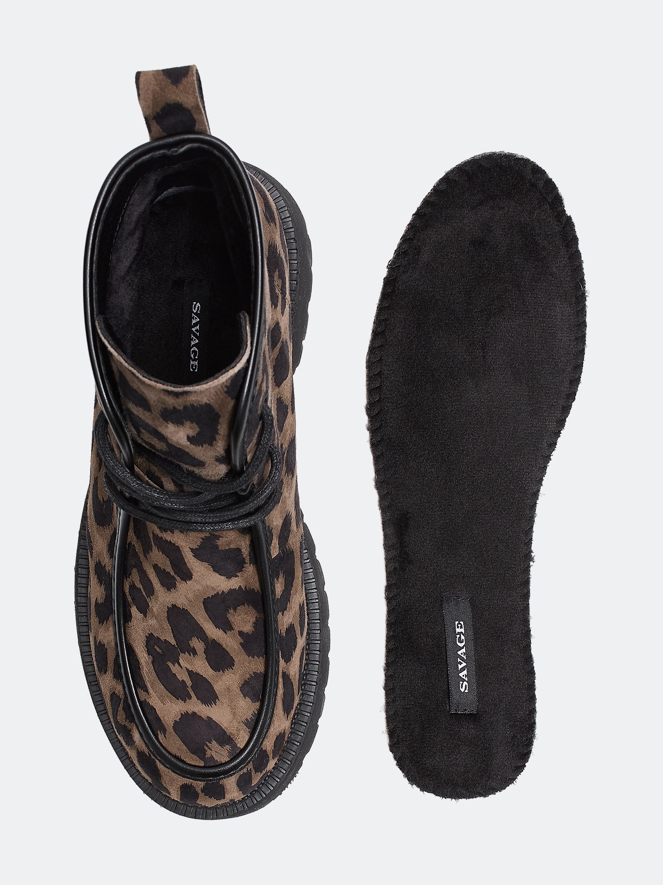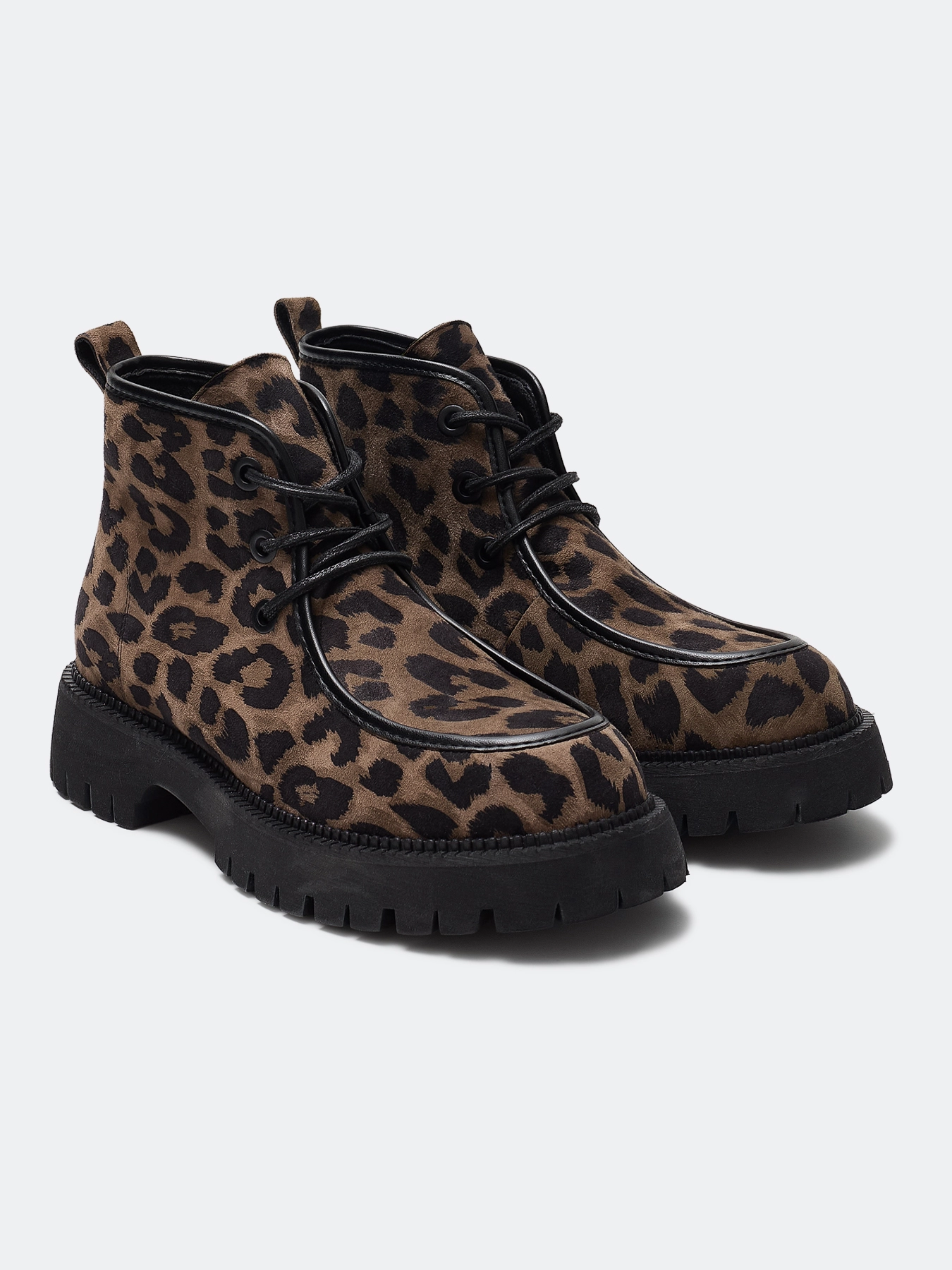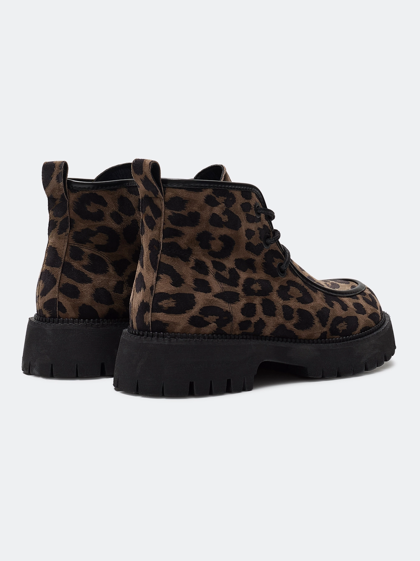 Ботинки с анималистичным принтом из натуральной кожи. Закругленный мыс. Застежка на молнию с внутренней стороны. Контрастный кант и шнуровка. Подкладка из теплого текстиля. Подошва и устойчивый каблук из термопластичной резины.