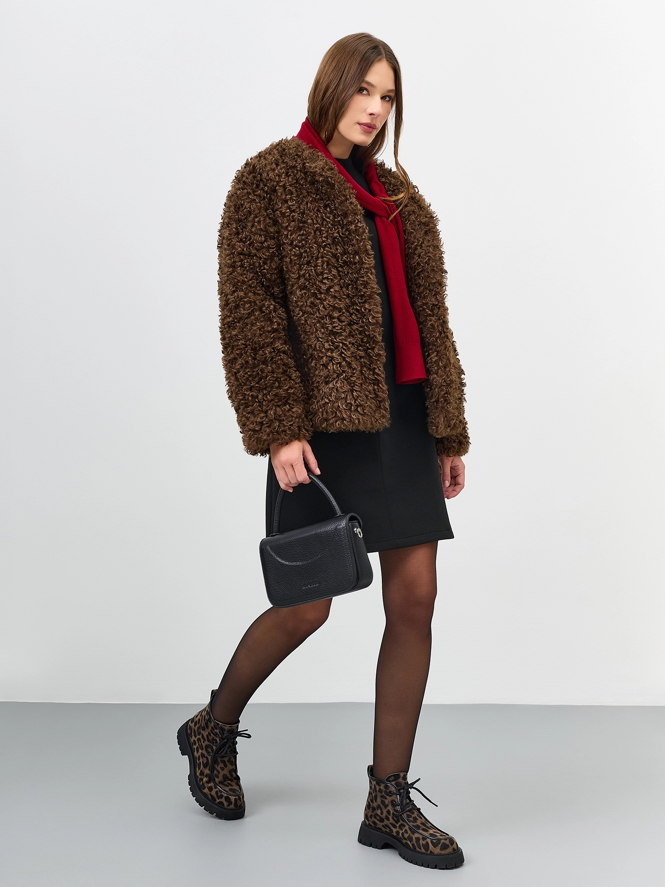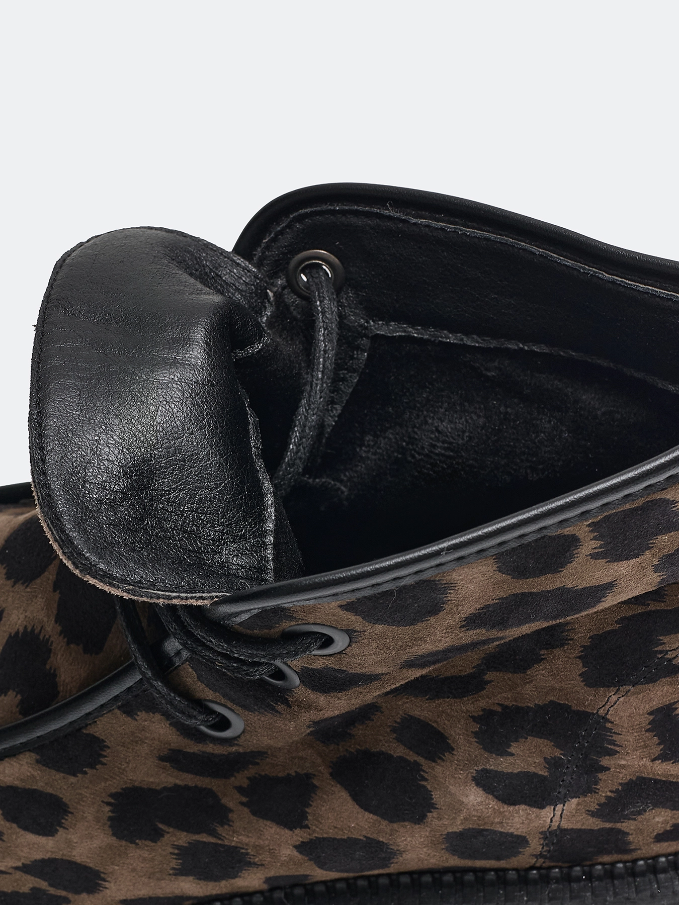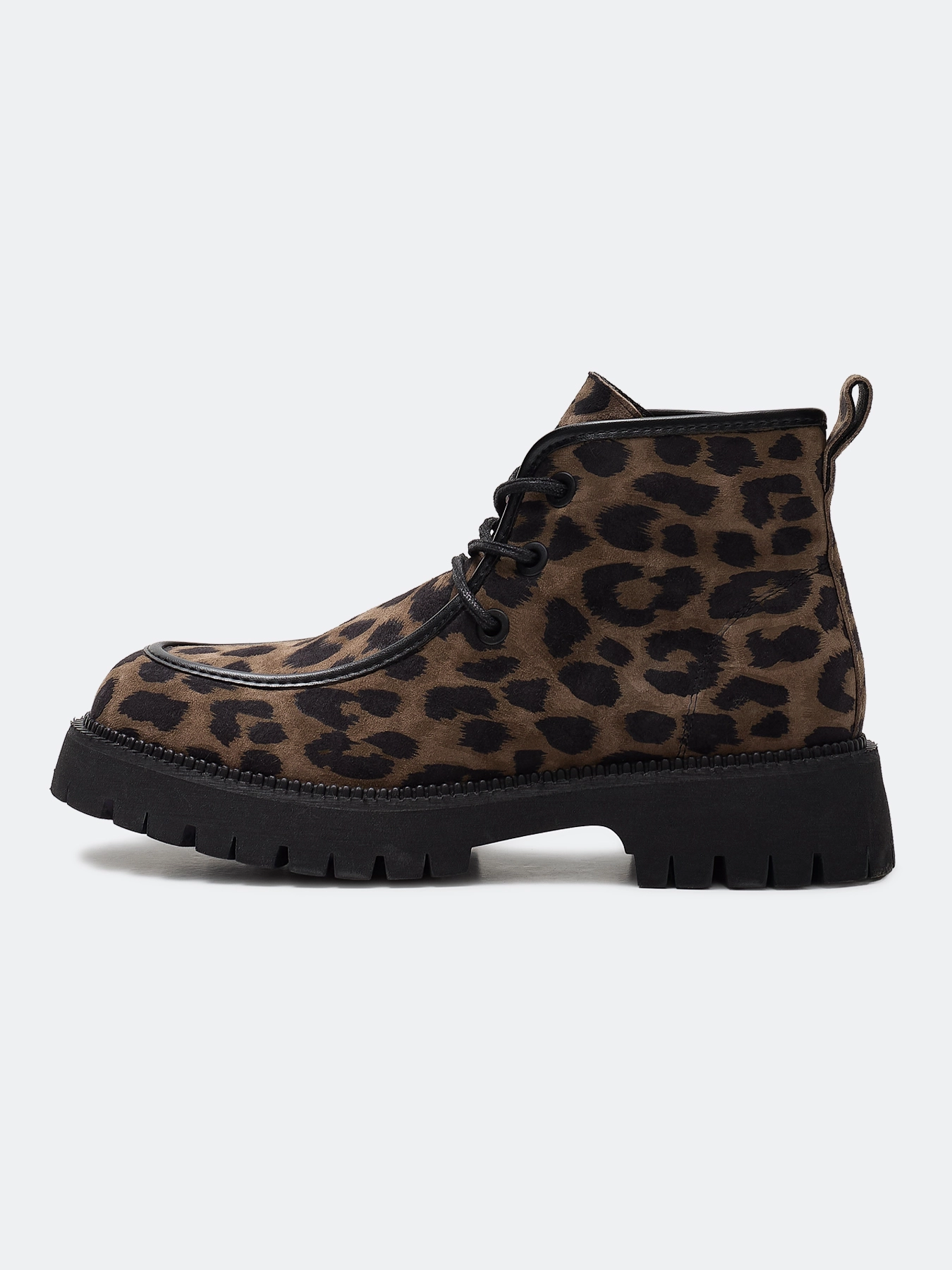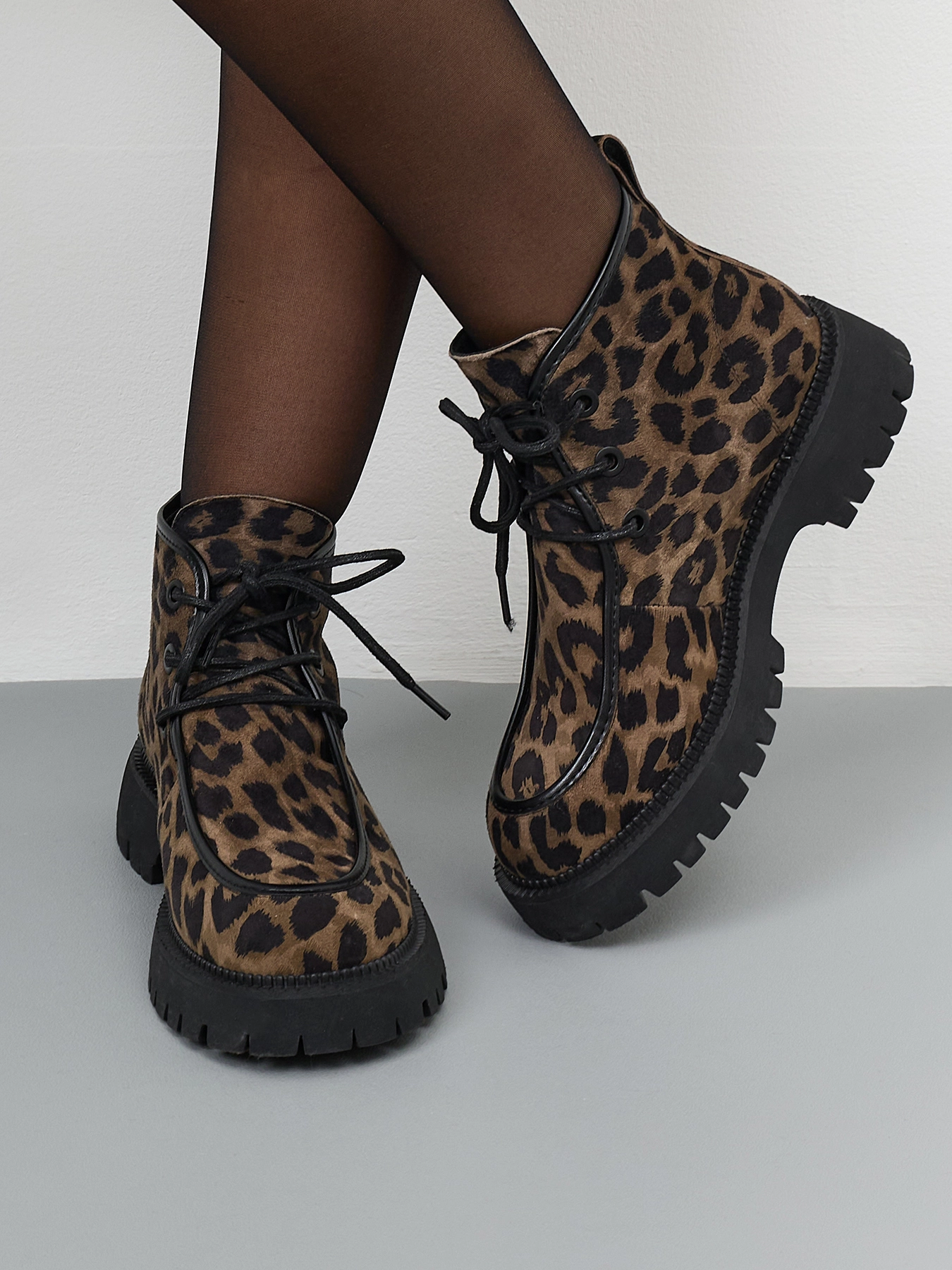 Ботинки с анималистичным принтом из натуральной кожи. Закругленный мыс. Застежка на молнию с внутренней стороны. Контрастный кант и шнуровка. Подкладка из теплого текстиля. Подошва и устойчивый каблук из термопластичной резины.