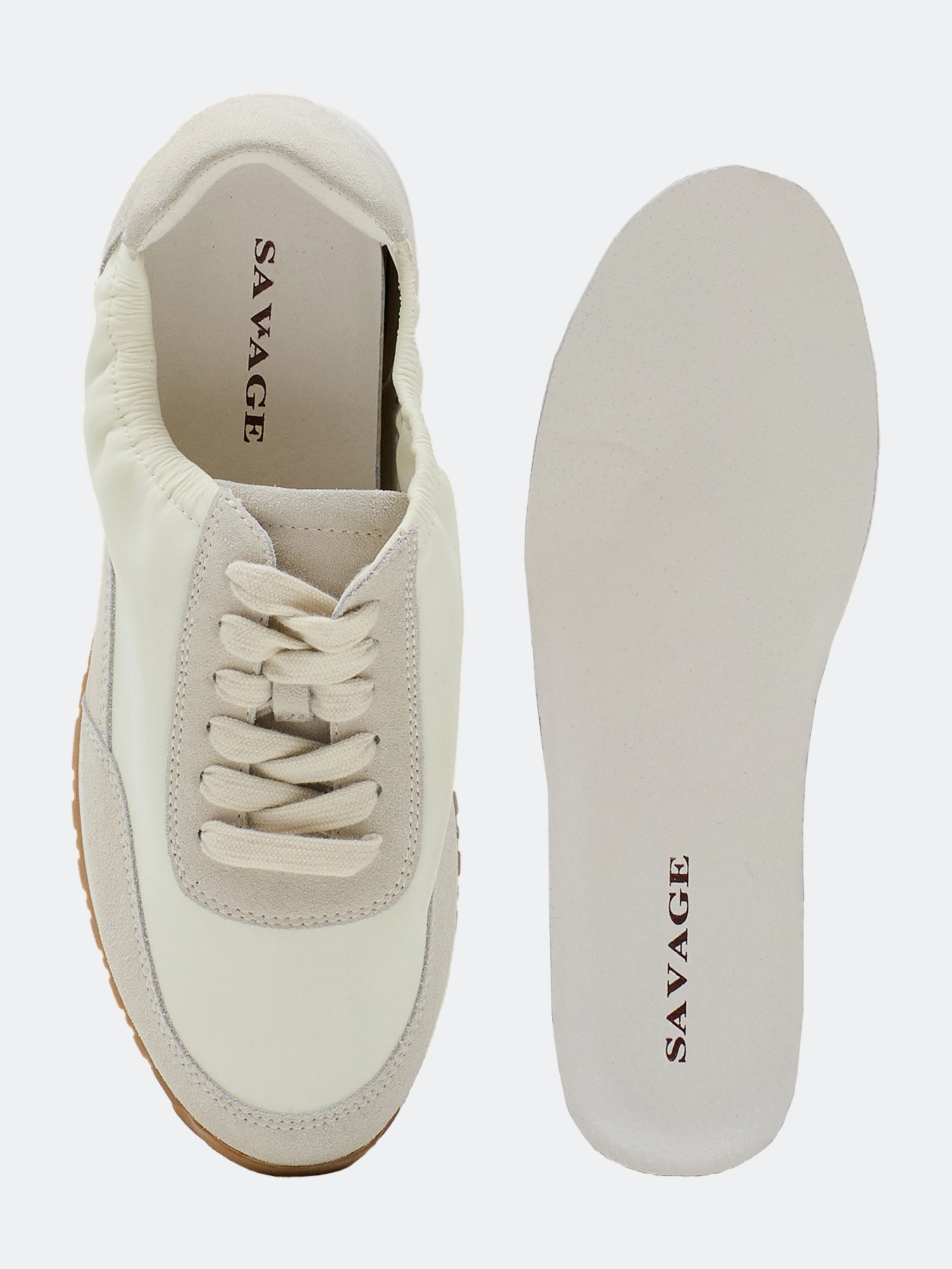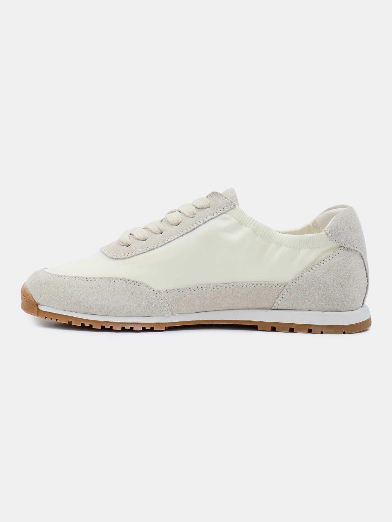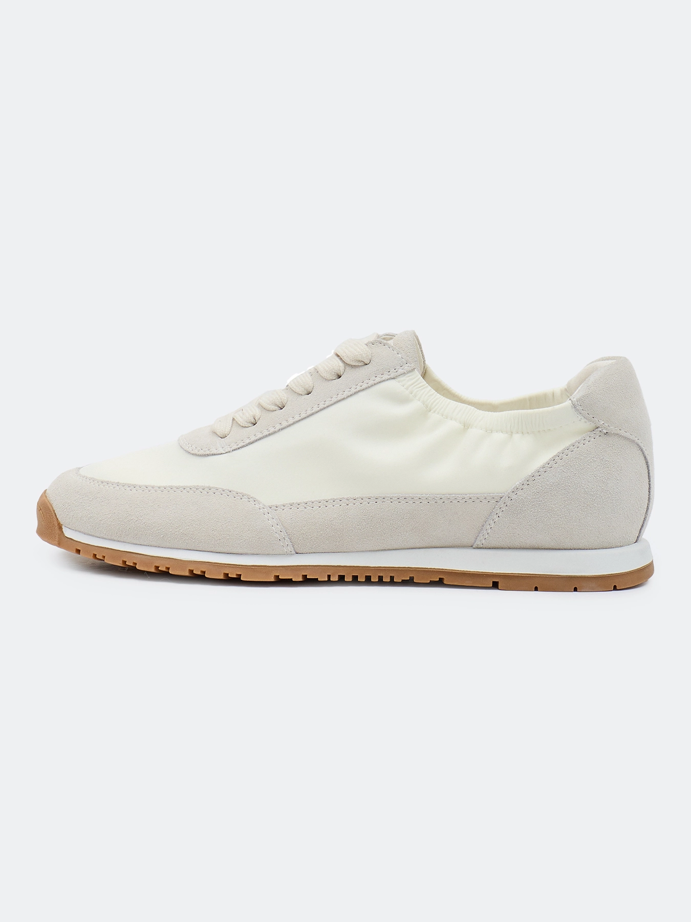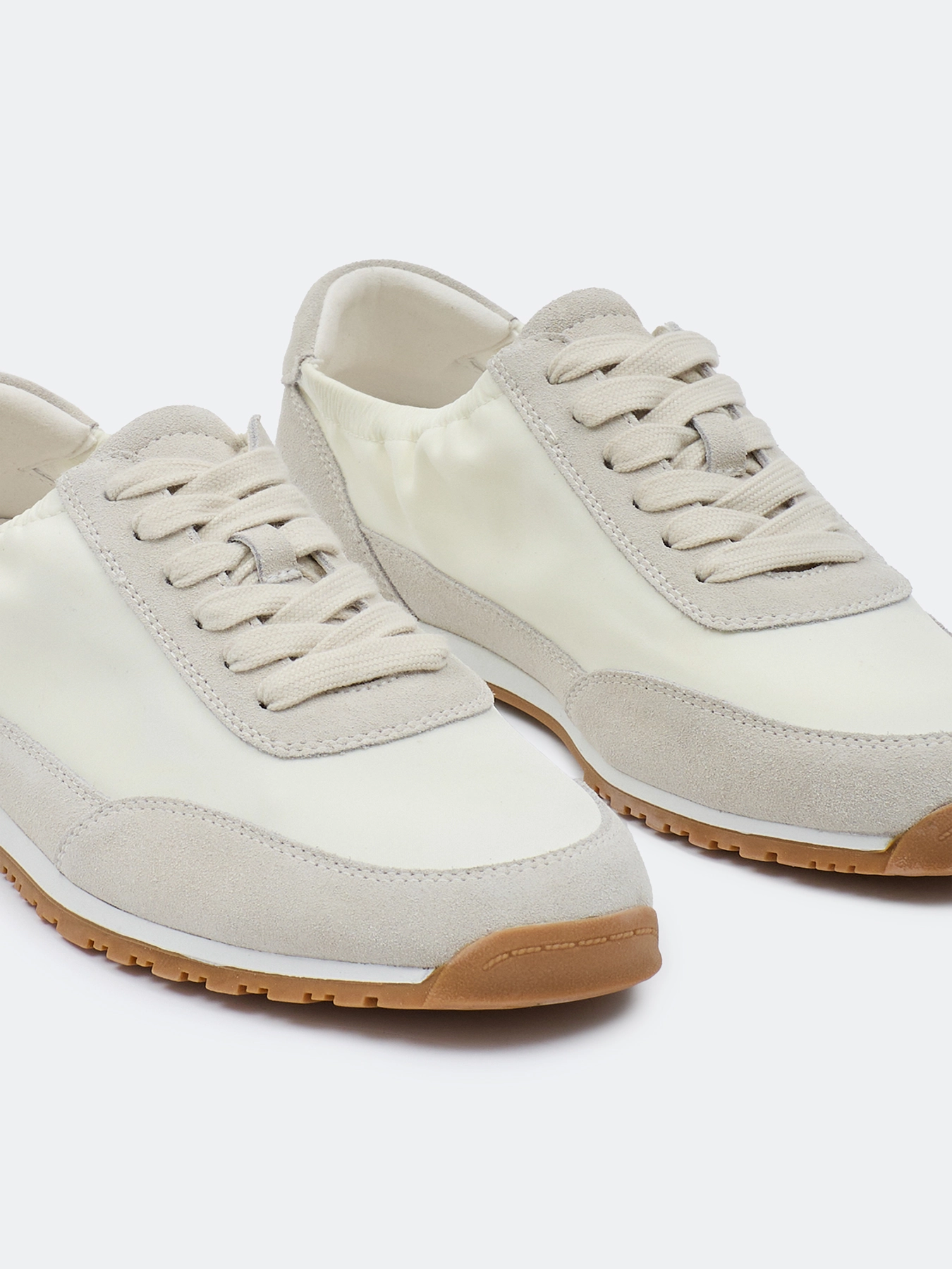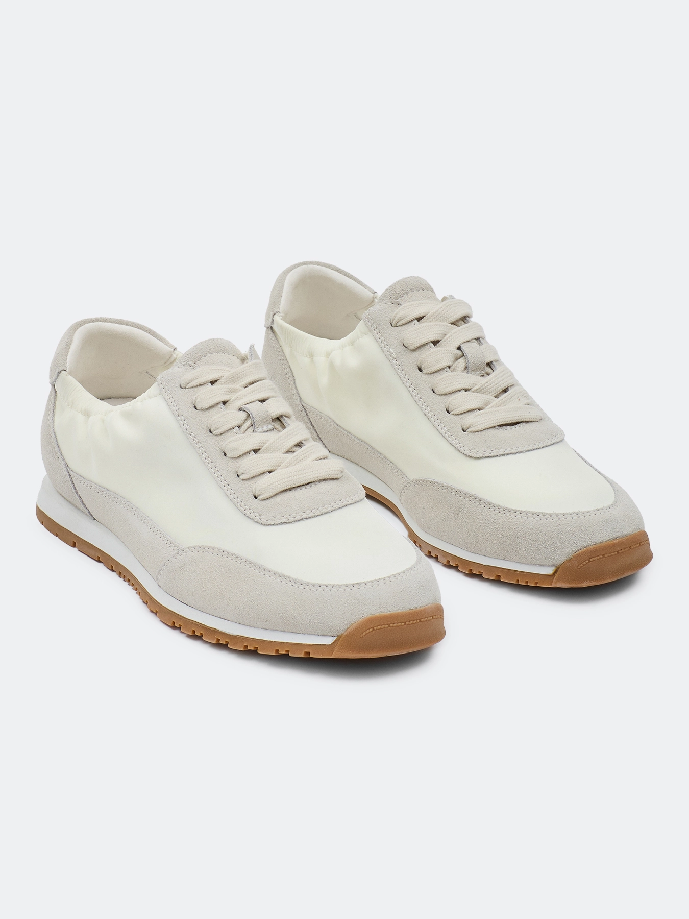 Комбинированные кроссовки из натуральной замши и текстиля. Закруглённый мыс. Эластичный вырез. Фиксация на шнуровку. Стелька из натуральной кожи. Подошва из резины.
