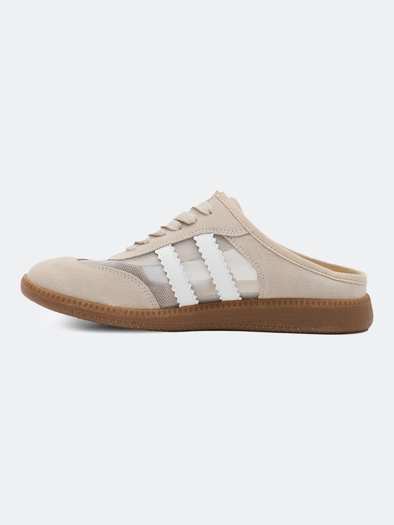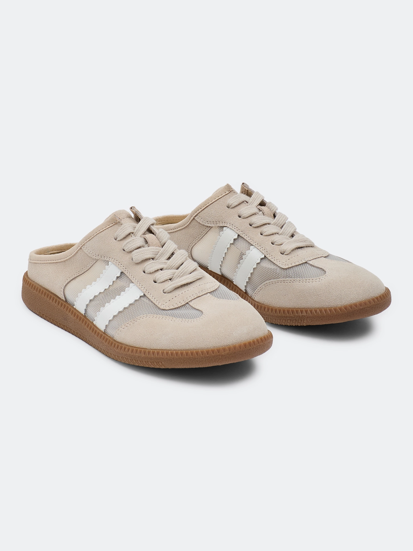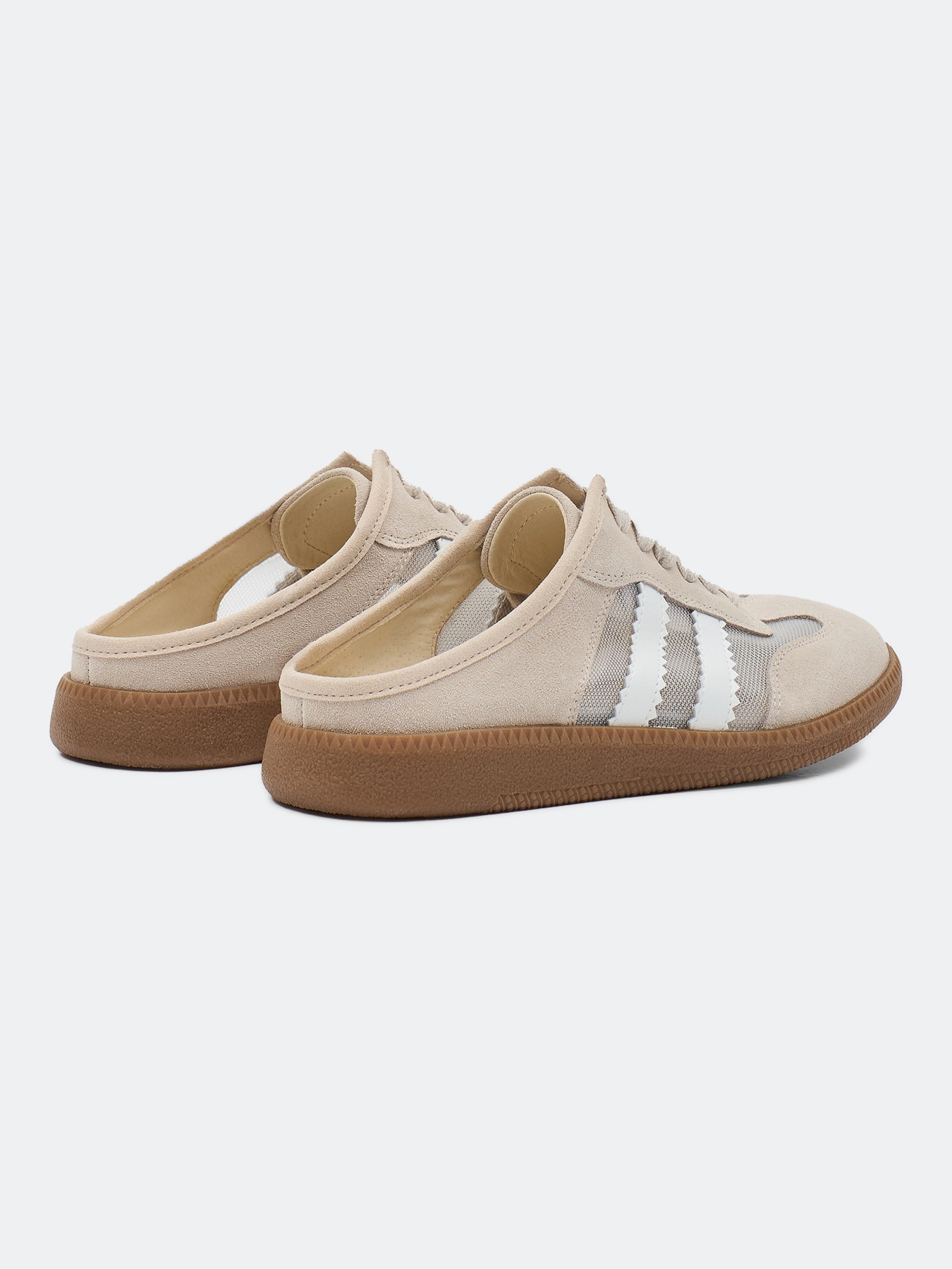 Сабо в спортивном стиле из натуральной замши и сетчатого текстиля. Закруглённый мыс. Подкладка и стелька из натуральной кожи. Подошва из резины.