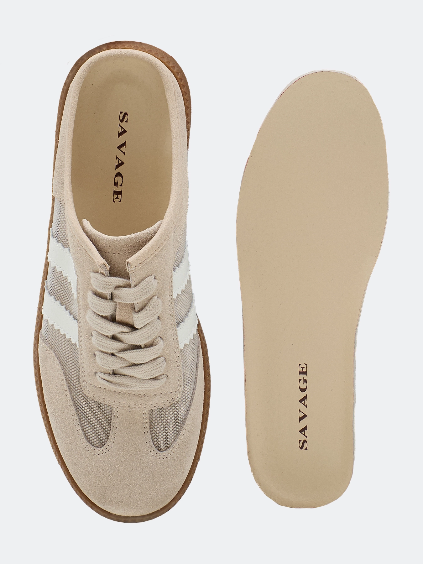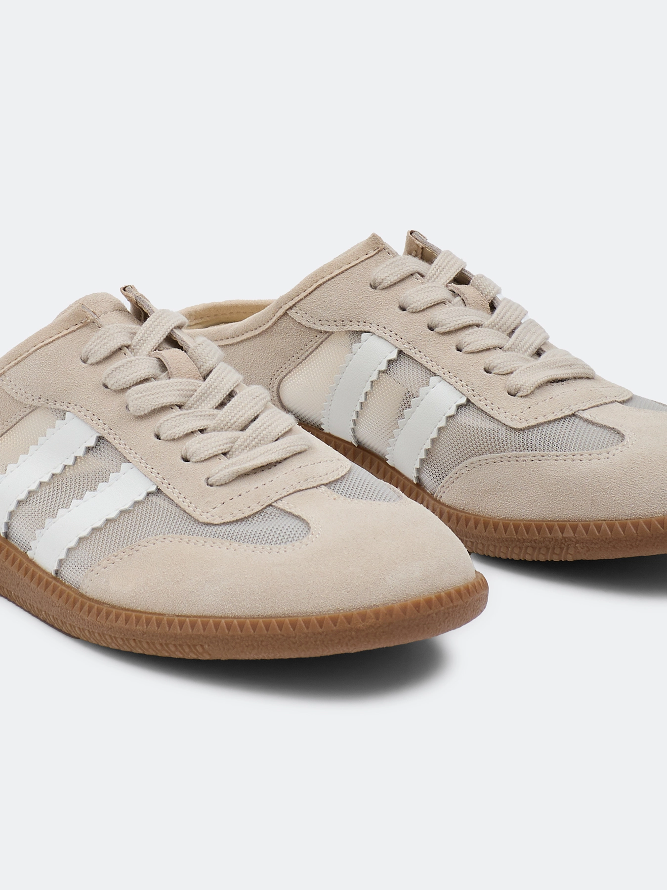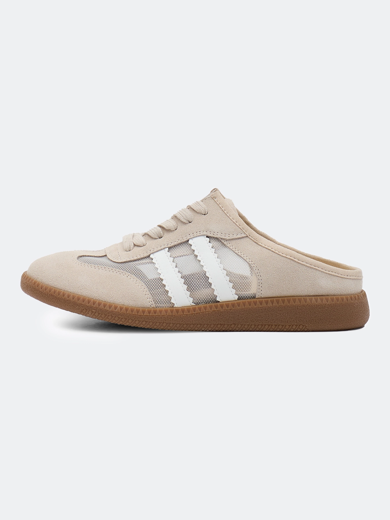 Сабо в спортивном стиле из натуральной замши и сетчатого текстиля. Закруглённый мыс. Подкладка и стелька из натуральной кожи. Подошва из резины.