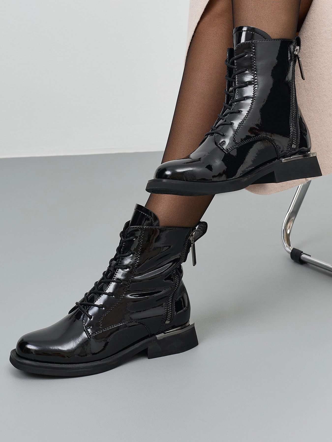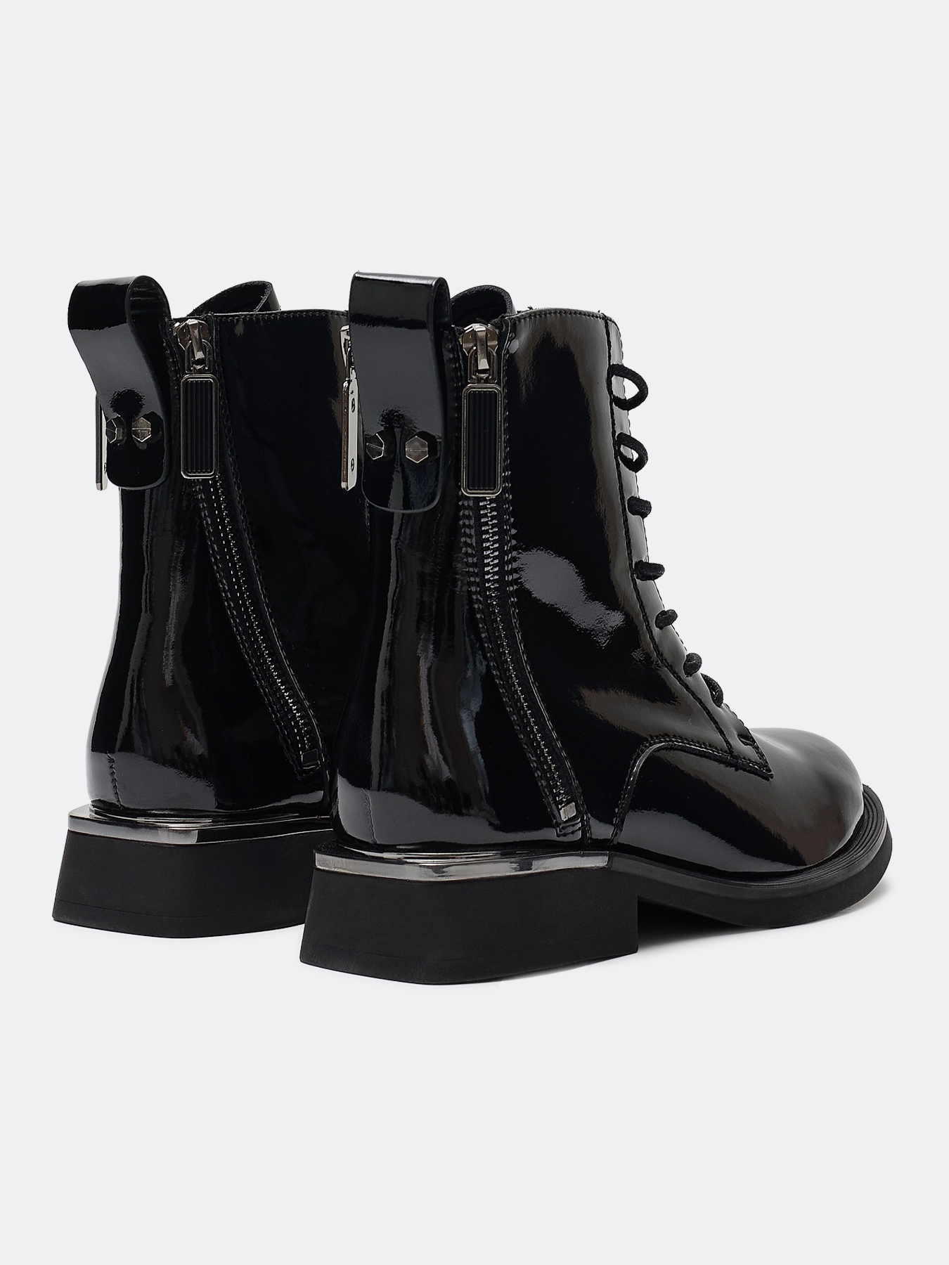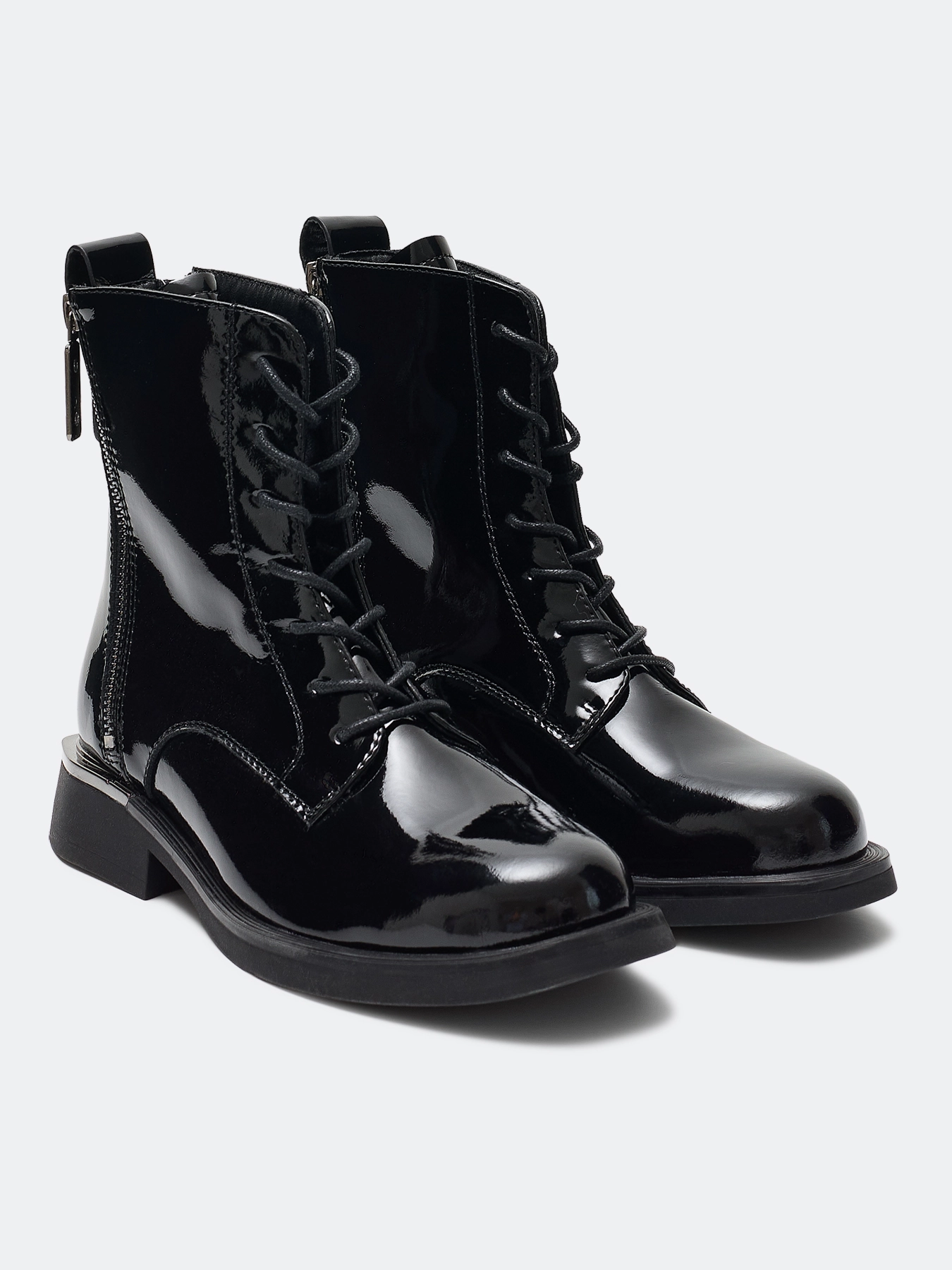 Лаковые ботинки из натуральной кожи на шнурках. Строгий заостренный мыс. Застежка на молнию с внутренней стороны. Дополнительная декоративная молния с внешней стороны. Хлястик для удобства надевания. Подкладка из теплого текстиля. Подошва и устойчивый каблук из термопластичной резины.
