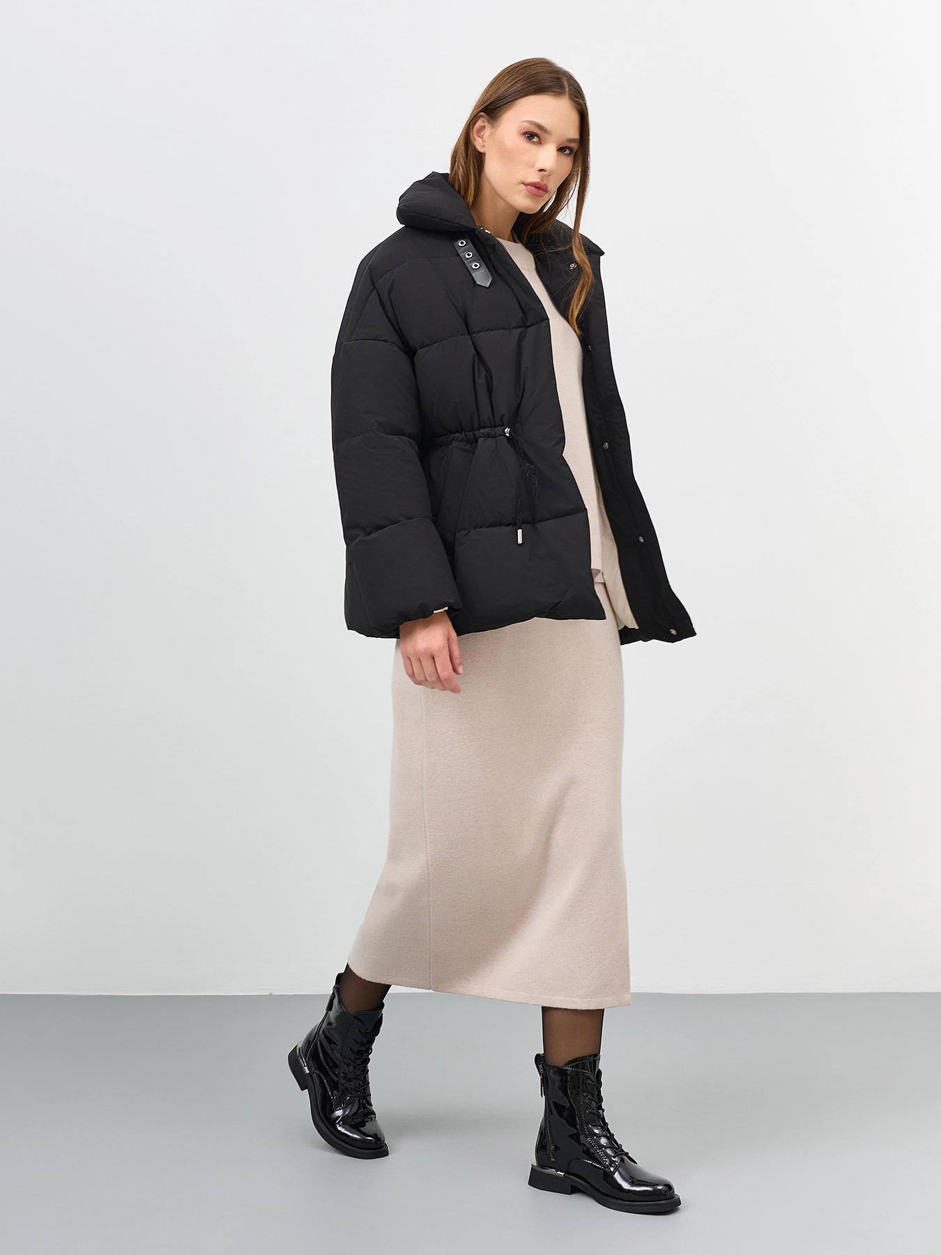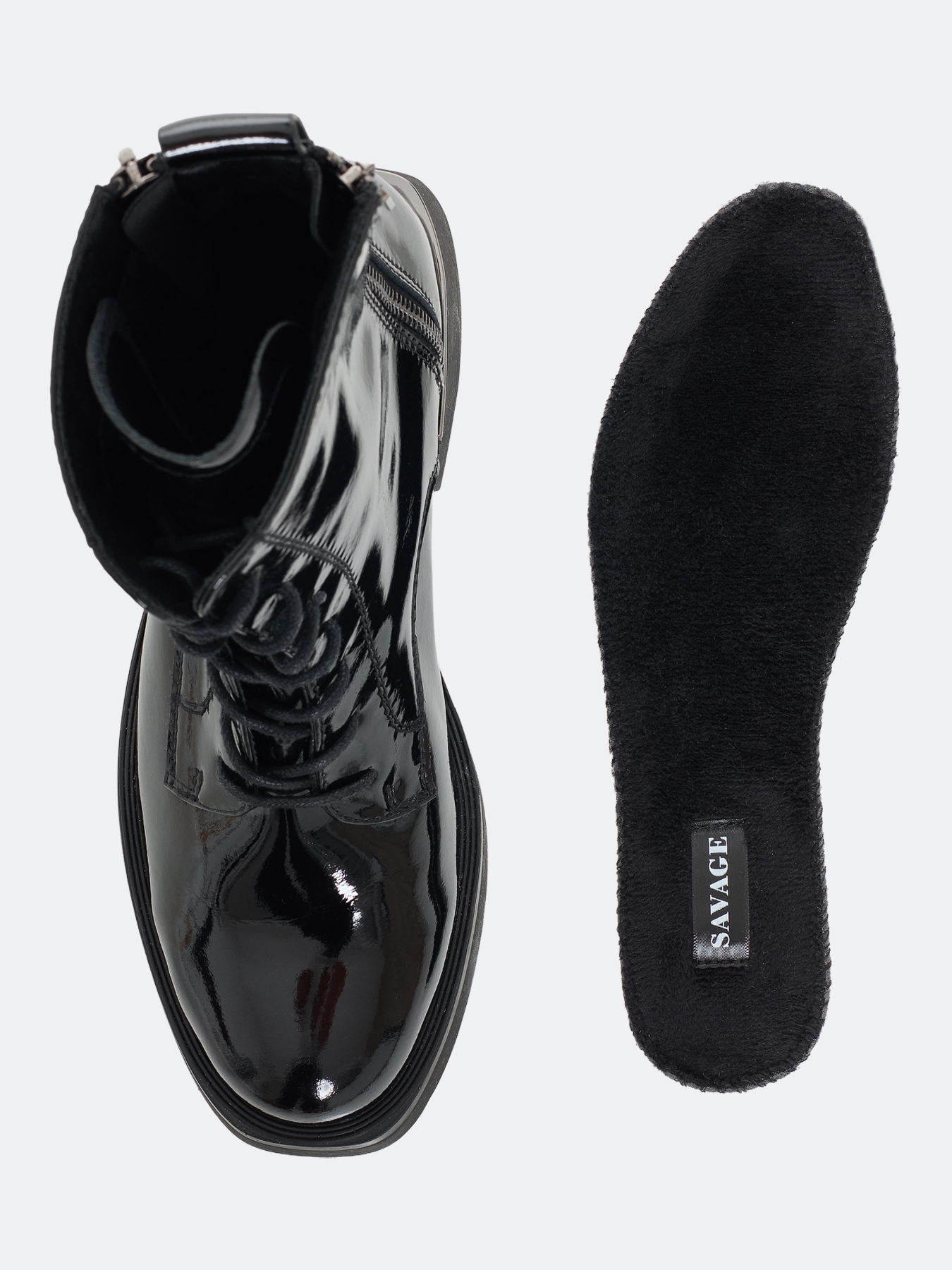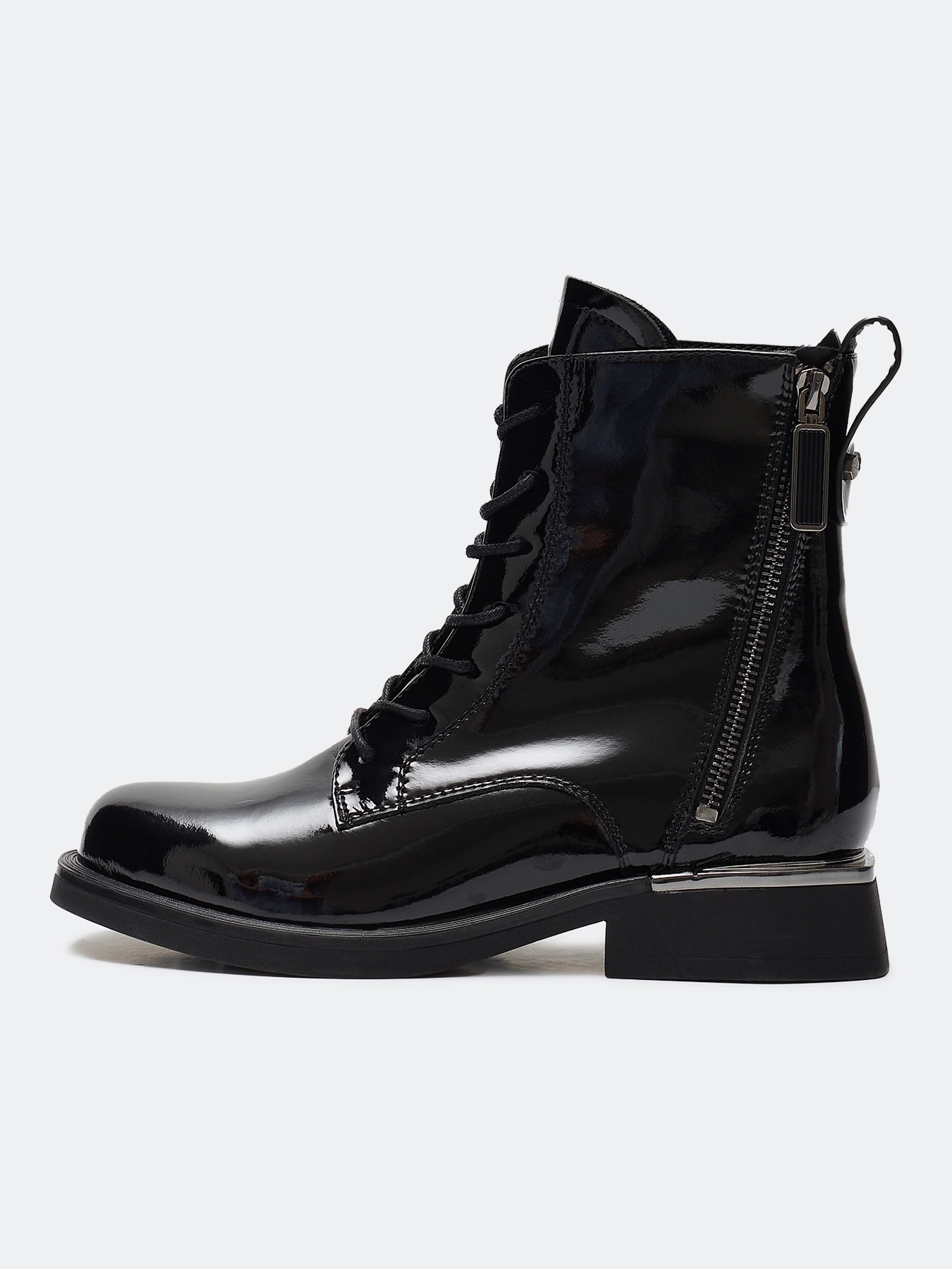 Лаковые ботинки из натуральной кожи на шнурках. Строгий заостренный мыс. Застежка на молнию с внутренней стороны. Дополнительная декоративная молния с внешней стороны. Хлястик для удобства надевания. Подкладка из теплого текстиля. Подошва и устойчивый каблук из термопластичной резины.