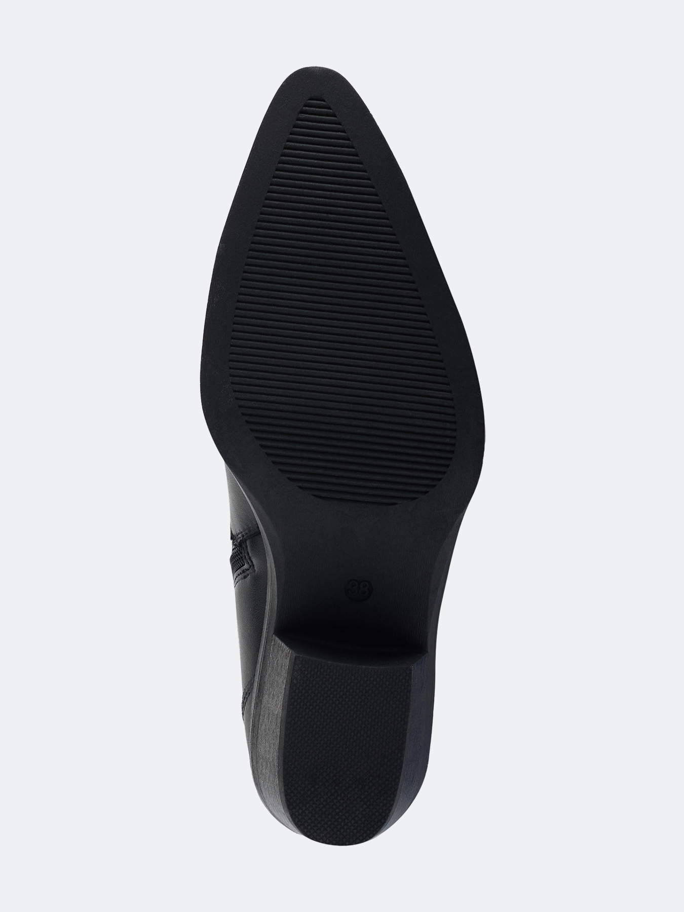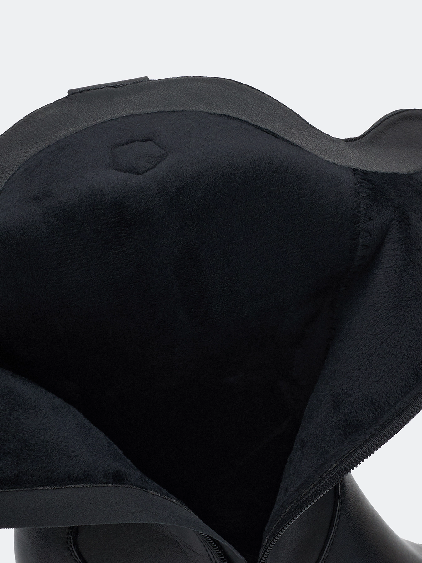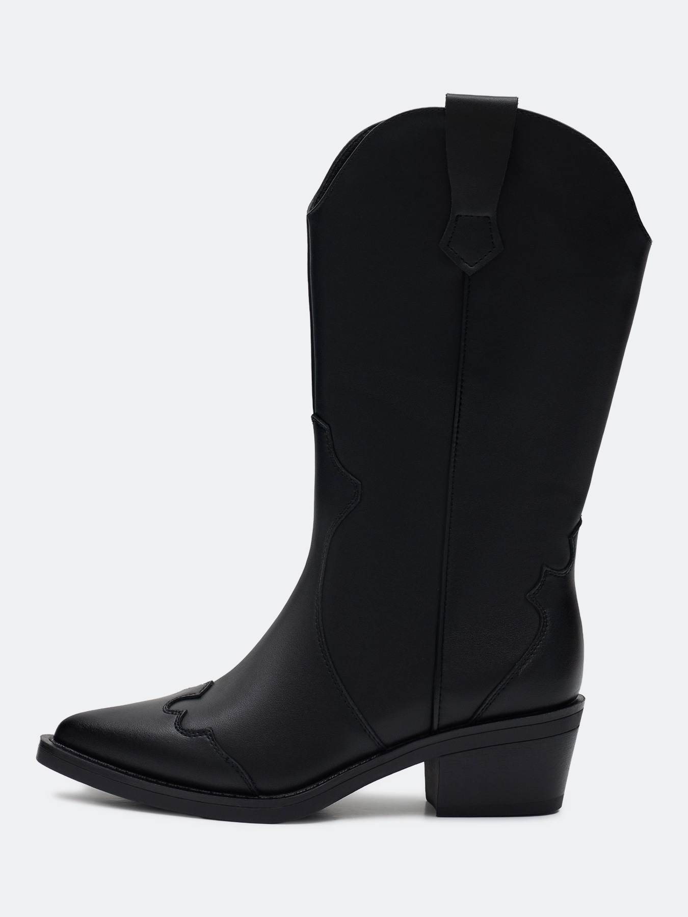 Сапоги-казаки из натуральной кожи в ковбойском стиле. Заостренный мыс с декоративной резной деталью. Декоративные хлястики с анималистичным принтом. Тонкая подошва из термопластичной резины. Устойчивый каблук средней высоты и подошва из резины обеспечивают комфорт при ходьбе. Подкладка и стелька из теплого текстиля.