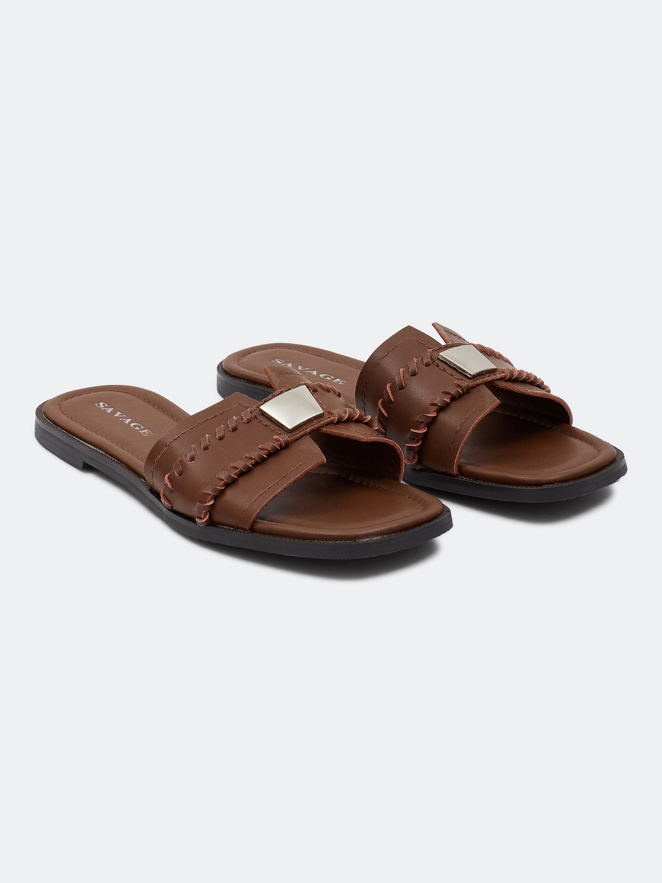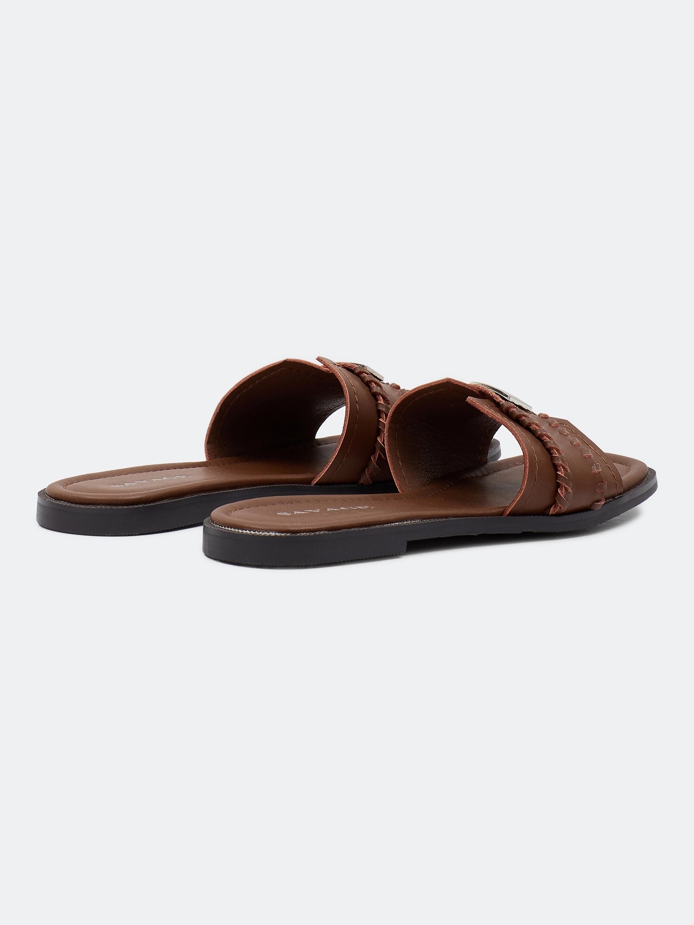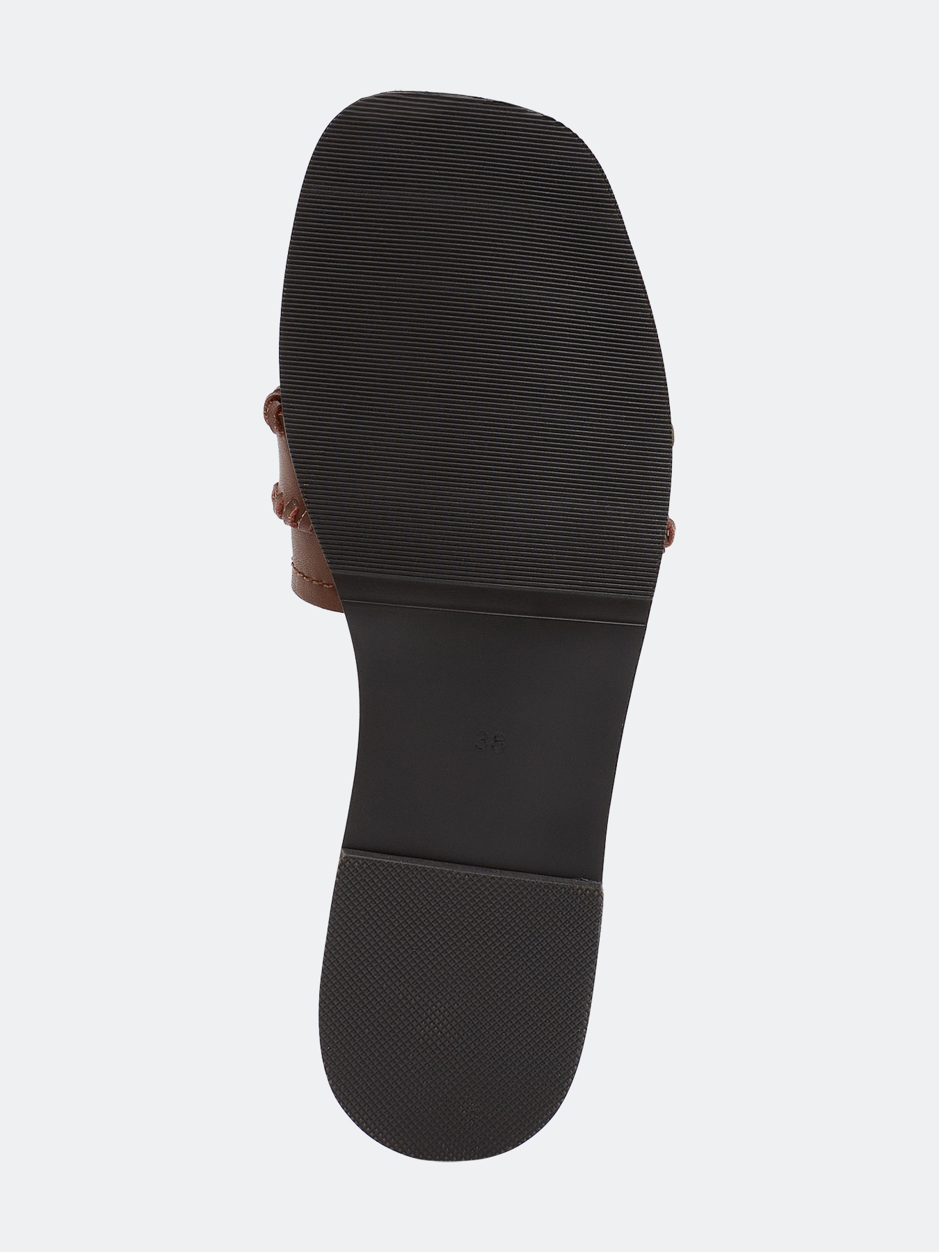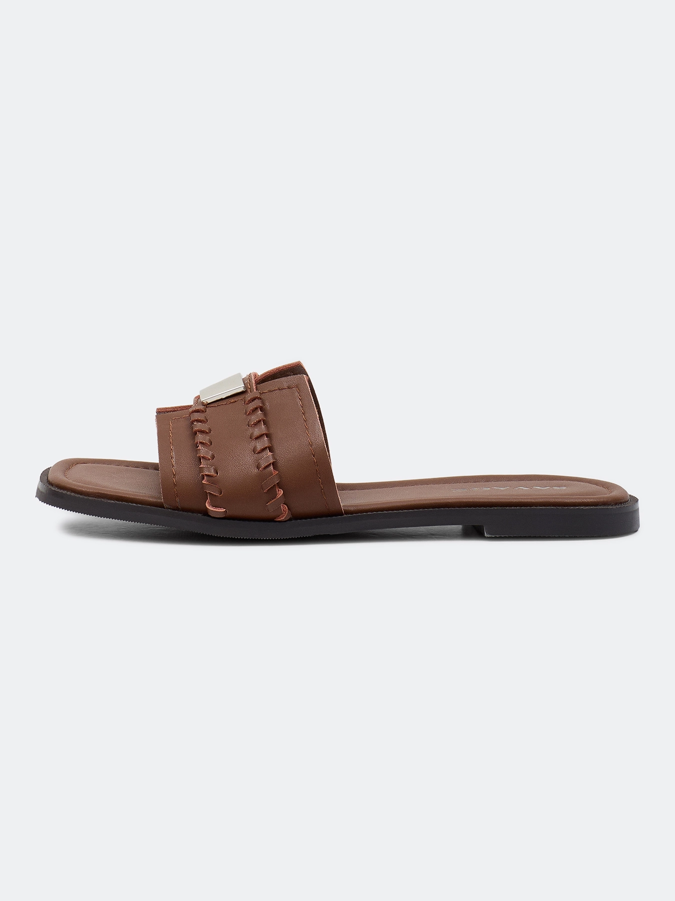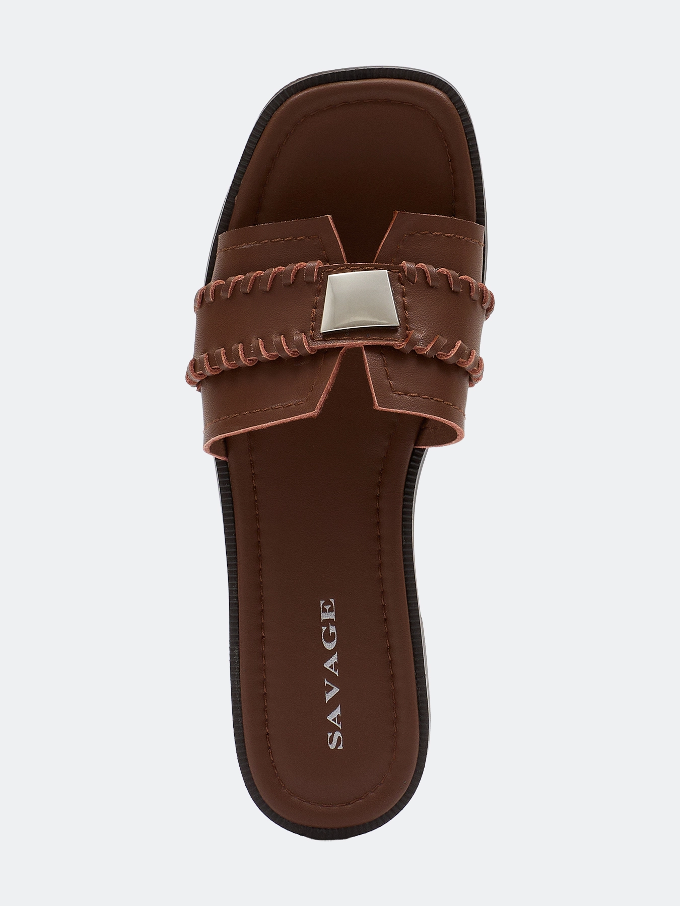 Сабо из натуральной кожи с декоративной металлической деталью. Квадратный мыс. Подошва из термопластичной резины.