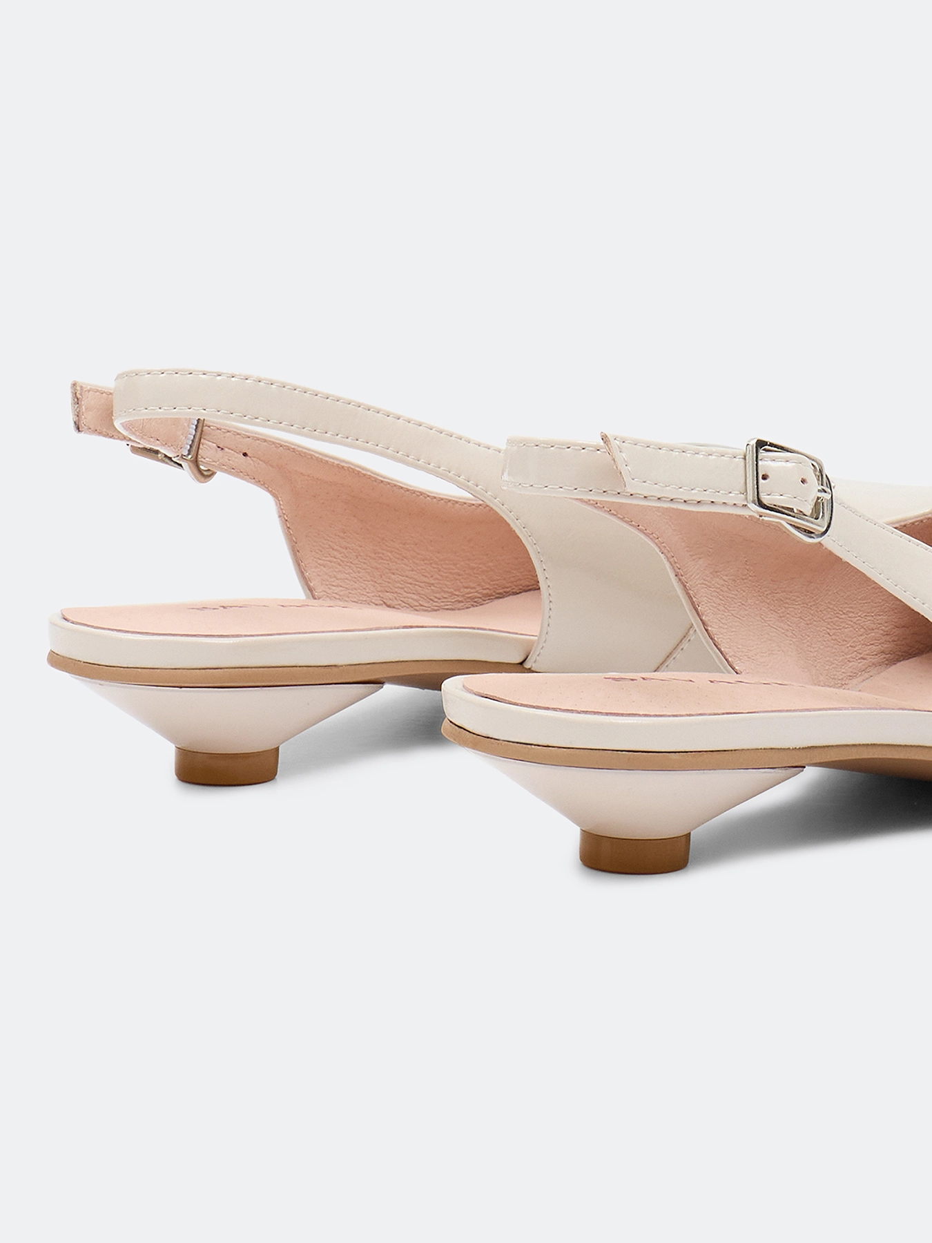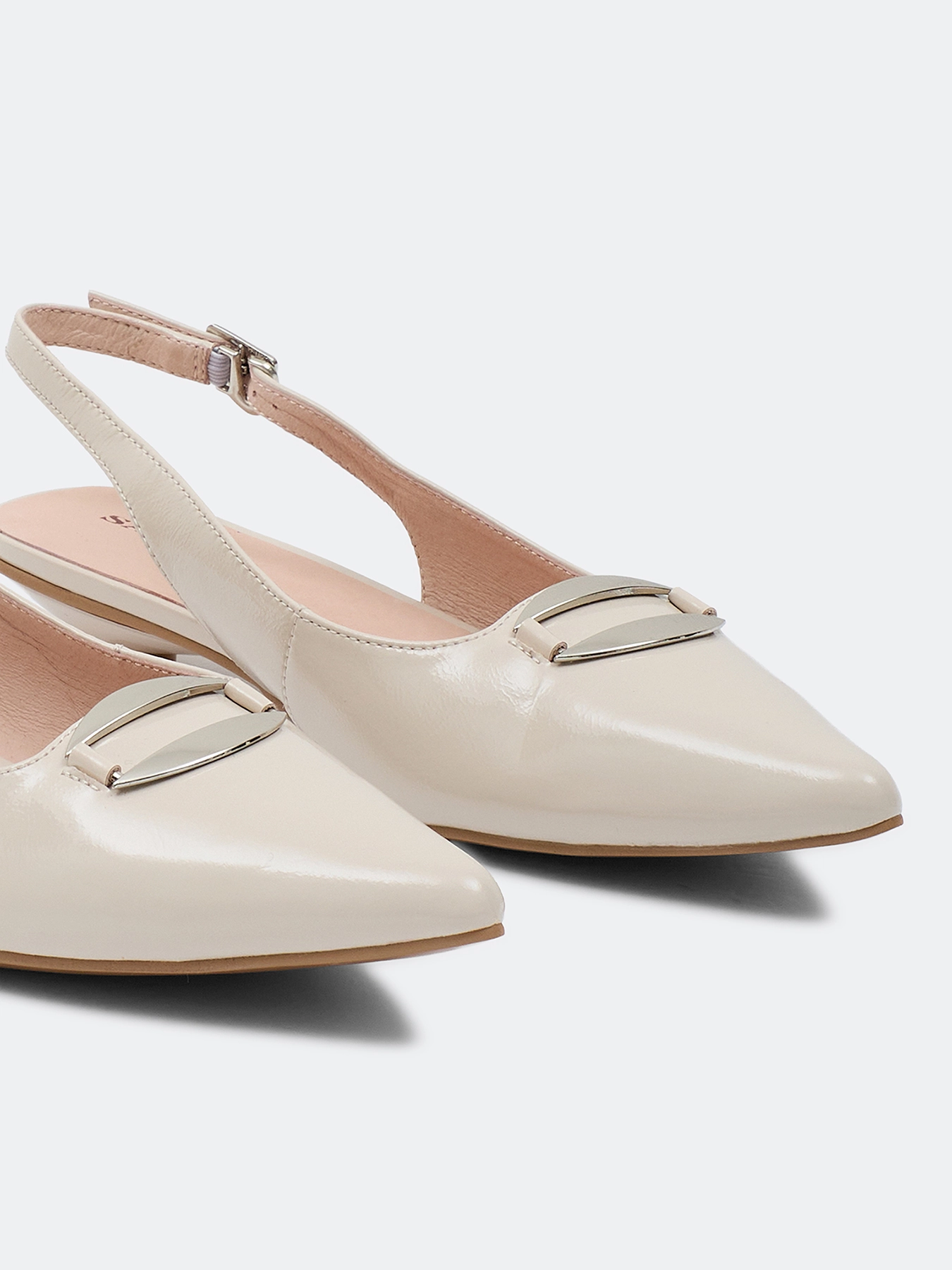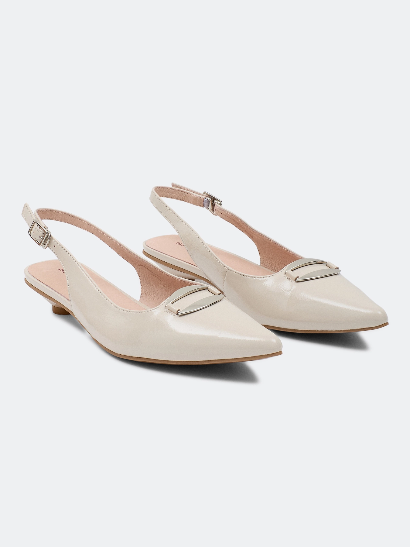 Туфли слингбэки из натуральной кожи бежевого цвета с декоративной пряжкой. Небольшой устойчивый каблук. Зауженный мыс. Фиксация на ремешок на пятке. Подкладка и стелька из натуральной кожи. Подошва из термопластичной резины.