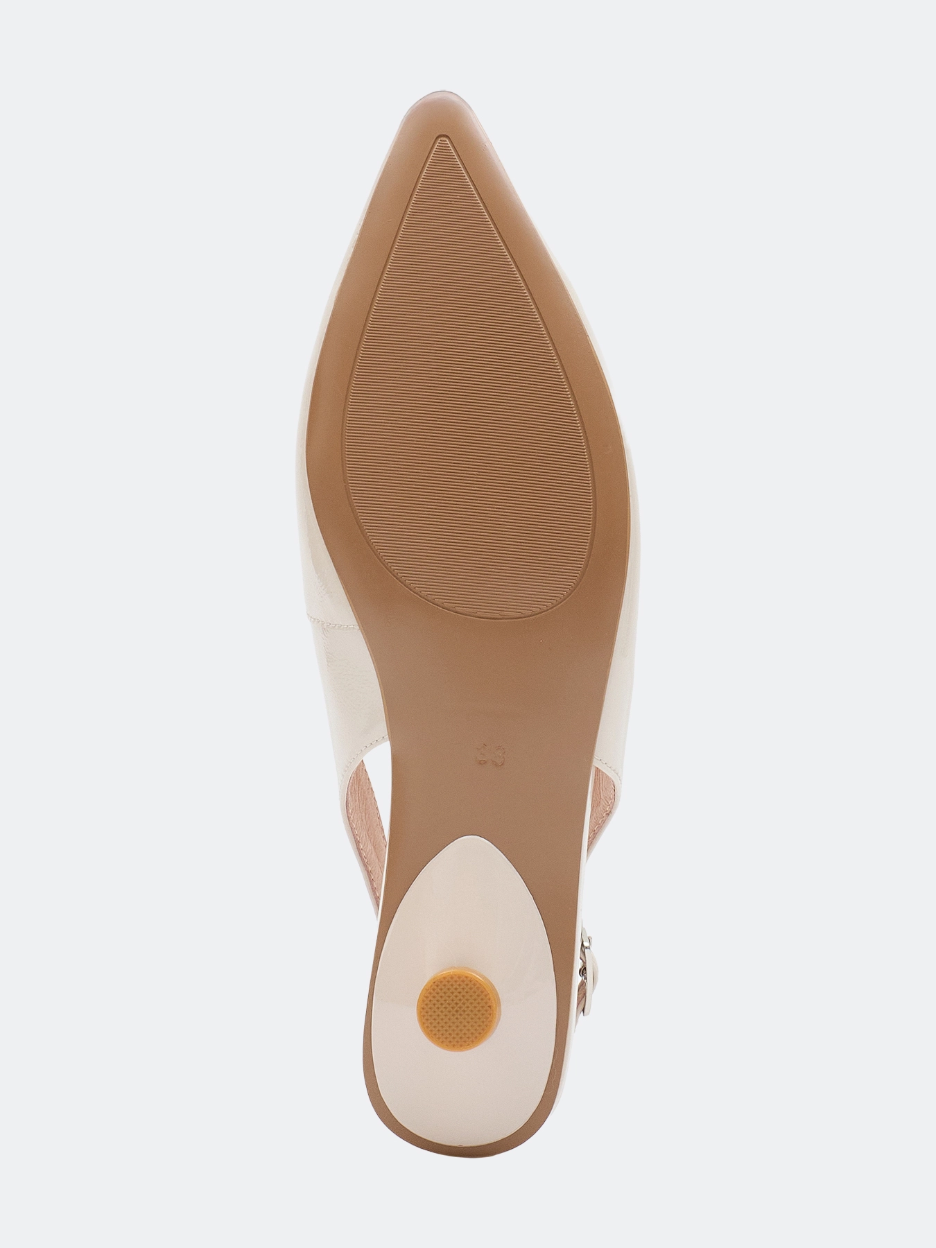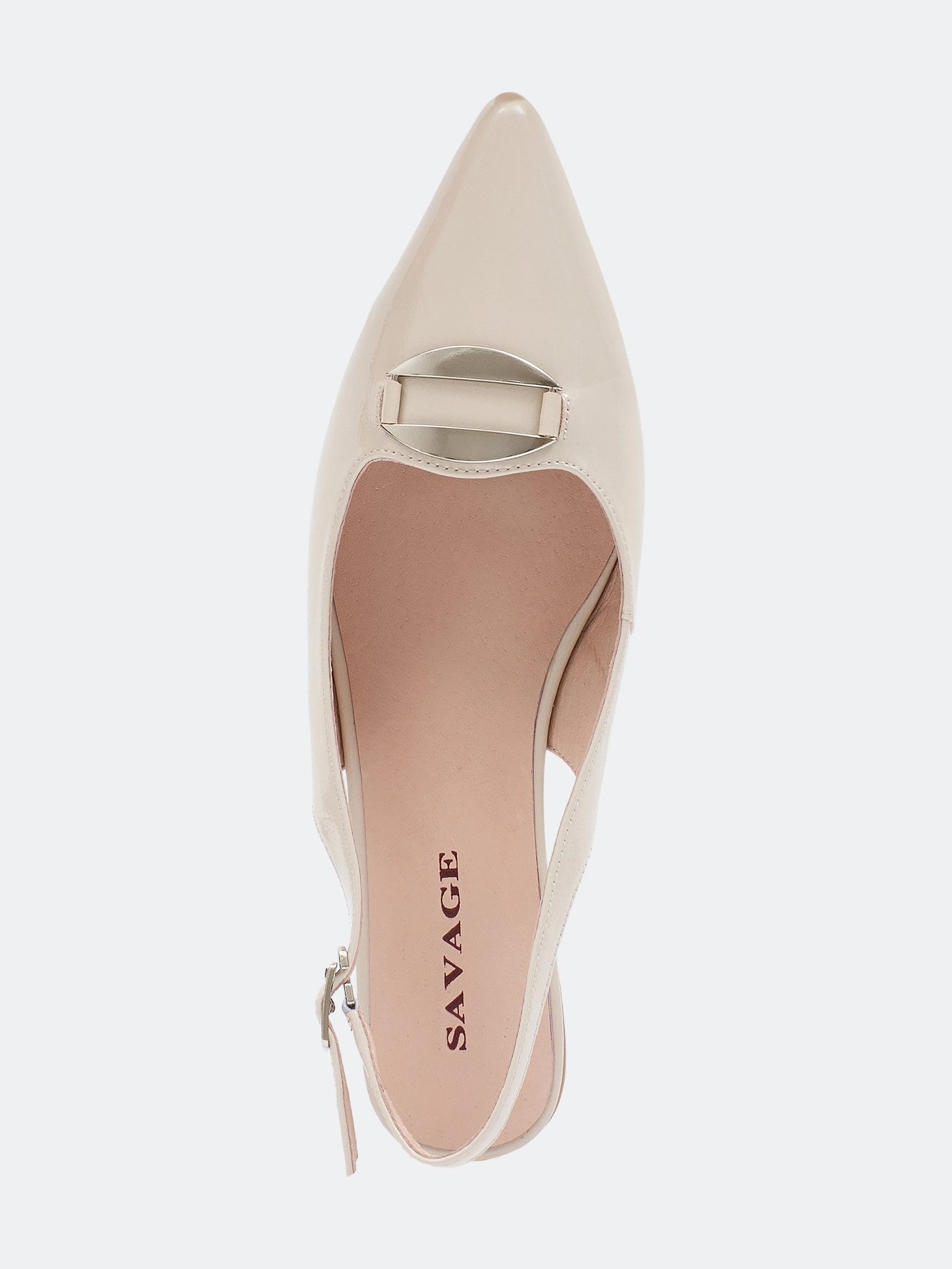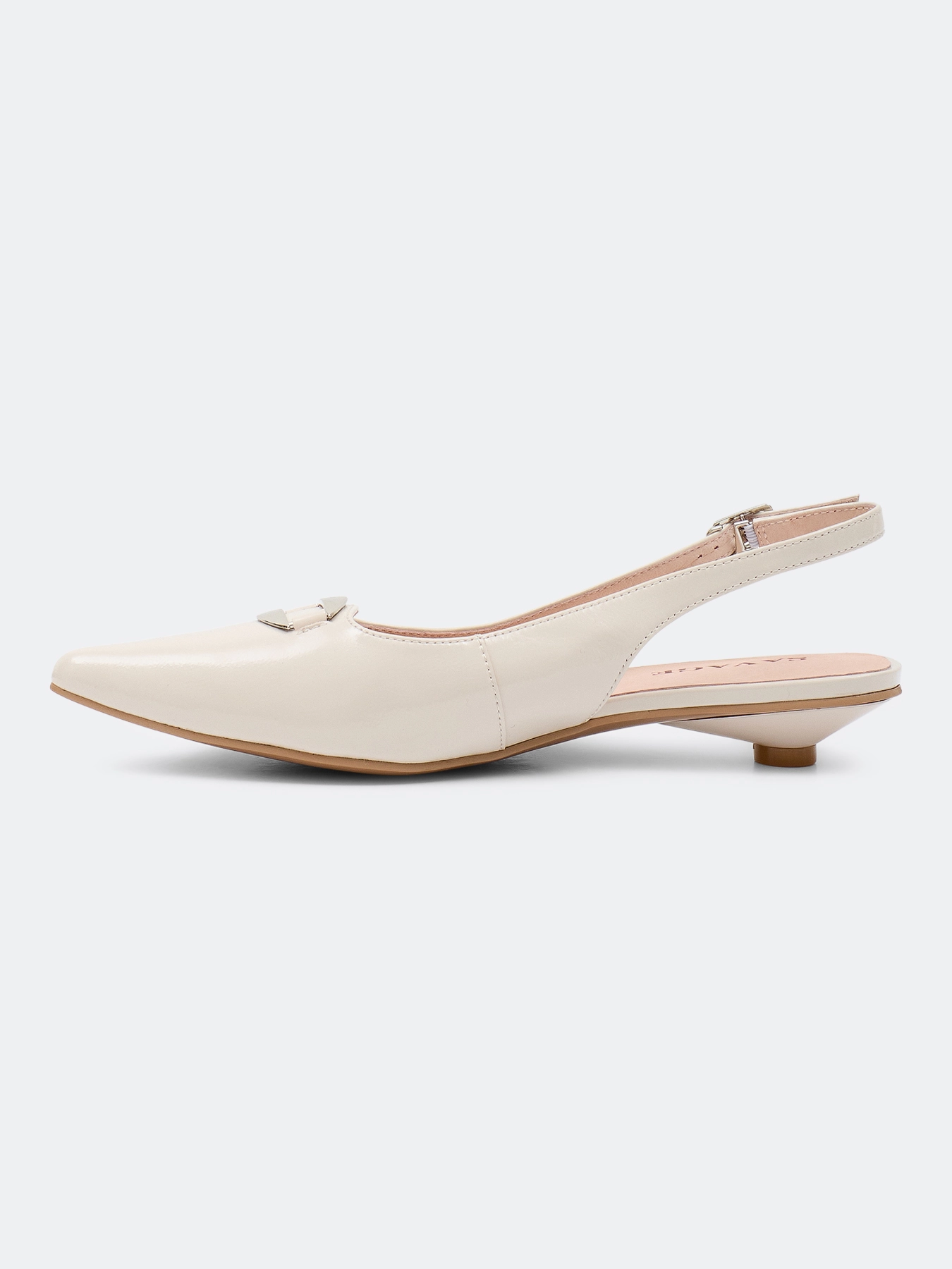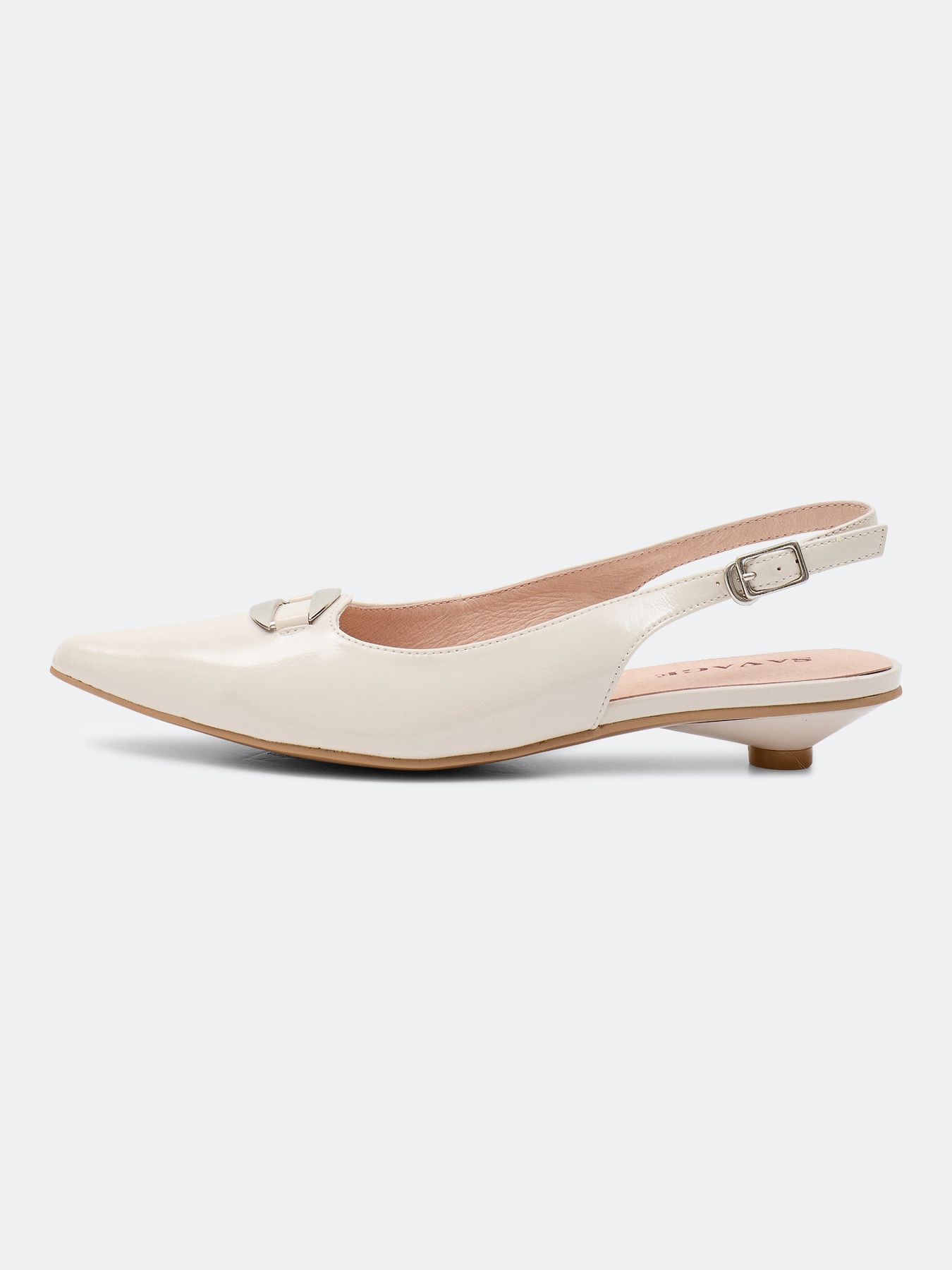 Туфли слингбэки из натуральной кожи бежевого цвета с декоративной пряжкой. Небольшой устойчивый каблук. Зауженный мыс. Фиксация на ремешок на пятке. Подкладка и стелька из натуральной кожи. Подошва из термопластичной резины.