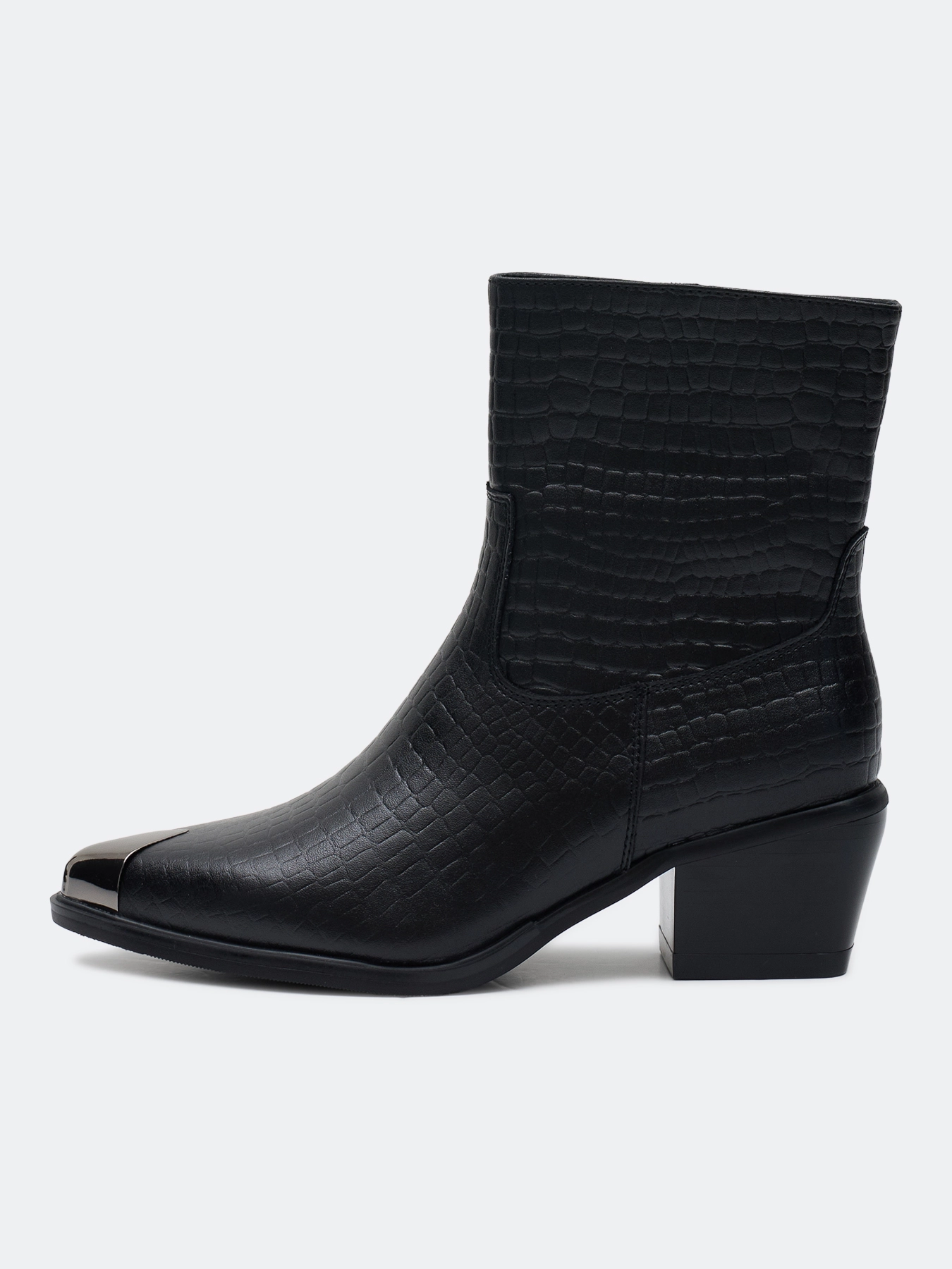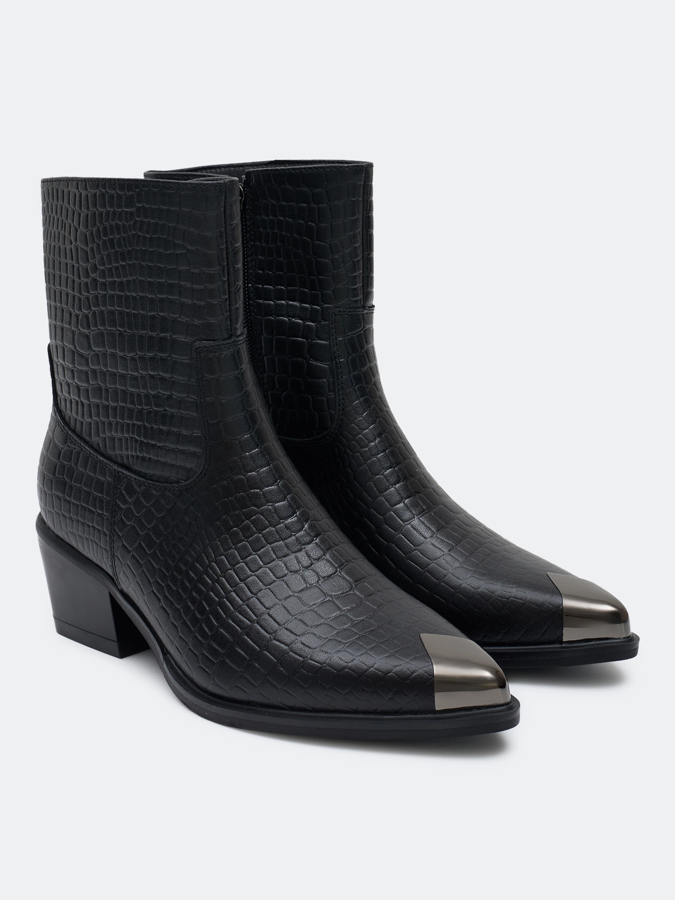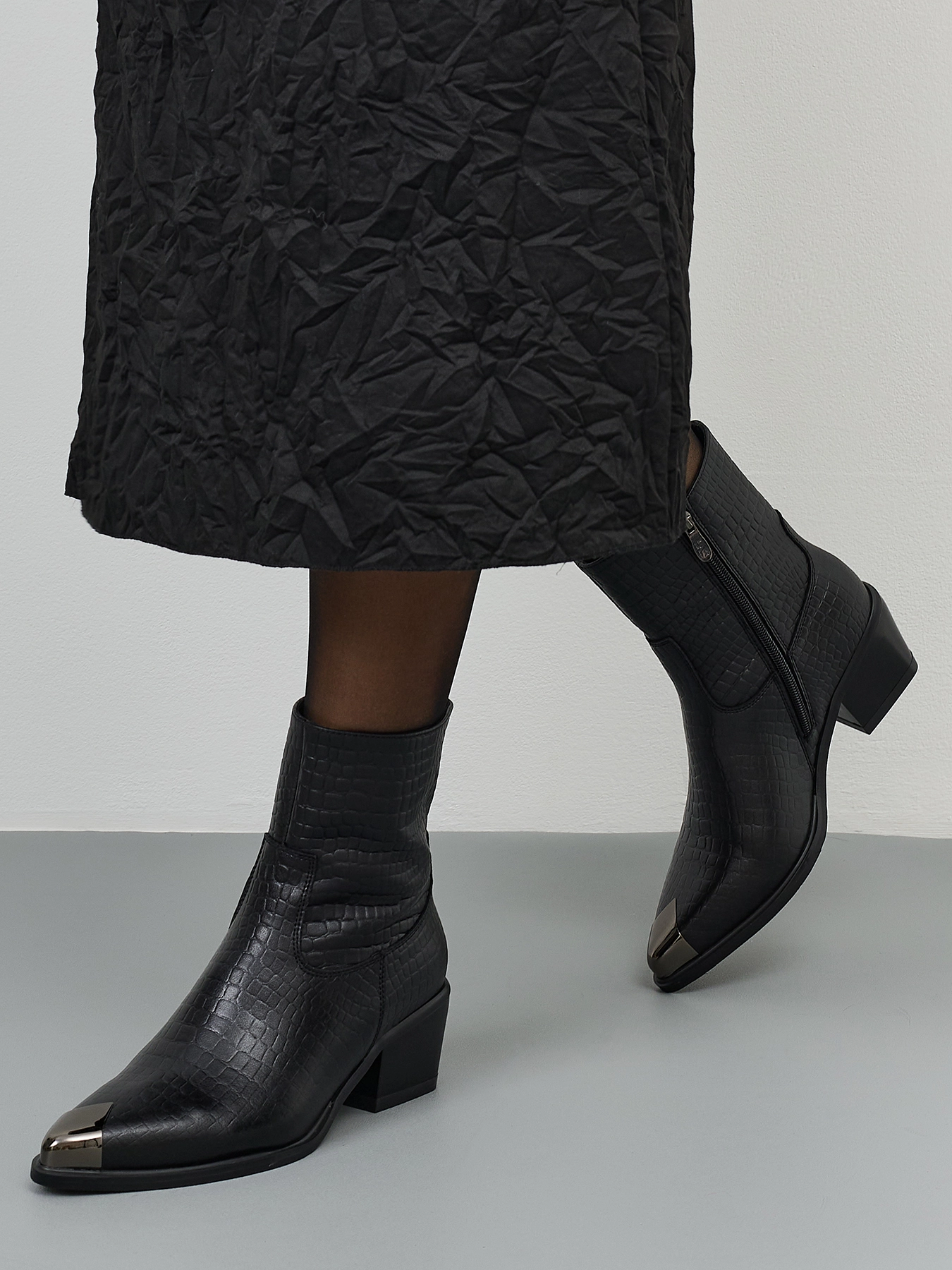Высокие ботинки из натуральной кожи с фактурной выделкой под "крокодила". Заостренный мыс с декоративной металлической деталью. Застежка на молнию с внутренней стороны. Тонкая подошва из термопластичной резины. Устойчивый каблук средней высоты и подошва из резины обеспечивают комфорт при ходьбе. Подкладка и стелька из теплого текстиля.