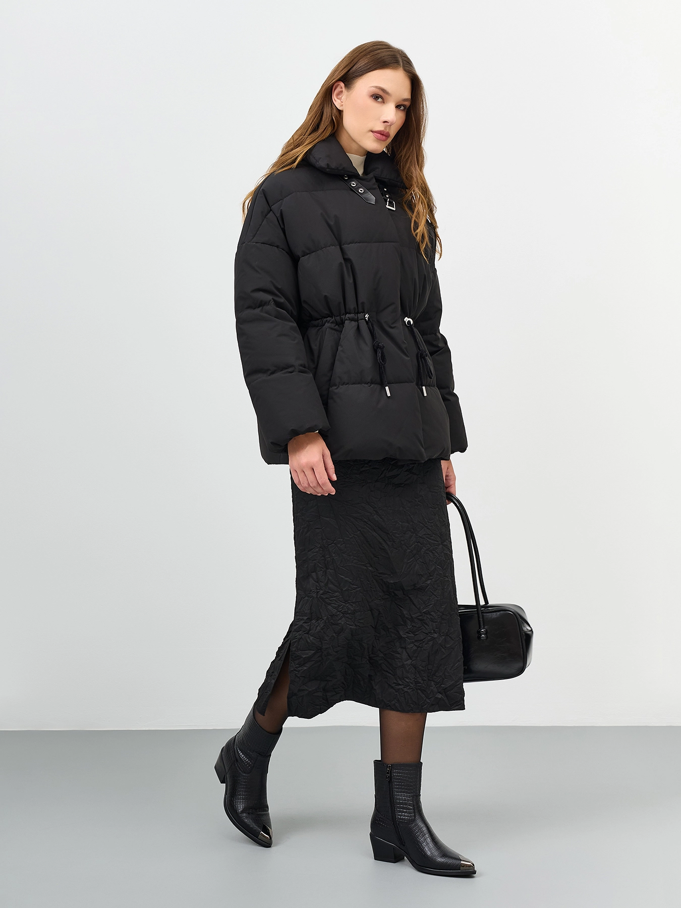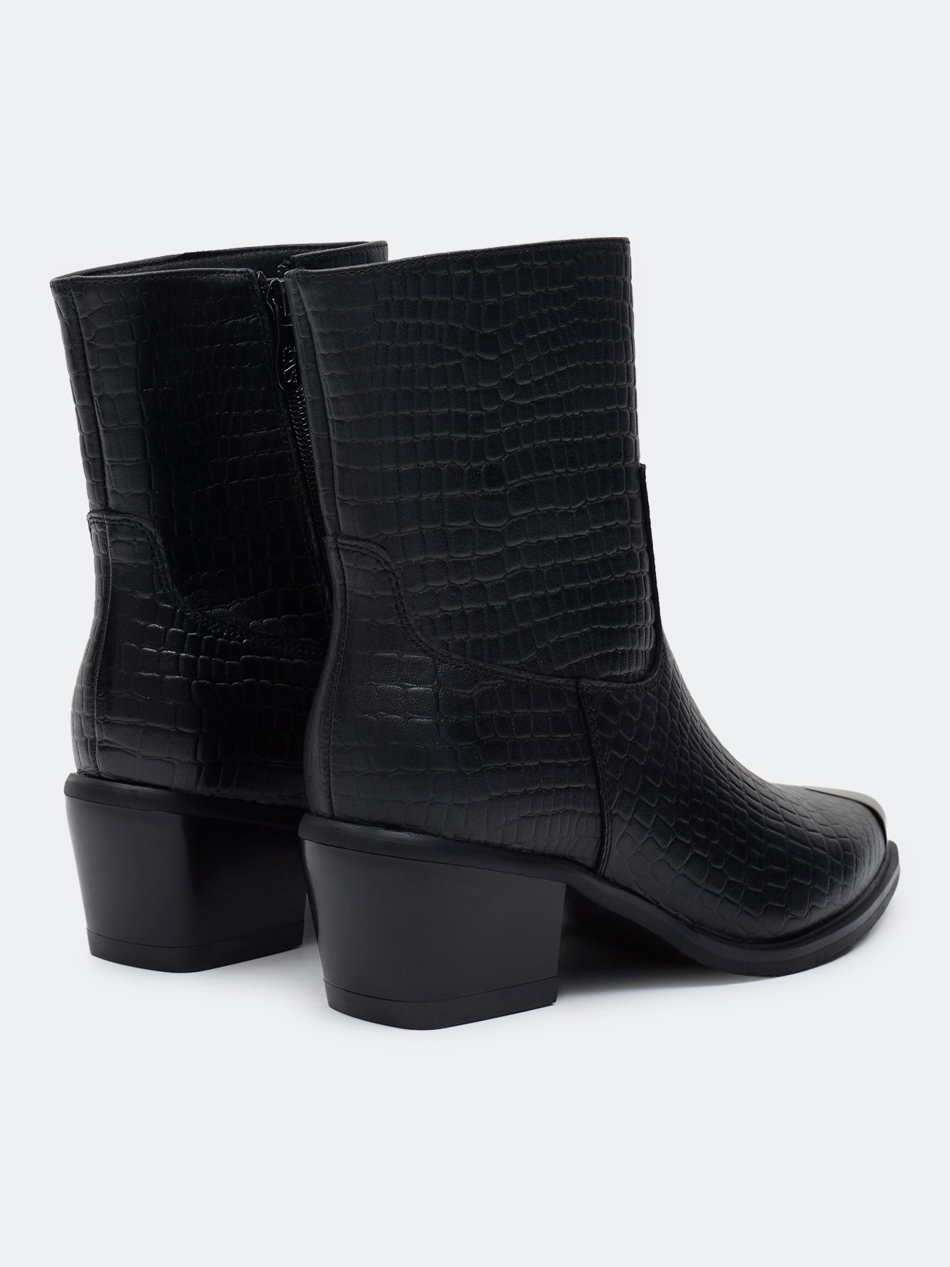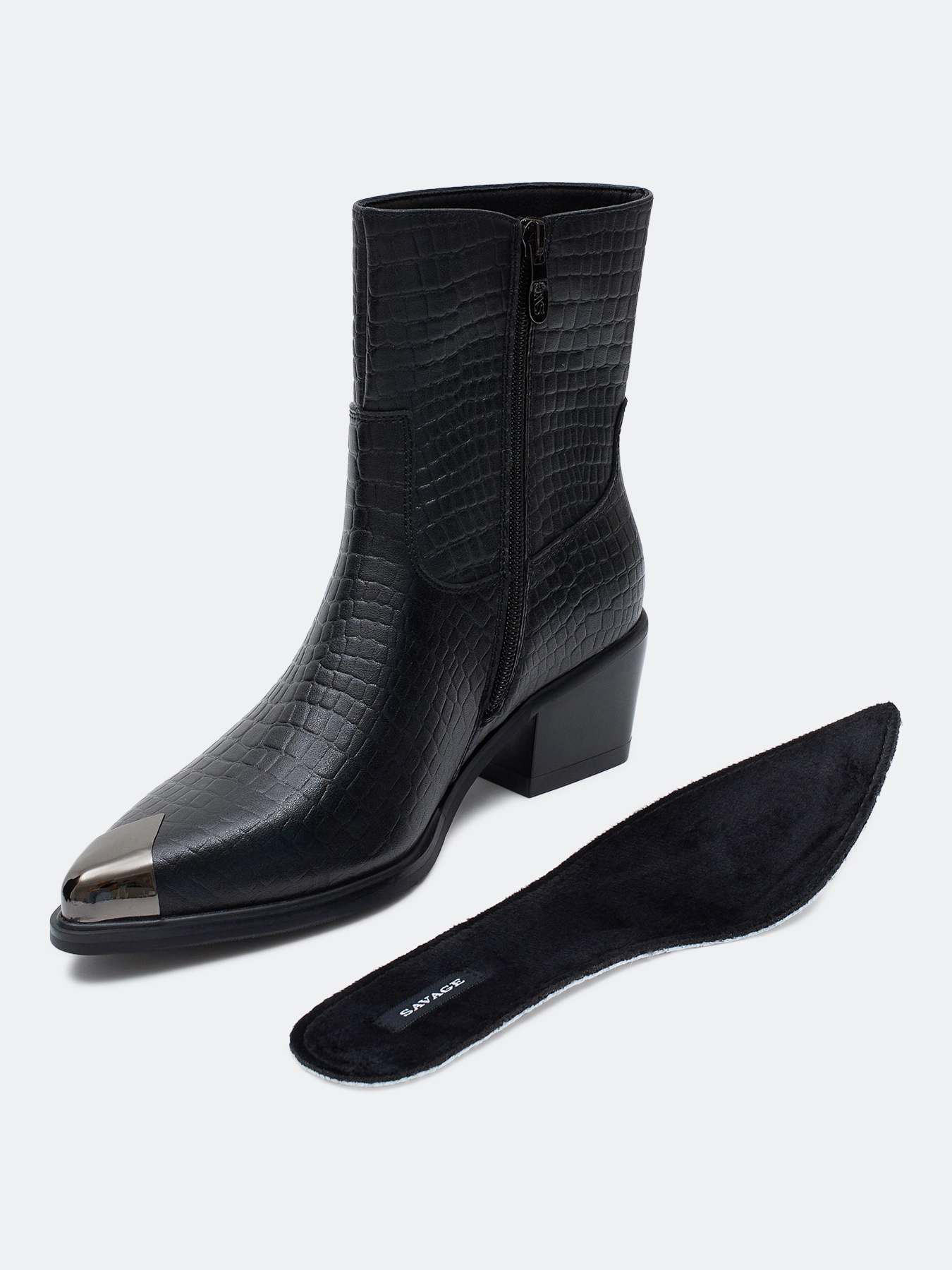 Высокие ботинки из натуральной кожи с фактурной выделкой под "крокодила". Заостренный мыс с декоративной металлической деталью. Застежка на молнию с внутренней стороны. Тонкая подошва из термопластичной резины. Устойчивый каблук средней высоты и подошва из резины обеспечивают комфорт при ходьбе. Подкладка и стелька из теплого текстиля.